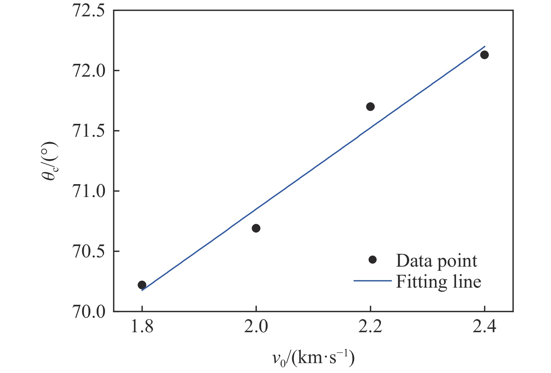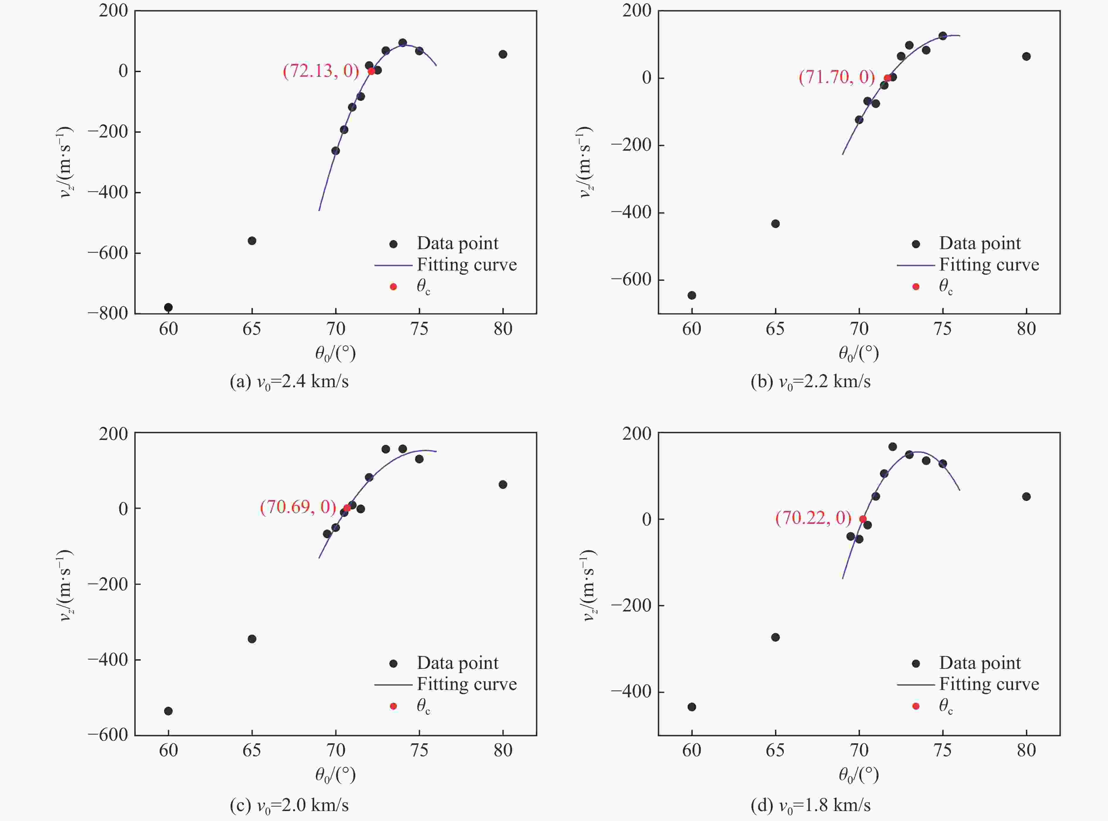 v0/(km·s−1) a/(km·s−1) b/(km·s−1) c/(km·s−1) R2 θc/(°) 2.4 −20.2 3001 − 111233 0.9817 72.13 2.2 −7.8 1179 − 44504 0.9497 71.70 2.0 −7.0 1059 − 39745 0.9093 70.69 1.8 −14.3 2105 − 77215 0.8971 70.22 -