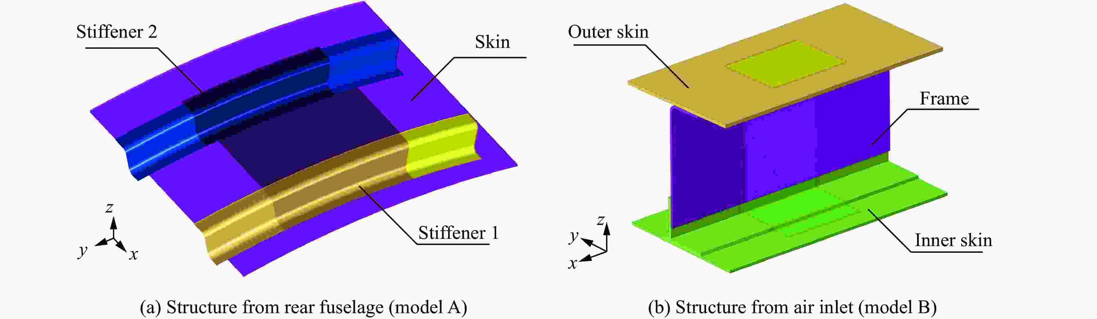 摘要: 针对飞机典型部位在遭到高速破片攻击后结构整体的战伤状态及破片的剩余行为开展数值模拟。应用LS-DYNA软件,结合有限单元方法(finite element method, FEM)和光滑粒子流体动力学(smoothed particle hydrodynamics, SPH)两者的优势,建立自适应的FEM-SPH耦合模拟方法,并构建2种飞机典型部位的计算模型,采用六面体网格局部细化方法实现了核心位置的精确模拟,并进行试验来验证数值模型;开展了一系列高速冲击战伤模拟,对比了不同工况下破片高速冲击结构后形成的碎片云和破口形貌,并对破片的剩余速度和质量进行分析,确定了破片在结构蒙皮上的临界跳飞角。结果表明:自适应FEM-SPH耦合算法的计算结果与试验结果吻合良好,能够对破片高速冲击战伤进行有效准确模拟;碎片云分布形状随破片速度增加变得狭长,冲击角度会改变碎片云和结构破口形状朝向;碎片云高度和扩散速度随破片速度或角度的变化趋势基本一致并都呈线性关系;破片的速度减少量不随初始速度变化,质量减少量则与冲击速度正相关,两者与冲击角度都负相关;破片临界跳飞角与冲击速度大小基本呈线性关系。