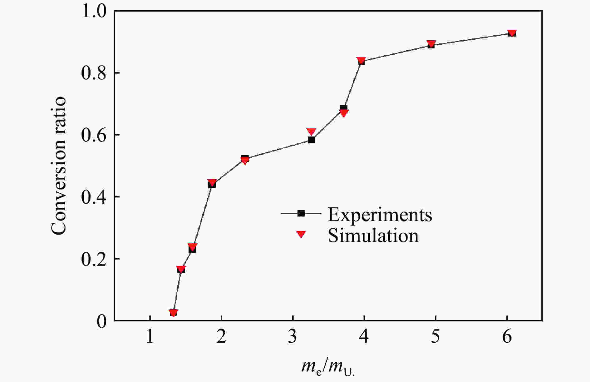 实验编号 实验结果 计算结果 绝对误差 实验编号 试验结果 计算结果 绝对误差 1 2.75 2.80 −0.05 6 58.38 61.30 −2.92 2 16.68 16.92 −0.24 7 68.48 67.26 1.22 3 23.03 24.12 −1.09 8 83.75 84.33 −0.58 4 43.87 45.03 −1.16 9 88.91 89.64 −0.73 5 52.29 51.91 0.38 10 92.80 92.85 −0.05 表 4 不同实验工况下铀气溶胶的质量和转化率