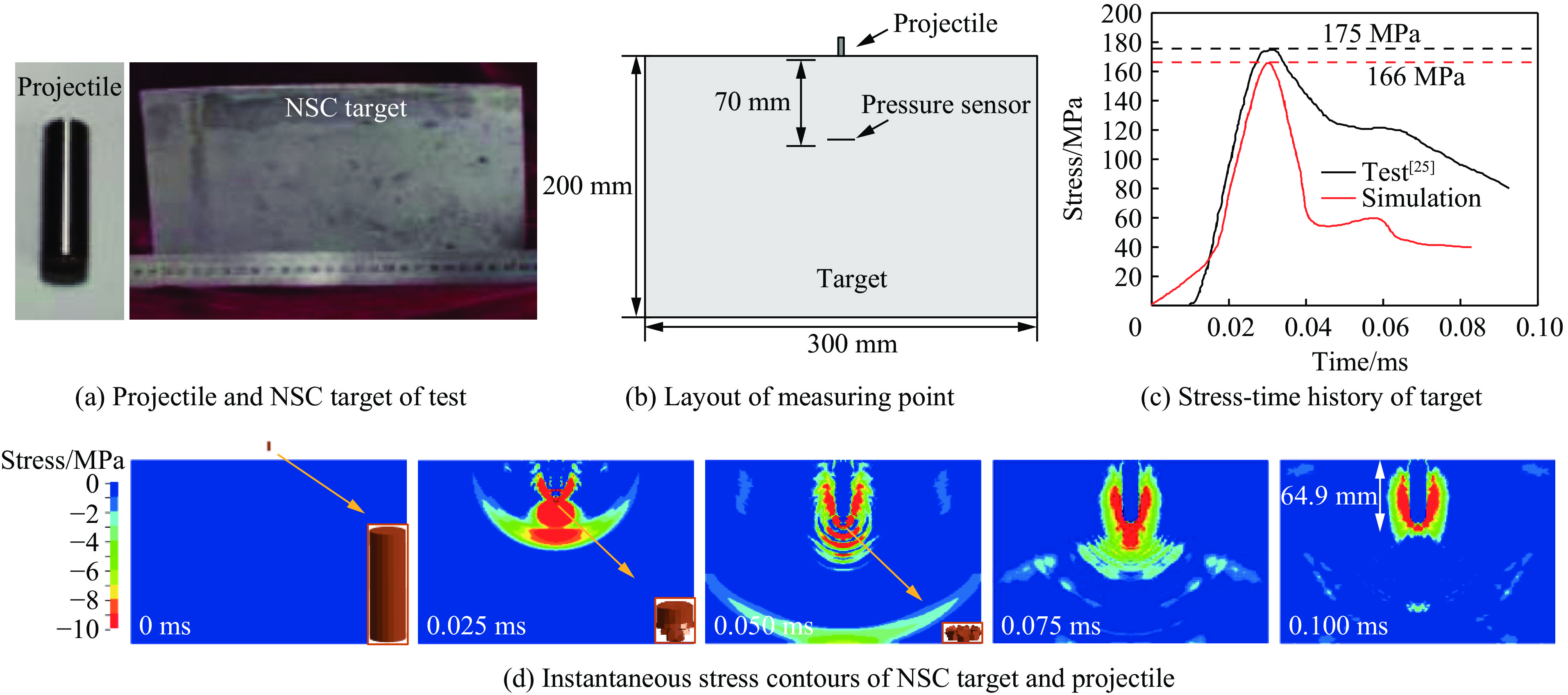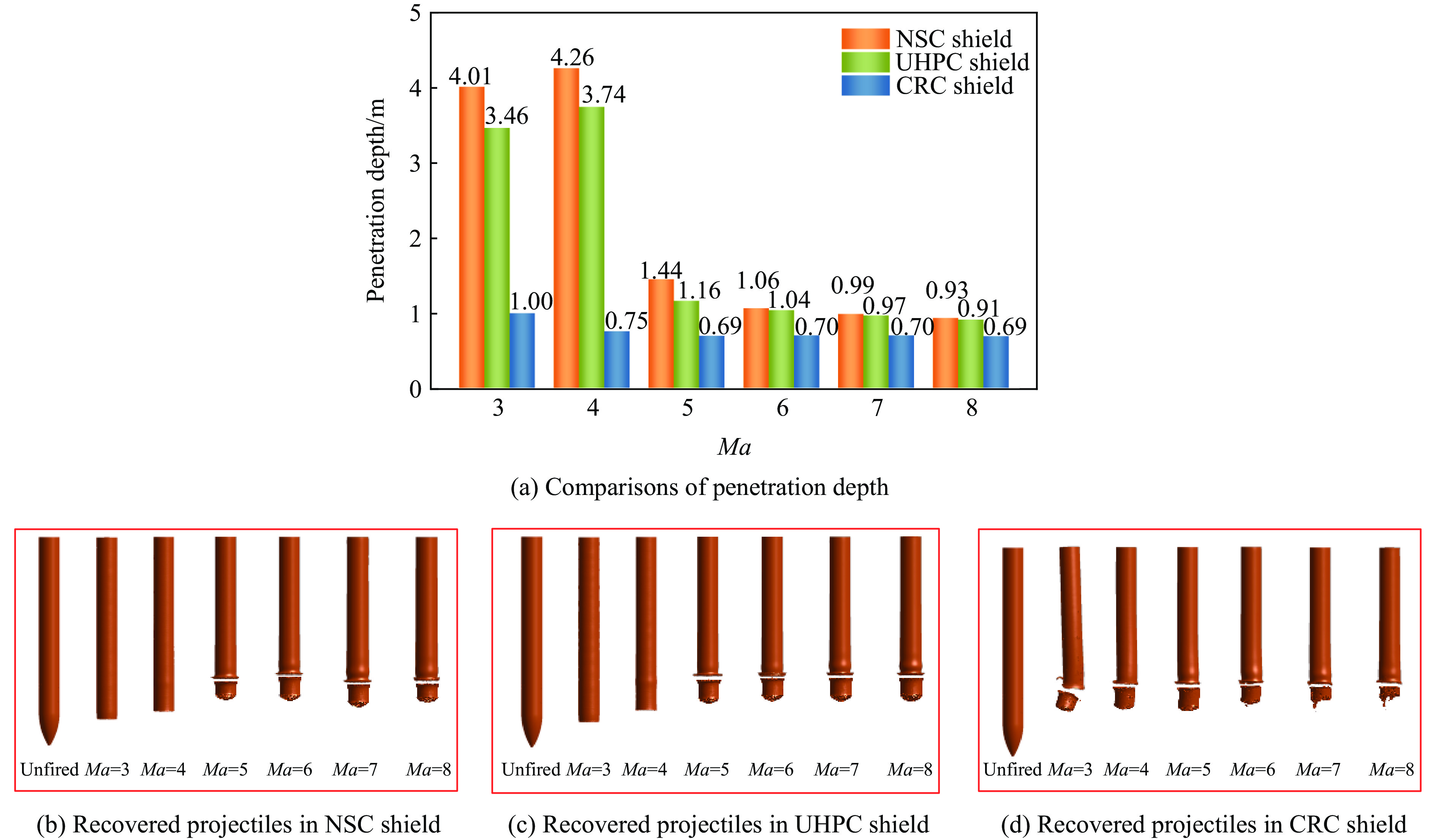 随着超高速武器的飞速发展,开展超高速武器战斗部侵彻混凝土遮弹层效能分析对于新建和已建防护结构的设计与安全评估具有重要意义。针对超高速武器战斗部打击普通强度混凝土(normal strength concrete, NSC)、超高性能混凝土(ultra-high performance concrete, UHPC)和刚玉块石混凝土(corundum rubble concrete, CRC)3种典型遮弹层问题,首先,通过对比钢/钨合金弹体侵彻3种靶体试验和数值仿真结果,验证有限元仿真分析方法中数值算法、网格尺寸和材料模型参数取值等的可靠性;然后,基于侵彻深度和弹体残余长度等效的网格过渡策略,建立了适用于原型工况分析的数值仿真分析方法;最后,在Ma为3~8工况下,开展了对AGM-183A超高速武器战斗部侵彻3种遮弹层的数值模拟。结果表明:AGM-183A超高速武器战斗部分别以Ma=4、Ma=4和Ma=3侵彻NSC、UHPC和CRC遮弹层的极限侵彻深度分别为4.26、3.74和1.00 m,侵彻速度继续增大时,弹体弧柱交接处因局部应力集中发生断裂等结构失稳现象,导致侵彻效能下降。与常规声速钻地武器战斗部SDB、WDU-43/B和BLU-109/B侵彻爆炸破坏深度相比,AGM-183A侵彻NSC遮弹层的深度分别达到3.2、1.6和1.8倍,侵彻UHPC遮弹层的深度分别达到4.7、2.1和2.2倍,侵彻CRC遮弹层的深度分别达到3.4、1.3和1.5倍。3种遮弹层抗AGM-183A超高速武器战斗部侵彻的建议设计厚度分别为8.01、7.03和1.88 m,UHPC相对NSC遮弹层的抗超高速侵彻能力提升不明显,CRC遮弹层可以有效兼顾抵抗常规声速和超高速战斗部打击,建议设计时优先采用。