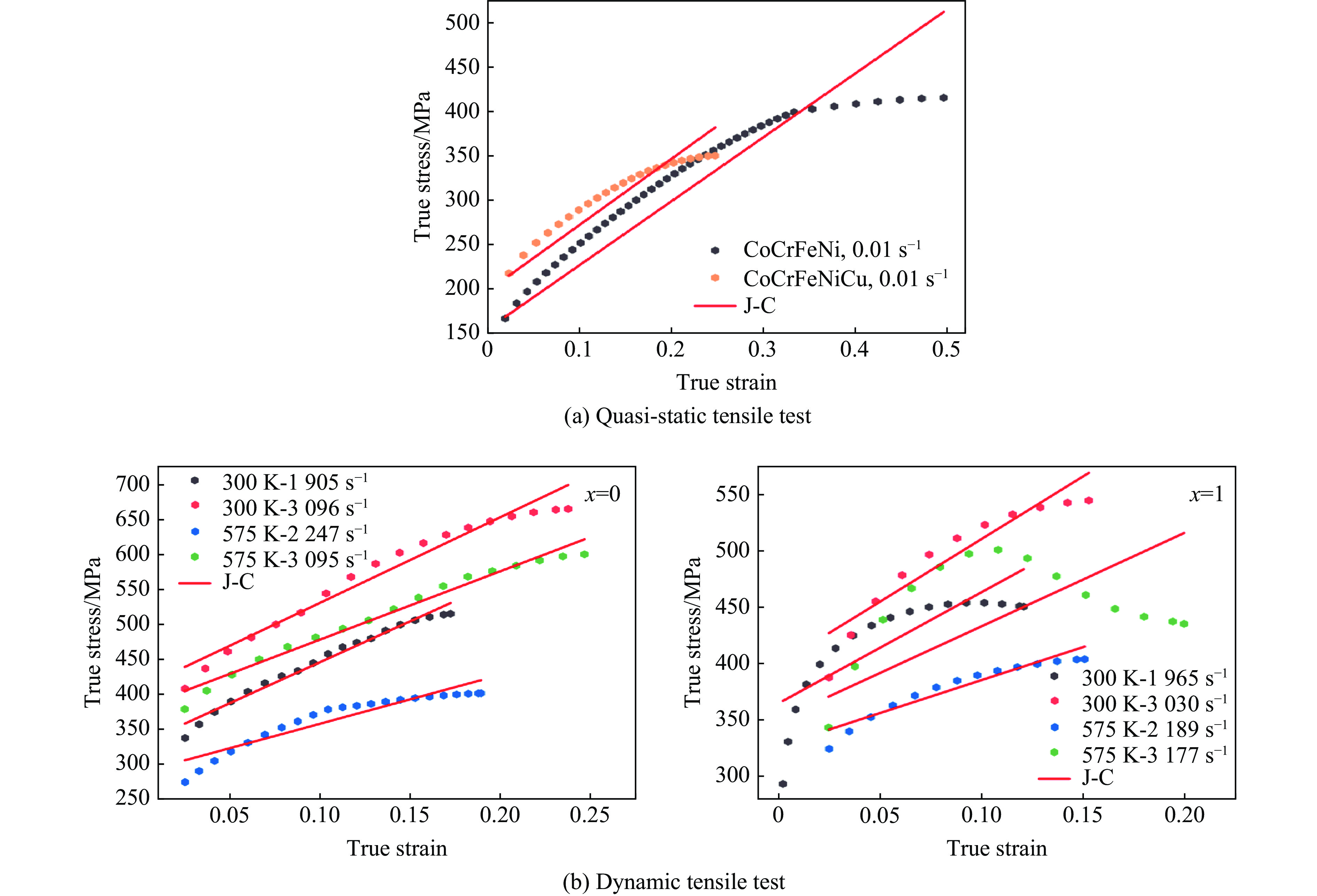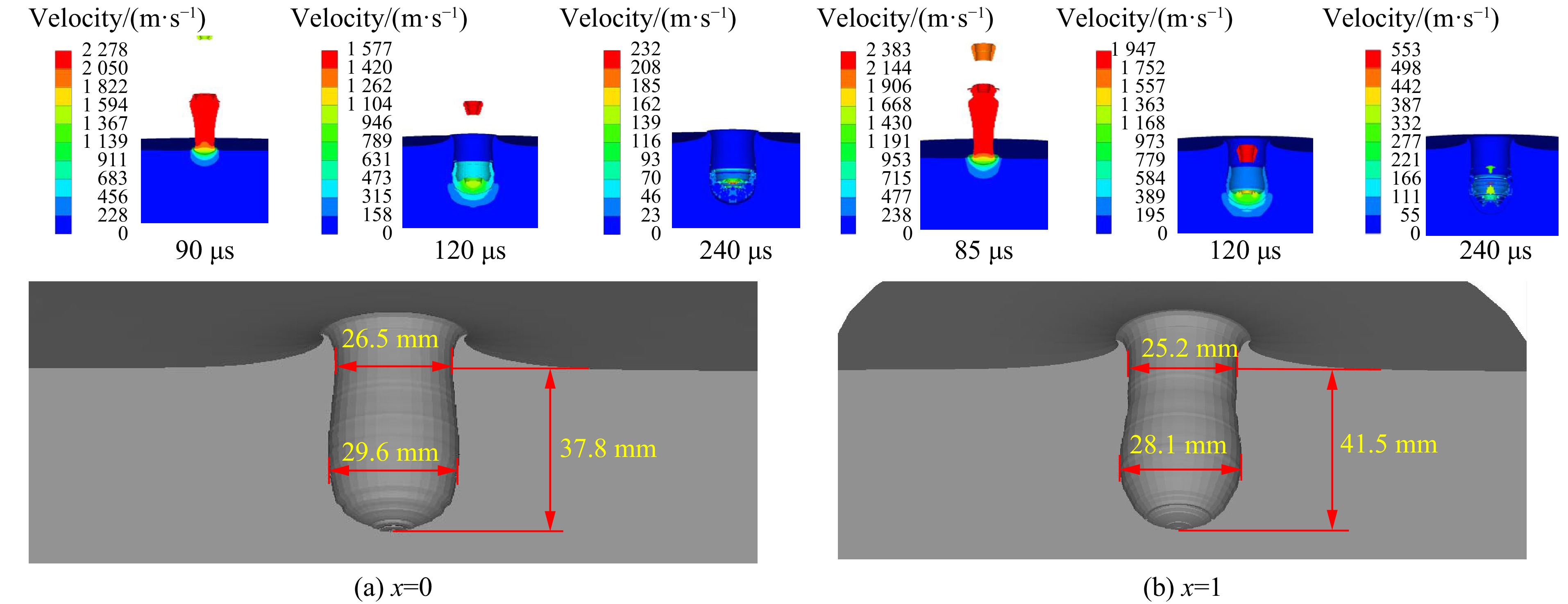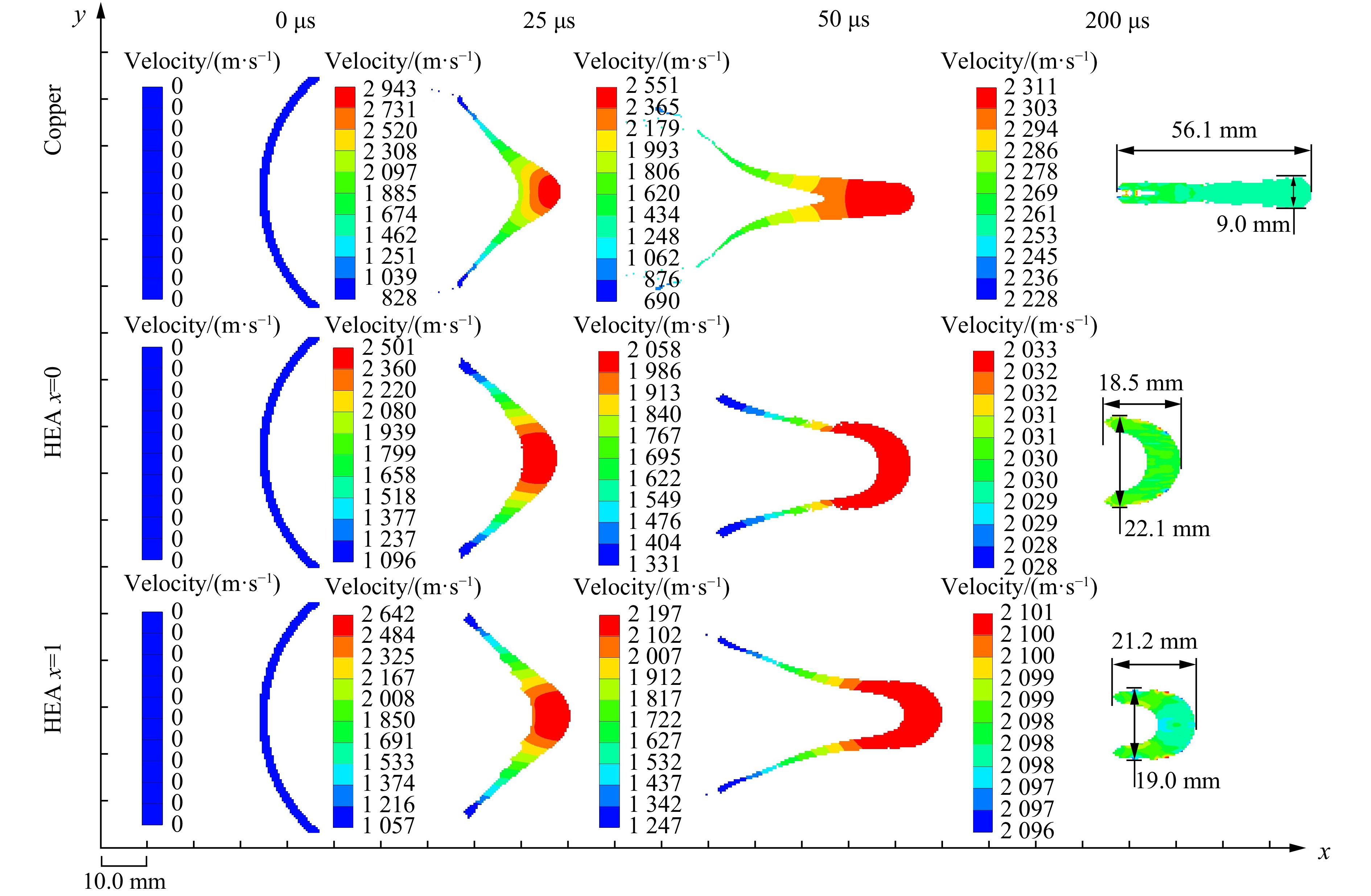 探究了CoCrFeNiCux高熵合金作为药型罩材料在爆炸成型弹丸领域中的应用潜力,旨在通过优化药型罩结构提升爆炸成型弹丸的成形性能和毁伤效能。通过准静态和动态拉伸试验研究了CoCrFeNiCux高熵合金的力学性能,并拟合了Johnson-Cook本构模型参数。结果表明,2种高熵合金(x=0, 1)均表现出优异的塑性、延展性及正应变率敏感性,动态屈服强度随应变率升高显著提升。基于AUTODYN软件对比分析了紫铜与高熵合金药型罩的成形规律,发现高熵合金因强度高导致初始结构成形困难,弹丸尾部闭合不良。通过对药型罩进行均匀变壁厚优化,使形成的爆炸成型弹丸长径比分别提升至2.0(x=0)和2.5(x=1),速度分别达到