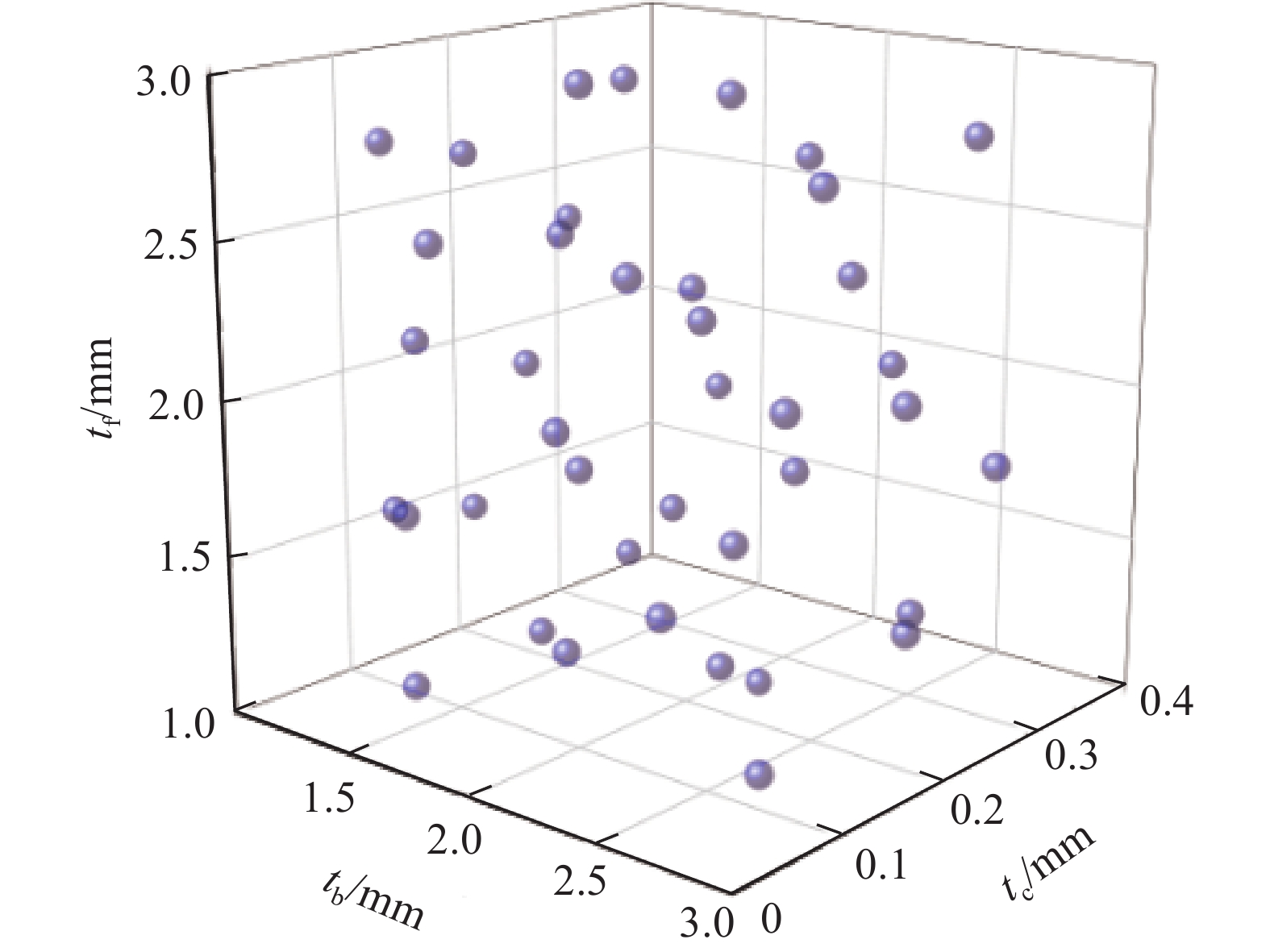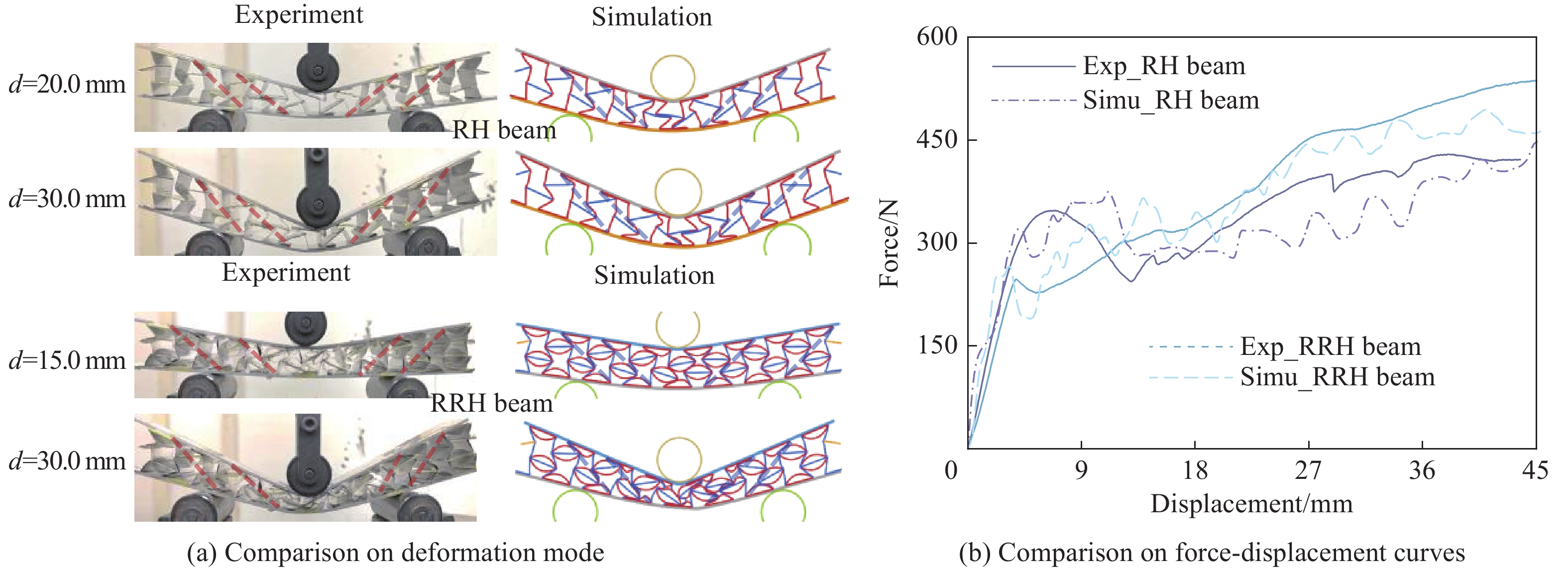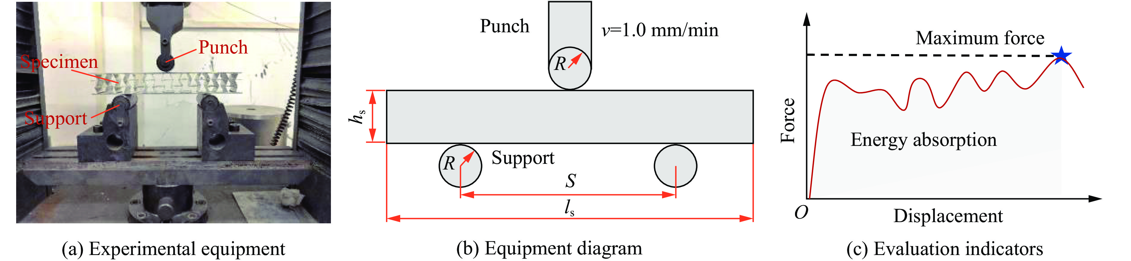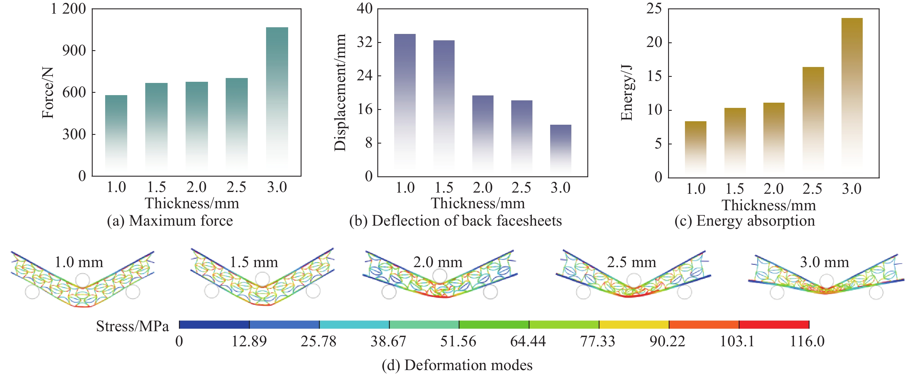 内凹蜂窝的悬链线增强方法通过同步改善中空结构提升承载、增强负泊松比效应、改善变形模式、利用悬链线结构高承载实现耐撞性的显著提升,在此基础上提出增强内凹蜂窝夹层梁。采用“冲压+粘接”方法分别制造传统、增强内凹蜂窝夹层梁金属样件开展三点弯曲实验,结果显示:悬链线结构通过抑制传统内凹蜂窝侧胞壁绕节点的旋转变形将其初始塑性变形后承载力的下降比例由29.3%减小至6.6%。相较于传统内凹蜂窝夹层梁,等相对密度增强内凹蜂窝夹层梁的最大承载力、能量吸收分别提高26.7%、8.9%。开展参数化研究确定面板、芯层壁厚对夹层梁三点弯曲力学行为均具有显著影响。基于参数化研究结果开展以面板、芯层壁厚为变量的夹层梁抗冲击性能多目标优化,相较于夹层梁初始结构,优化后夹层梁最大承载力和能量吸收分别提高64.9%和46.9%。与面内、面外传统蜂窝夹层梁分别进行等壁厚、等质量下的抗冲击性能对比,证明提出增强内凹蜂窝夹层梁更优异的吸能防护性能。研究结果可为传统蜂窝夹层结构的强化设计提供有益指导。