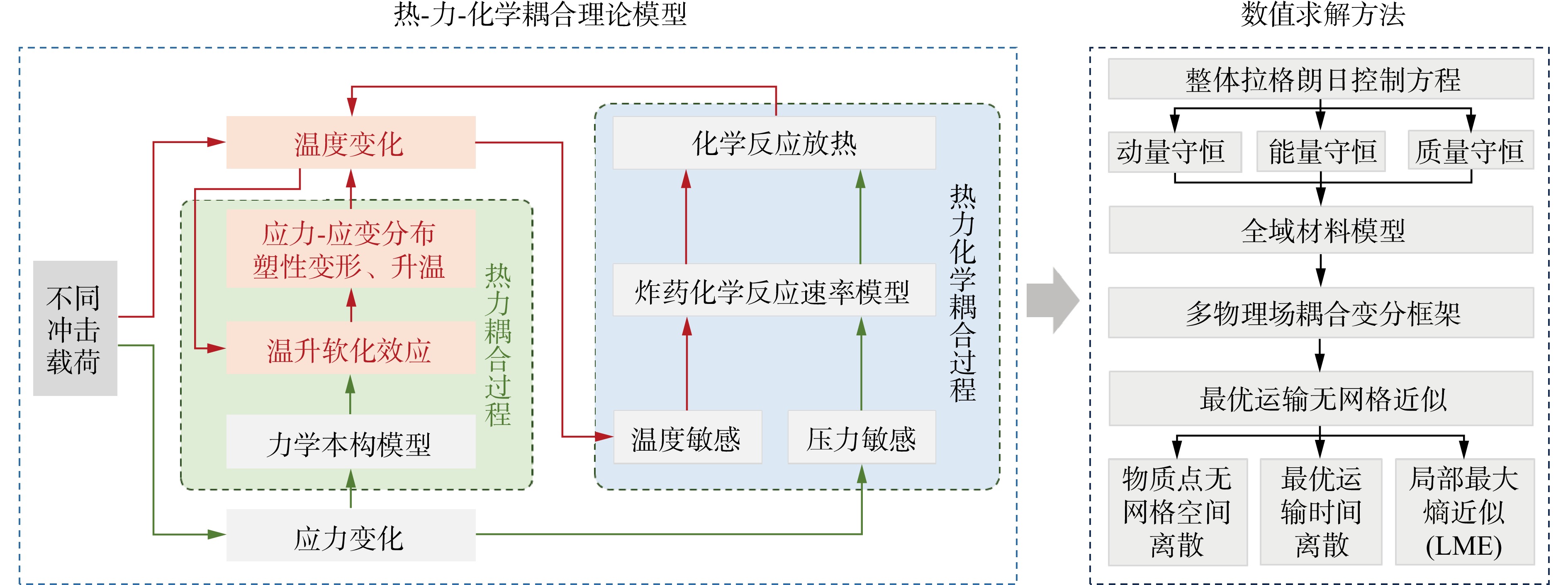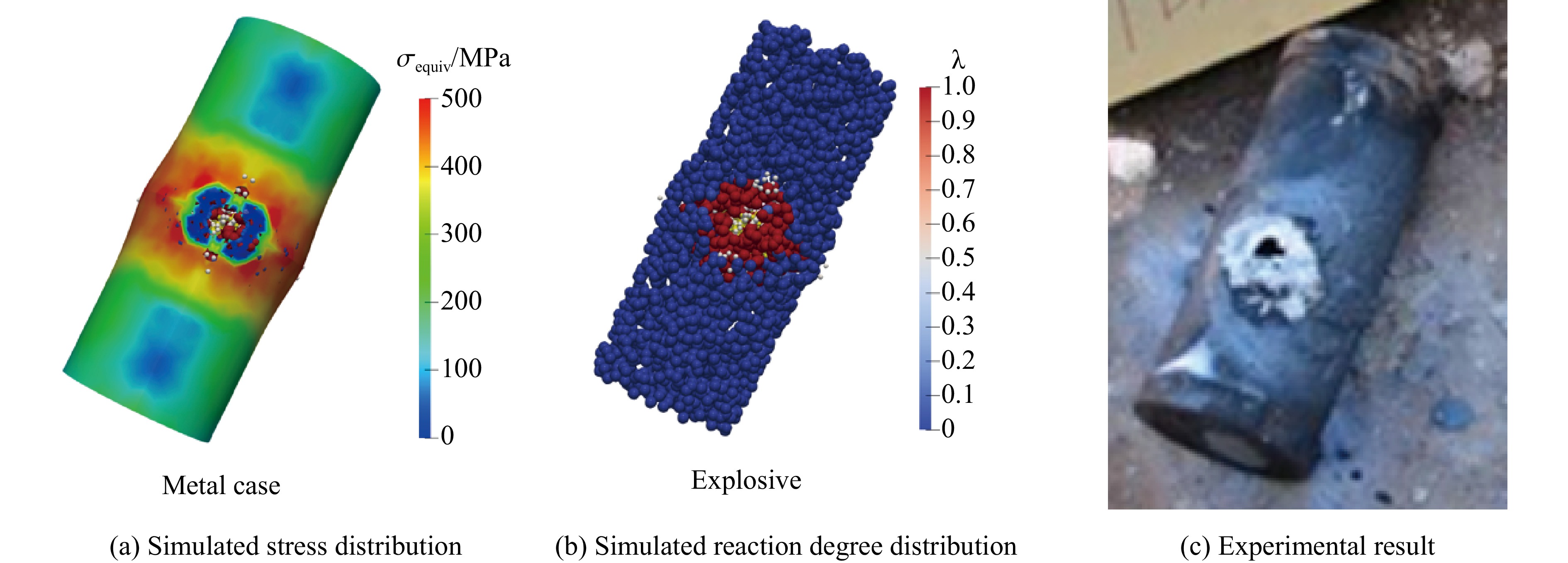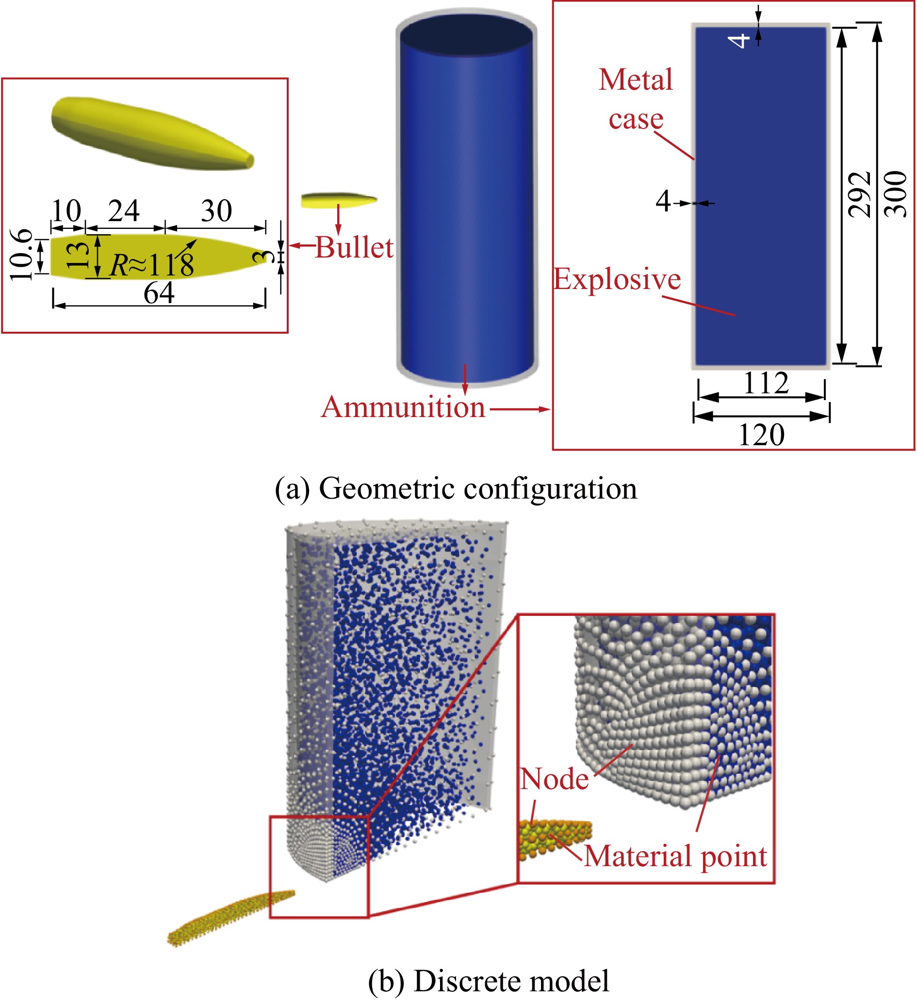 基于热最优输运无网格(hot optimal transportation meshfree, HOTM)方法,提出了能够准确预测弹药在冲击载荷下响应特性的无网格数值仿真方法,建立了炸药在冲击载荷下的高精度热-力-化学耦合模型,综合考虑了炸药起爆过程中的温度效应和压力效应,将炸药起爆的Arrhenius热-化学反应耦合模型和局部高压引发的Lee-Tarver压力三项式点火模型有机耦合,实现了对不同冲击速度下炸药不同起爆机制的准确模拟,从而预测弹药在遭受冲击载荷过程中的高速接触、金属外壳大塑性变形、材料断裂、热传导、炸药起爆、化学反应产物膨胀做功等复杂的物理现象。以子弹撞击弹药(850 m/s)和破片撞击弹药(