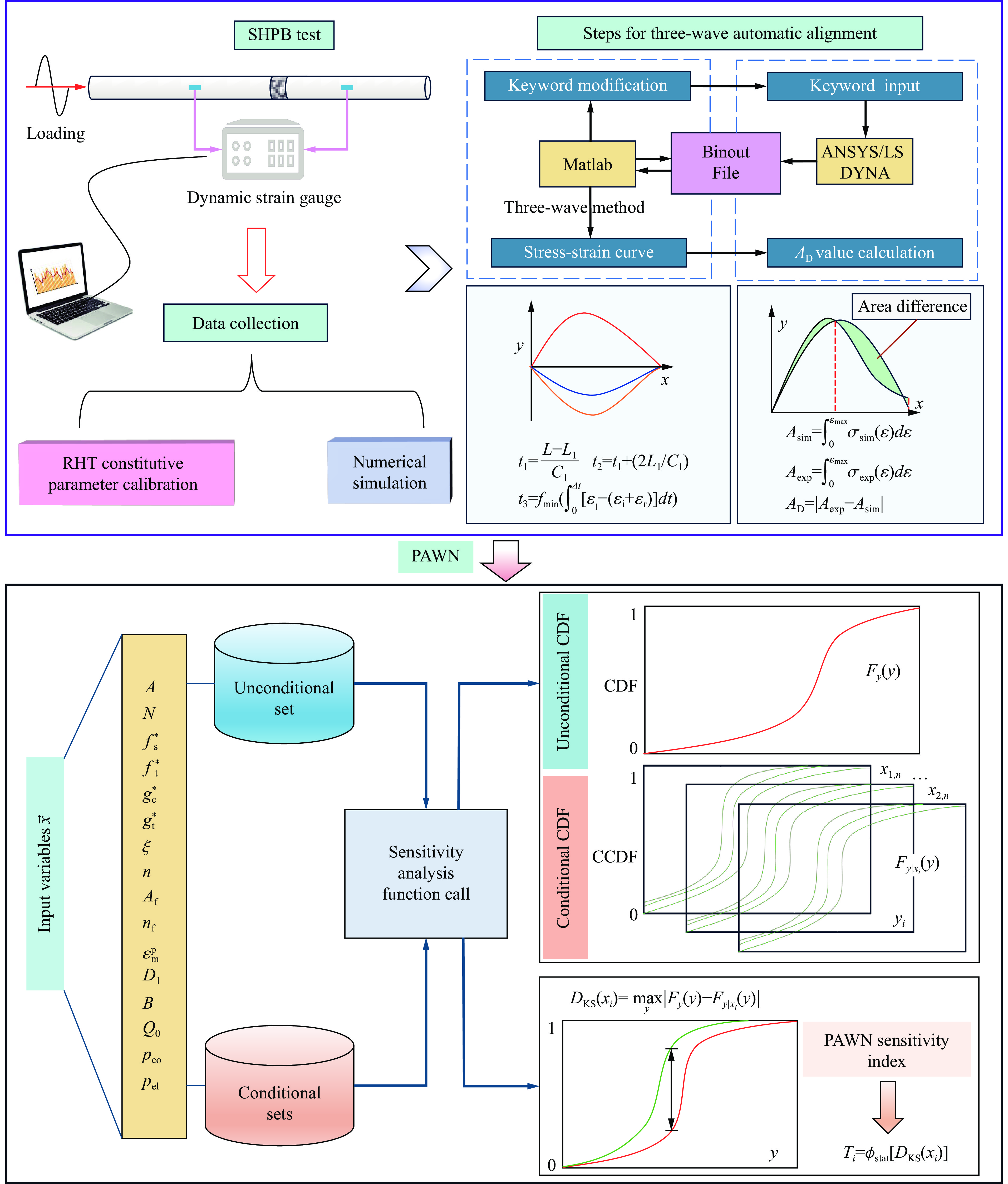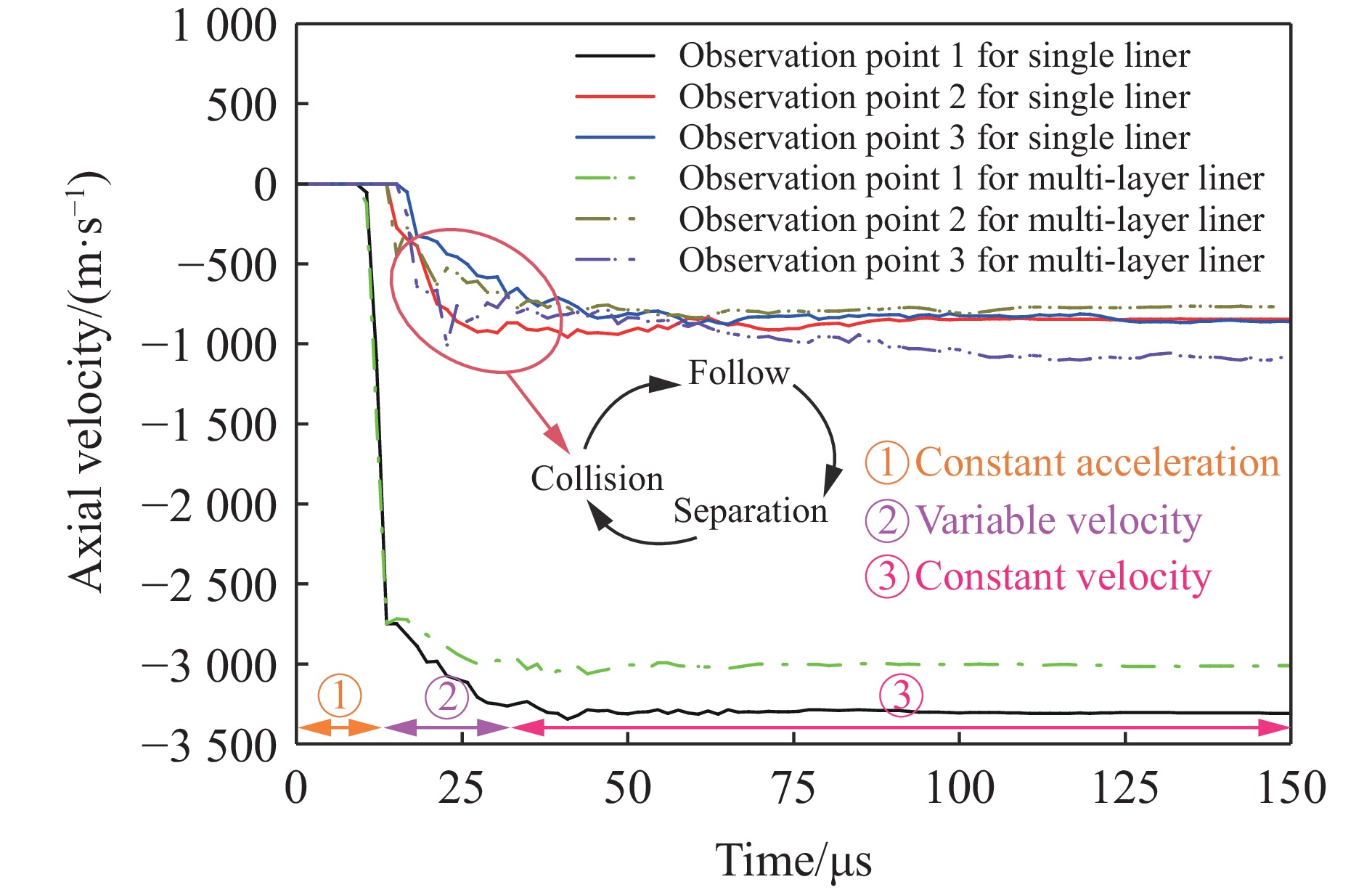 针对传统金属射流在侵彻混凝土目标时存在毁伤面积有限、动态响应不足等问题,首次提出了一种新型高熵合金/铝/聚四氟乙烯(high-entropy alloys/aluminium/polytetrafluoroethylene,HEA/Al/PTFE)双层含能复合药型罩结构。采用真空电弧熔炼、粉末压制与烧结工艺,成功制备出带截顶内衬的半球形复合罩,并通过试验与数值模拟相结合的方法,系统研究了其成型机理、侵彻特性与毁伤效能。试验结果表明,相较于单层HEA罩,该复合结构能显著增强混凝土内部的碎裂和裂纹扩展能力,有效融合了HEA的优异力学性能与Al/PTFE的高能量释放特性。数值模拟表明,内衬对HEA射流具有抑制径向发散、提升射流中段凝聚性的“包覆”作用,但其多次碰撞-追随-分离行为也会延迟系统动态平衡。进一步建立了该复合罩分区成型理论模型,通过引入能量损失系数修正爆轰能量传递过程。理论预测结果与数值模拟结果的对比显示,形成的射流半径与杵体半径的误差小于15%。在此基础上分析了内衬厚度和高度对射流成型的影响规律,确定最优参数为厚度3.5 mm、高度12 mm,可在射流凝聚性、长度及毁伤威力之间实现最佳平衡。