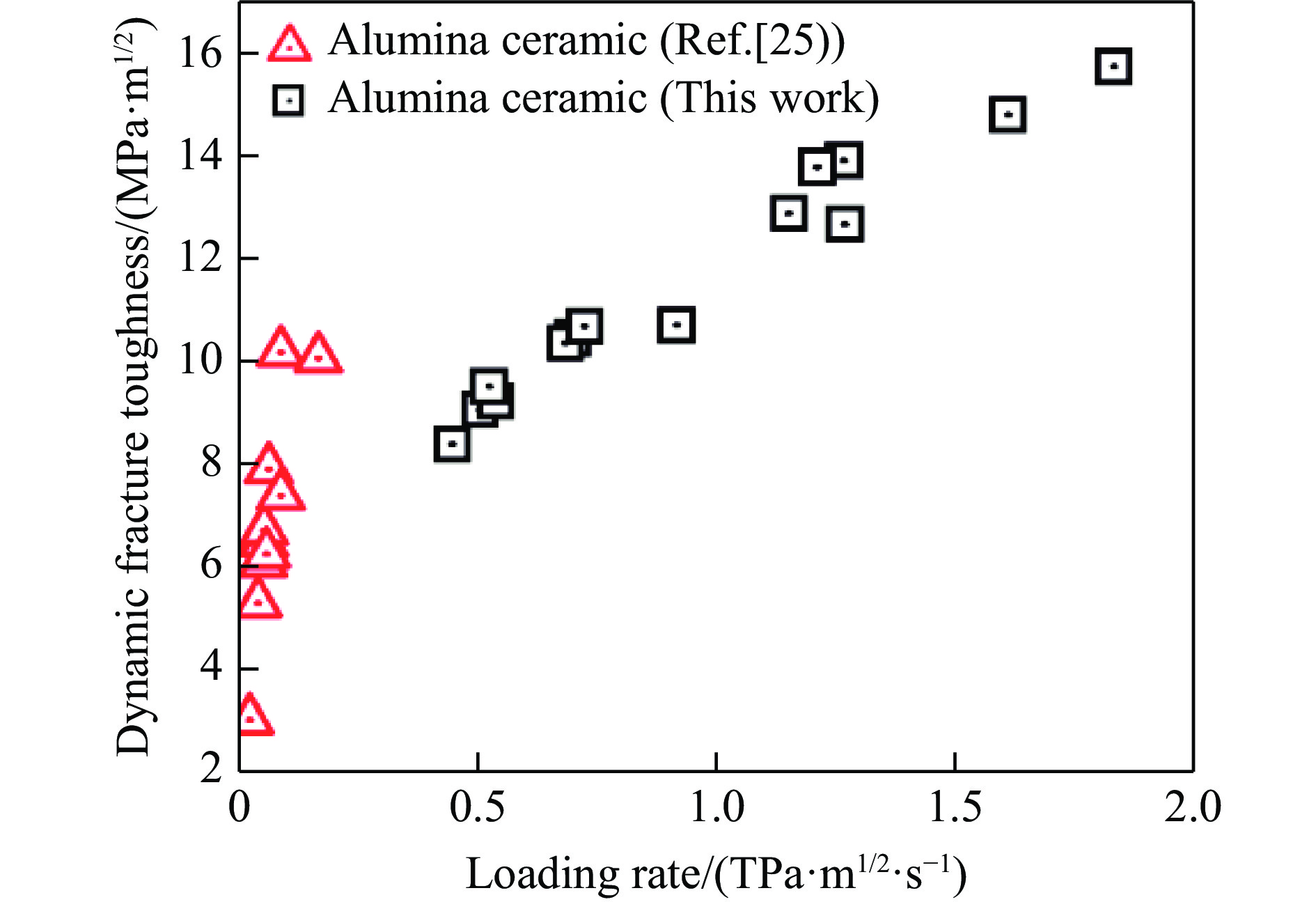 基于霍普金森压杆技术,采用新设计的微型纯Ⅰ型断裂试样和配套夹具,提出了一种针对陶瓷材料的新型动态断裂测试方法,试样的起裂时间由应变片法测得;对氧化铝陶瓷开展了不同加载速率下的动态断裂实验,采用实验-数值方法得到了材料的Ⅰ型动态应力强度因子曲线及动态断裂韧性。结果显示:随着加载速率从0.45 TPa·m1/2·s−1提高到1.83 TPa·m1/2·s−1,氧化铝陶瓷的Ⅰ型动态断裂韧性值由8.39 MPa·m1/2增加至15.76 MPa·m1/2,而起裂时间则随着加载速率的增加而不断提前。由断口分析可知,随着加载速率的增加,氧化铝陶瓷由沿晶断裂占主导的失效模式逐步转变为以穿晶-沿晶相混合的断裂模式。这期间,更多的微缺陷被激活并扩展形成微裂纹,从而导致混合型断裂模式的发生。材料失效模式的转变将引起更多的能量耗散,这是断裂韧性升高的根本原因。