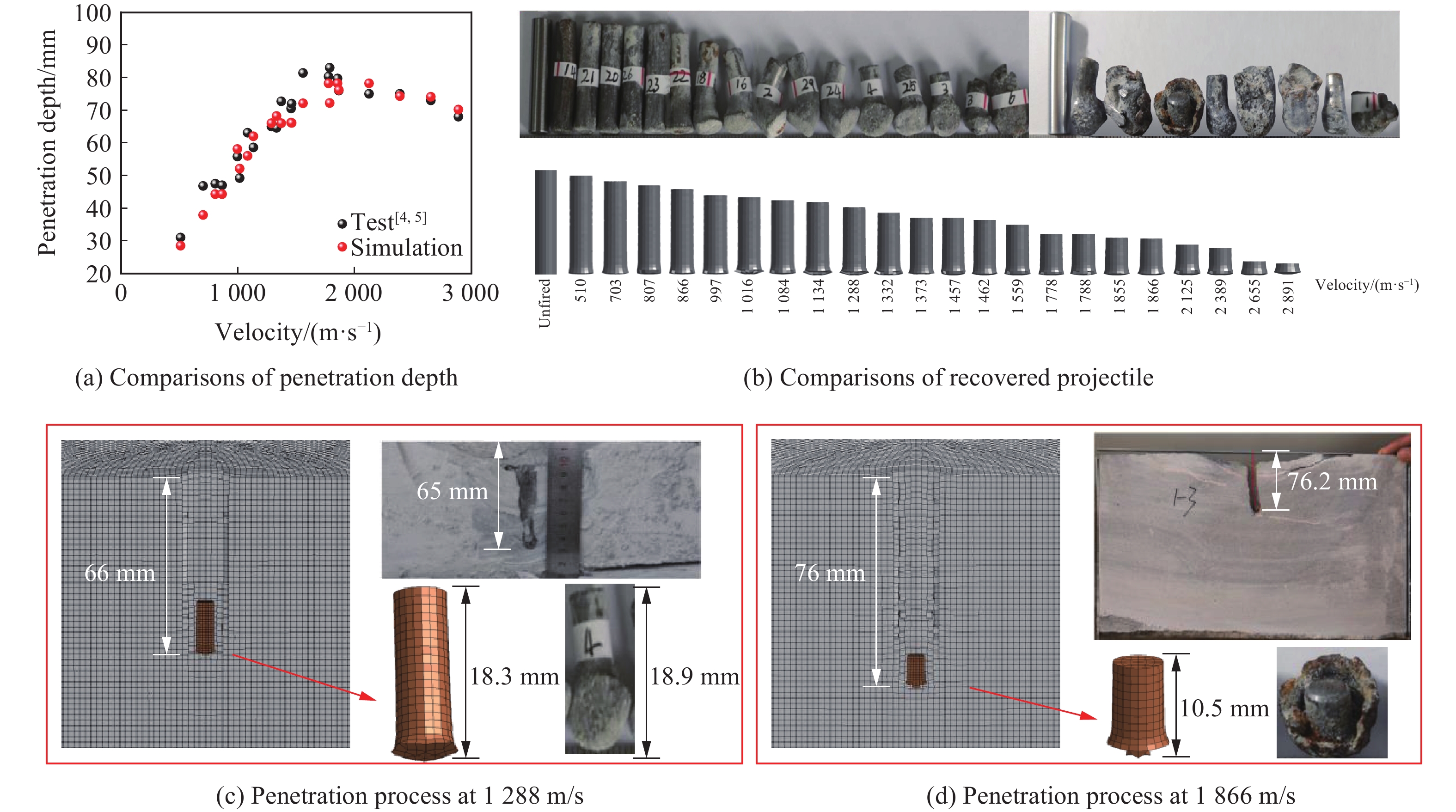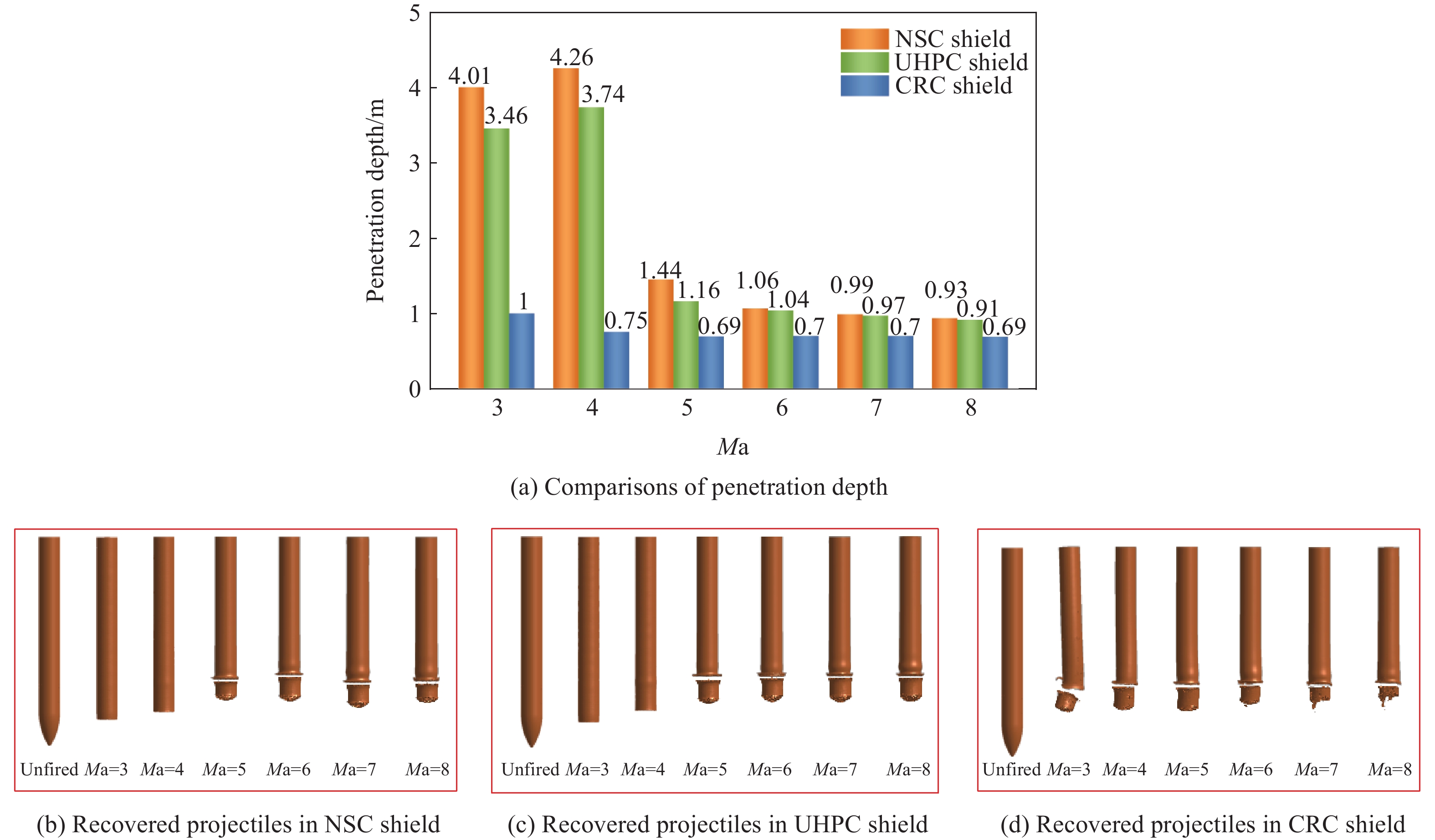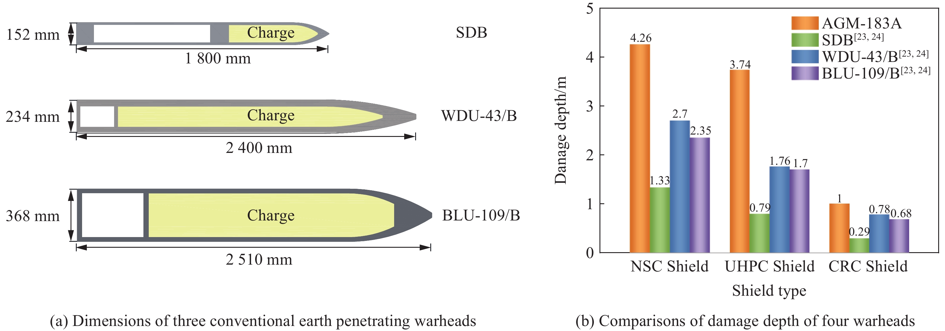 随着超高速武器的飞速发展,开展超高速武器战斗部侵彻混凝土遮弹层效能分析对于新建和已建防护结构的设计与安全评估具有重要意义。针对超高速武器战斗部打击普通强度混凝土(normal strength concrete, NSC)、超高性能混凝土(ultra-high performance concrete, UHPC)和刚玉块石混凝土(corundum rubble concrete, CRC)3种典型遮弹层问题,首先,通过对比钢/钨合金弹体侵彻3种靶体试验和数值仿真结果,验证有限元仿真分析方法中数值算法、网格尺寸和材料模型参数取值等的可靠性;然后,基于侵彻深度和弹体残余长度等效的网格过渡策略,建立了适用于原型工况分析的数值仿真分析方法;最后,在Ma为3~8工况下,开展对AGM-183A超高速武器战斗部侵彻3种遮弹层的数值模拟。结果表明:AGM-183A超高速武器战斗部分别以Ma=4、Ma=4和Ma=3侵彻NSC、UHPC和CRC遮弹层的极限侵彻深度为4.26、3.74和1.00 m,侵彻速度继续增大时,弹体弧柱交接处因局部应力集中发生断裂等结构失稳现象导致侵彻效能下降。与常规声速钻地武器战斗部SDB、WDU-43/B和BLU-109/B侵彻爆炸破坏深度相比,AGM-183A侵彻NSC遮弹层的深度分别达到3.2、1.6和1.8倍,侵彻UHPC遮弹层的深度分别达到4.7、2.1和2.2倍,侵彻CRC遮弹层的深度分别达到3.4、1.3和1.5倍。3种遮弹层抗AGM-183A超高速武器战斗部侵彻的建议设计厚度分别为8.01、7.03和1.88 m,UHPC相对NSC遮弹层的抗超高速侵彻能力提升不明显,CRC遮弹层可以有效兼顾抵抗常规声速和超高速战斗部打击,建议设计时优先采用。