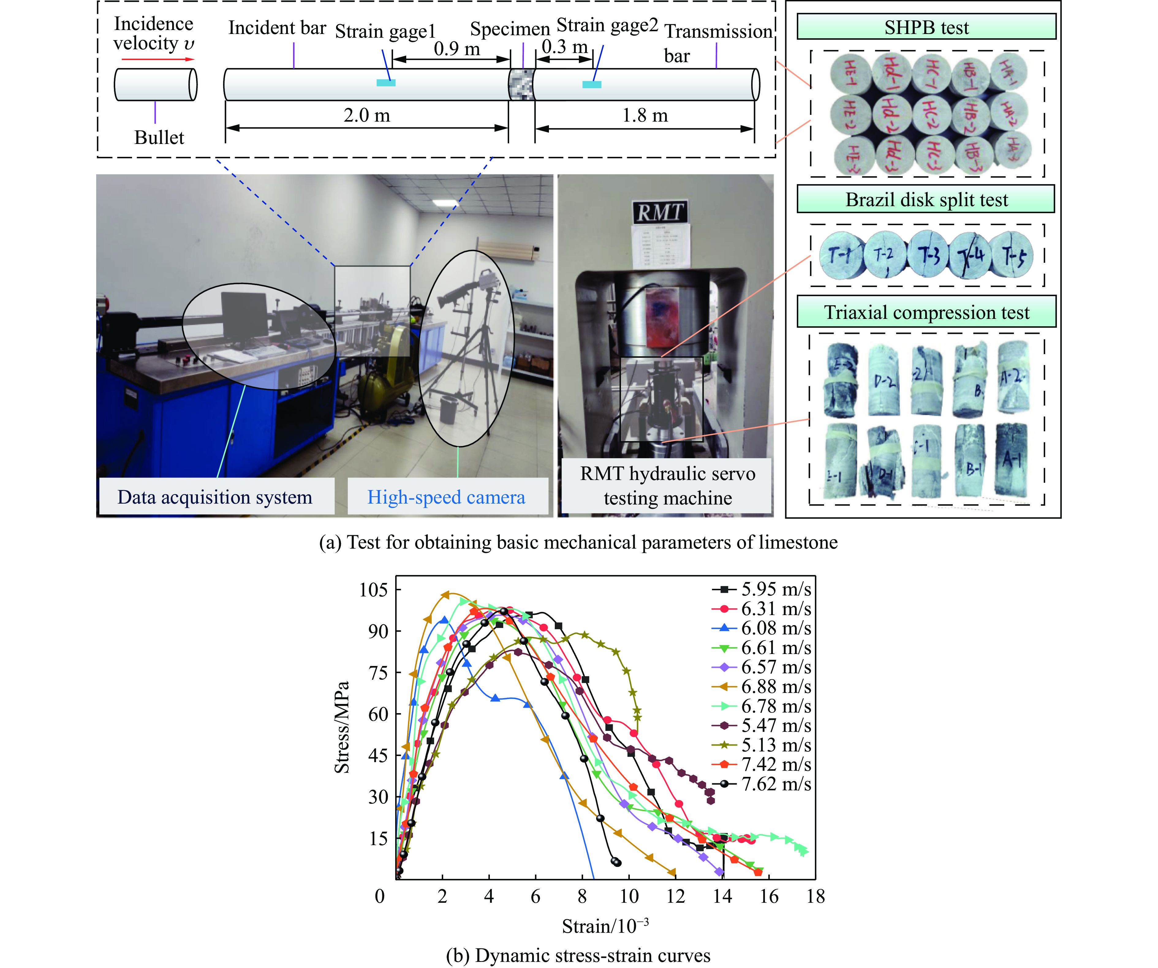 为研究深部隧道围岩在掘进过程中爆破引起的扰动作用,亟需掌握围岩在动态荷载下的力学响应、破坏模式及能量耗散特性。本研究采用自主研发的、配备主动围压控制装置的霍普金森压杆(SHPB)试验系统,对红砂岩岩样进行不同围压等级下的动态压缩试验。以探讨红砂岩在爆破冲击荷载作用下的动态力学响应、破坏模式和能量耗散机制。试验结果表明:无围压岩样的动态应力-应变曲线表现为“两阶段”变化特征,而在围压条件下则呈现出明显的“三阶段”演化规律。围压显著增强了红砂岩的动态抗压强度与峰值应变,二者均表现出显著的应变率效应与围压效应。破坏模式和能量耗散方面,无围压时,岩石试件在较高应变率作用下发生粉碎性破坏;而在围压条件下,试样的破坏程度显著减轻,最终表现为压剪破坏模式。同时,在相同应变率下,围压试件的能量吸收能力明显高于无围压条件。当入射能相近时,红砂岩的比能量吸收值(SEA)随围压水平的提高而增大。
