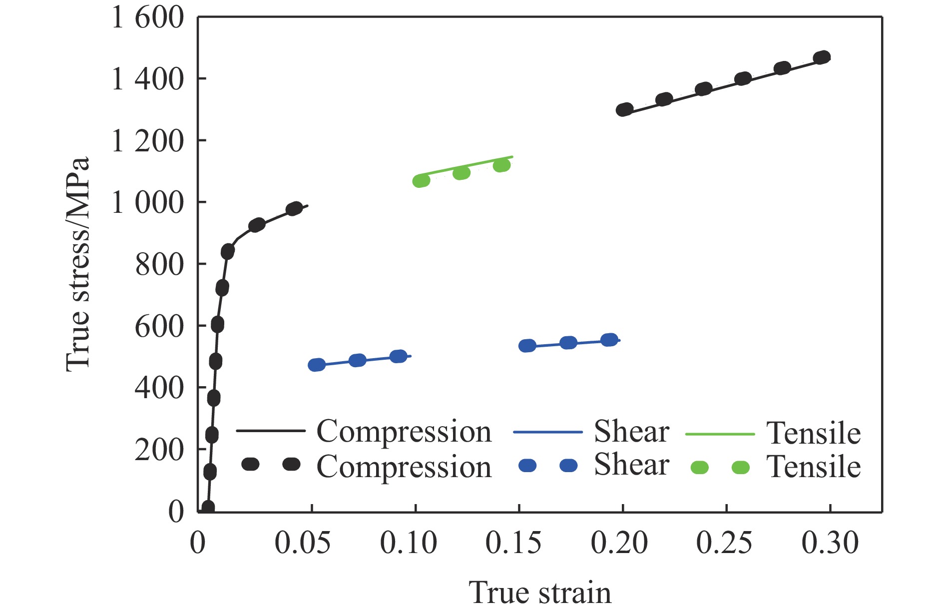 为准确描述核级不锈钢Z2CN18.10在动态载荷下的力学行为,通过电子万能试验机和传统Hopkinson拉杆系统开展了准静态与高应变率拉伸试验,获取了该材料在常温至400 ℃、应变率10−3~103 s−1范围内的应力-应变响应。针对传统Hopkinson杆无法实现大应变加载的局限,采用电磁驱动双向Hopkinson拉杆测量了Z2CN18.10不锈钢在不同应力三轴度下的失效应变。基于实验数据拟合了Johnson-Cook本构模型和失效准则参数,并通过空气炮高速冲击试验验证了模型的有效性。结果表明,数值仿真与试验关于破孔尺寸、峰值应变和支撑反力的差值分别为4.4%、7.5%和2.3%,吻合良好。建立的Z2CN18.10不锈钢可靠动态本构模型和失效准则可为核电站管道系统的抗冲击设计与安全评估提供了重要的方法与数据基础。