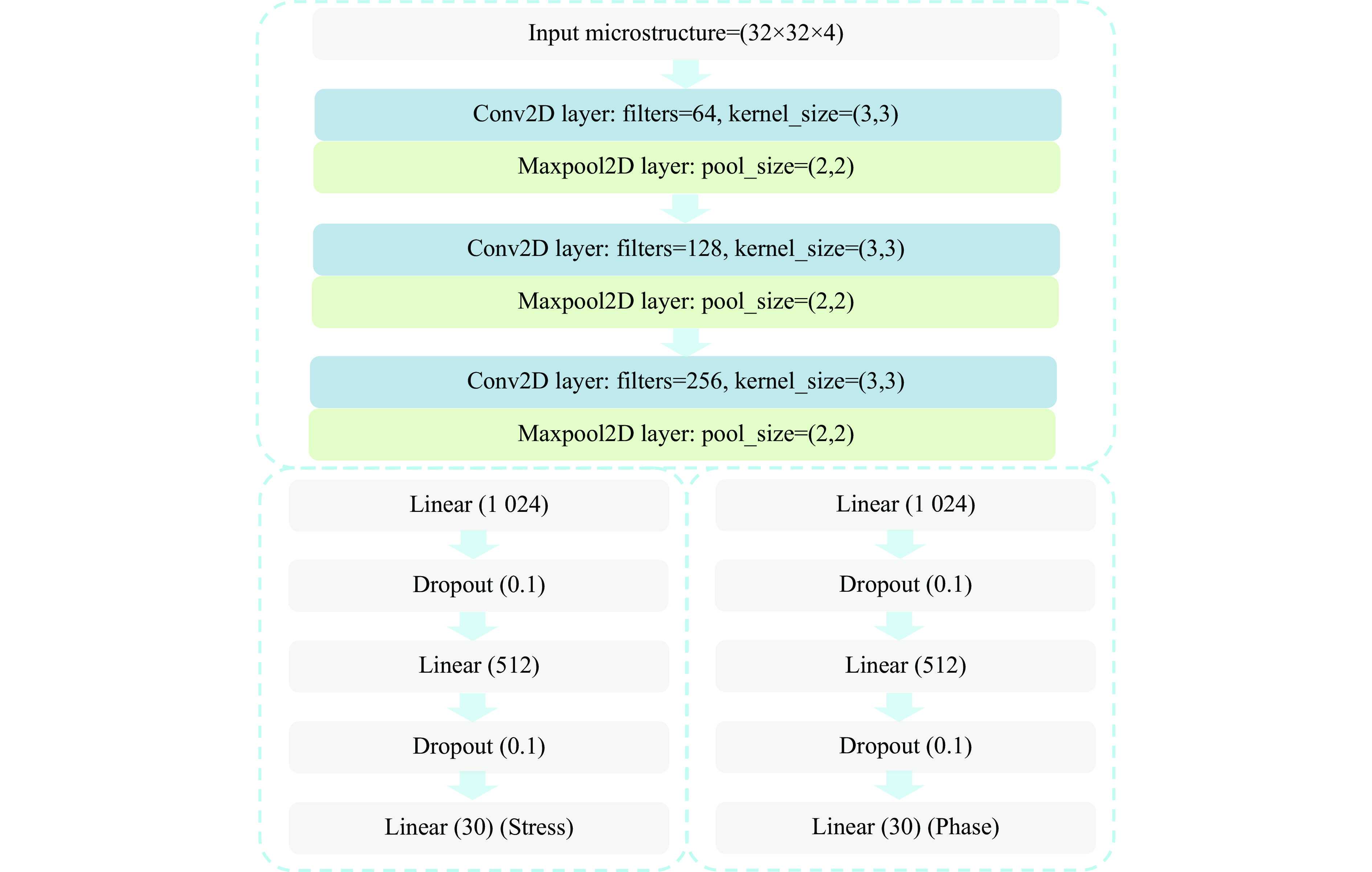 亚稳态高熵合金因其在高应变率下优异的力学性能而受到广泛关注;然而,由于对微观结构与冲击响应关系的认识不足,限制了其在高应变率下的工程应用。本研究采用一种结合晶体塑性有限元方法和卷积神经网络的深度学习框架,阐明了微观结构与冲击响应之间的关系。基于晶体塑性模拟收集数据集,该数据集包含高应变率下亚稳态高熵合金在拉伸、压缩及剪切载荷条件下不同织构的完整应力应变响应和相变体积分数的演变。构建了一个双分支卷积神经网络模型,输入为织构和载荷条件。该模型的两个分支用于预测不同的输出:即应力应变曲线与马氏体体积分数的演变。基于收集的数据集对卷积神经网络模型进行训练。结果表明,该模型能够准确预测高应变率条件下亚稳态高熵合金的冲击响应。该研究进一步证明了深度学习框架在保证预测精度的同时,相比晶体塑性有限元模拟具有显著的计算效率优势,为高效评估高应变率下亚稳态高熵合金的力学行为提供了一种新思路。
