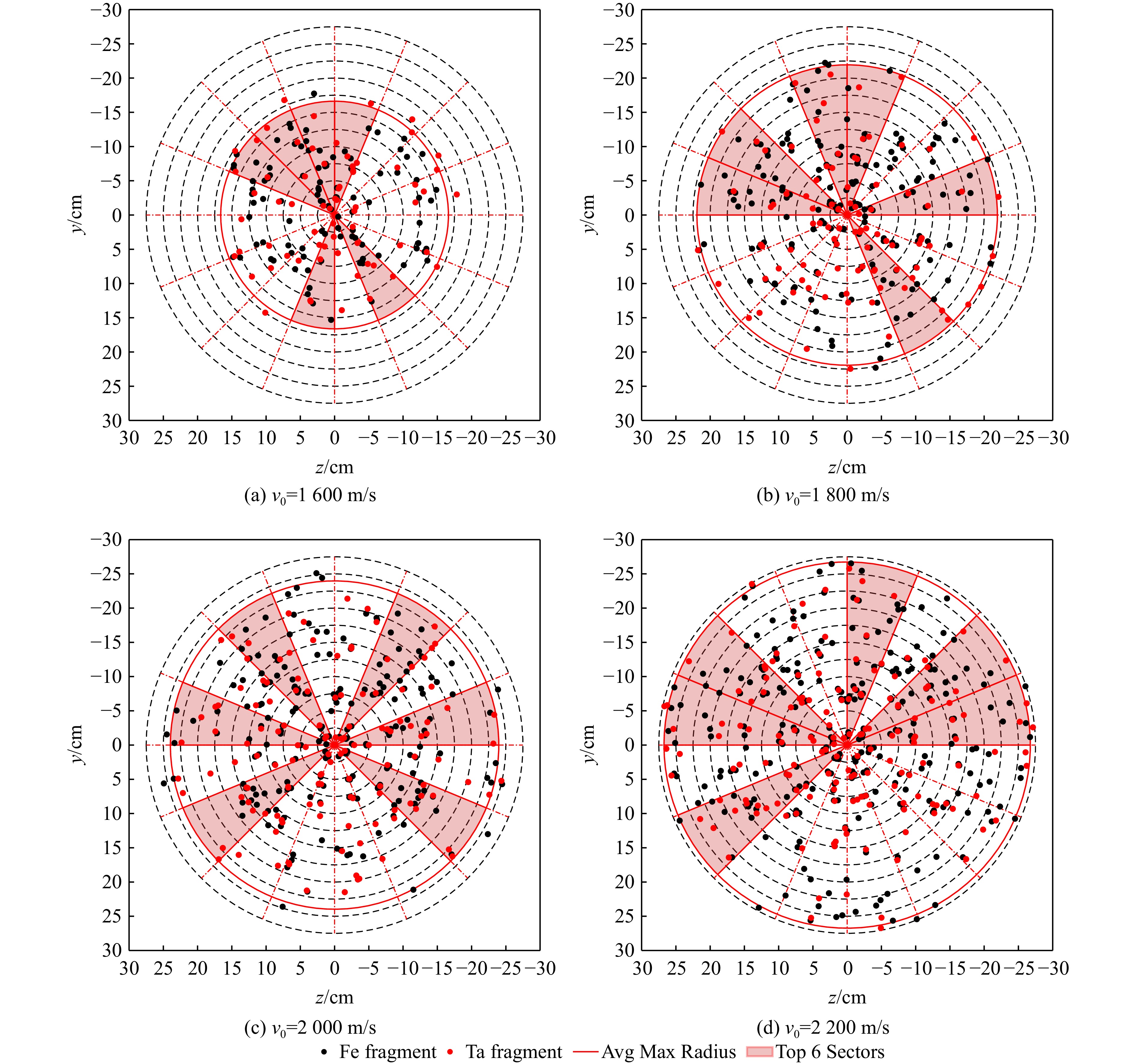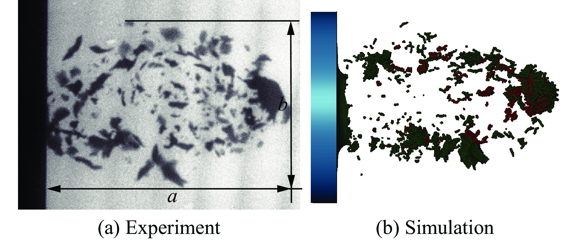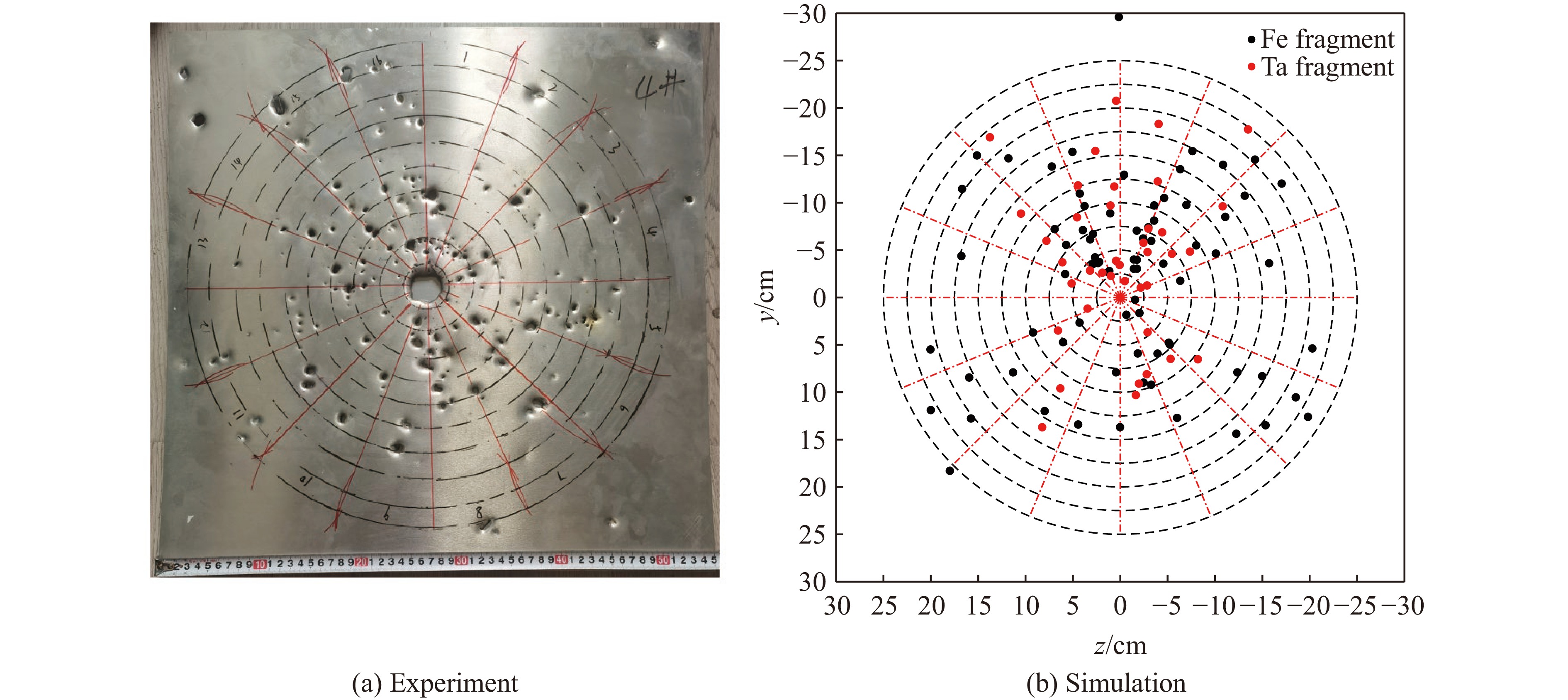 为研究钽合金爆炸成型弹丸(explosively-formed projectile,EFP)侵彻靶板产生靶后破片的空间散布,首先开展了钽合金EFP侵彻45钢的X光及破片散布试验;其次,采用经试验验证的FE-SPH(finite element-smoothed particle hydrodynamics)固定耦合方法开展了多种弹、靶条件下EFP垂直侵彻靶板的数值模拟,获得了靶后破片空间散布的数据集;最后,采用基于贝叶斯优化的支持向量回归对靶后破片密集飞散角数据进行训练,得到了基于贝叶斯优化的支持向量回归模型。研究结果表明:从试验结果来看,靶后破片云形貌为典型的截椭球状,由于钽、钢密度差异导致不同材料破片径向膨胀能力不同,钢破片分布在椭球的外表面而钽破片分布在椭球的内表面,靶后破片主要集中在验证靶上中心穿孔处周围的圆形区域;采用FE-SPH固定耦合方法模拟再现了靶后破片的形成过程,得到的靶后破片云形貌与试验结果十分接近,靶后破片平均最大飞散角与试验结果相对误差不超过10%,验证了数值模拟结果的准确性;建立的基于贝叶斯优化的支持向量回归模型能够实现对不同靶板厚度、着靶速度条件下靶后破片的密集飞散角的准确预测,数值模拟结果与模型预测结果最大相对误差均小于10%,在此基础上可以实现对靶后一定距离内验证靶毁伤面积的快速预测。