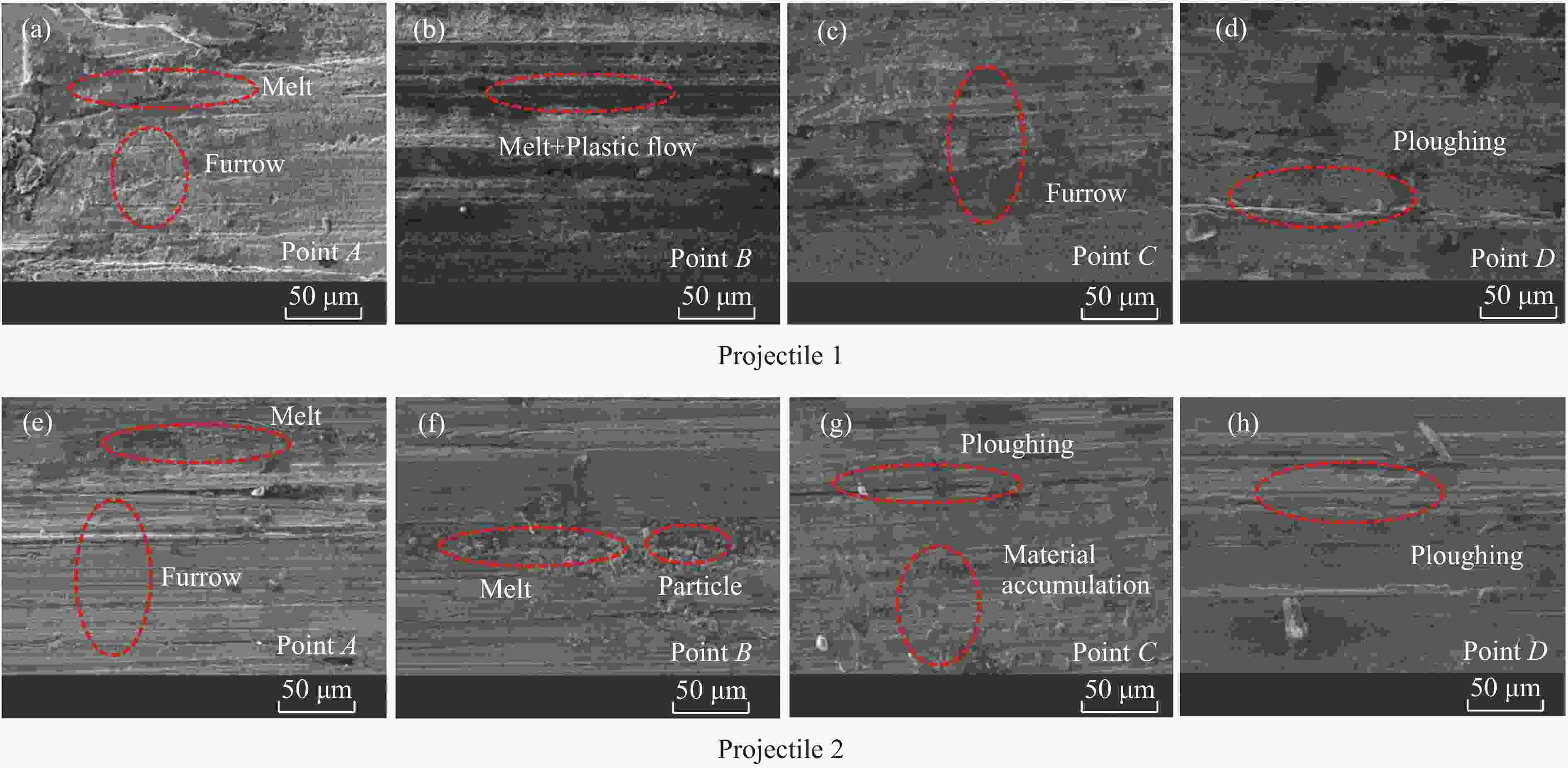 1400 m/s速度段侵彻钢筋混凝土靶的实验研究。基于实验结果,对侵彻弹体进行了宏微观结构表征,探究了不同材料弹体在高速侵彻下的侵蚀机理,分析了壳体材料对弹体侵彻效应的影响。结果表明:在实验速度段,弹体材料主导弹体的侵蚀变形,材料强度越高,抗冲击压缩性能越强,弹体头部的侵蚀越小;材料的抗剪和耐磨性越好,弹身的磨蚀越少。高速侵彻条件下,锥形结构弹体的质量损失主要集中在弹身部分。弹体头部的侵蚀和墩粗在一定程度上会降低弹体的侵彻深度,弹体头部侵蚀程度越低,侵彻深度越高,其中,DT1900实验弹的极限侵彻深度可达9倍弹长。Abstract: Two kinds of structural projectiles made of two different materials were designed in this paper. An experimental study of 11 kg projectiles penetrating the reinforced concrete target at 1400 m/s was carried out using a 203 mm Davis gun. Based on the experimental results, the structural response, penetration capability and related engineering issues of the projectile are discussed. The results show that when the reinforced concrete target is penetrated at a velocity of1400 m/s, the heads of projectiles made of two different materials experienced erosion and were mushroomed. This was caused by high temperatures resulting from friction between the projectile and the concrete during penetration, which significantly softened the surface of the projectile. Furthermore, the contact pressure between the projectile and the target exceeded the yield strength of the projectile material near the surface, causing the material to enter a state of plastic flow and ultimately leading to the erosion and mushrooming of the projectile head. Additionally, the surface material of the projectile was stripped due to the cutting action of the hard aggregates in the concrete, resulting in severe abrasion of the projectile body. When comparing the structural responses of projectiles made of different materials, it was evident that material properties influenced their behavior. Compared to 30CrMnSiNi2MoVE, DT1900, known for its higher strength, hardness and better resistance to impact compression, showed less erosion at the projectile head. However, the inferior shear resistance and wear resistance of DT1900 led to severe abrasion on the projectile body. The mass loss pattern of a conical projectile is different from that of a solid long-rod projectile, with the latter concentrated mainly in the projectile body. The conical flared tail design, while suppressing ballistic deflection, increased the contact area between the projectile body and the target, enhancing the abrasive and cutting actions of aggregates and steel. Moreover, under high-speed penetration conditions, the erosion and mushrooming of the projectile head could reduce the penetration depth; the less erosion at the head, the greater the penetration depth. In experiments, the maximum penetration depth of DT1900 projectiles could reach up to nine times the length of the projectile.-