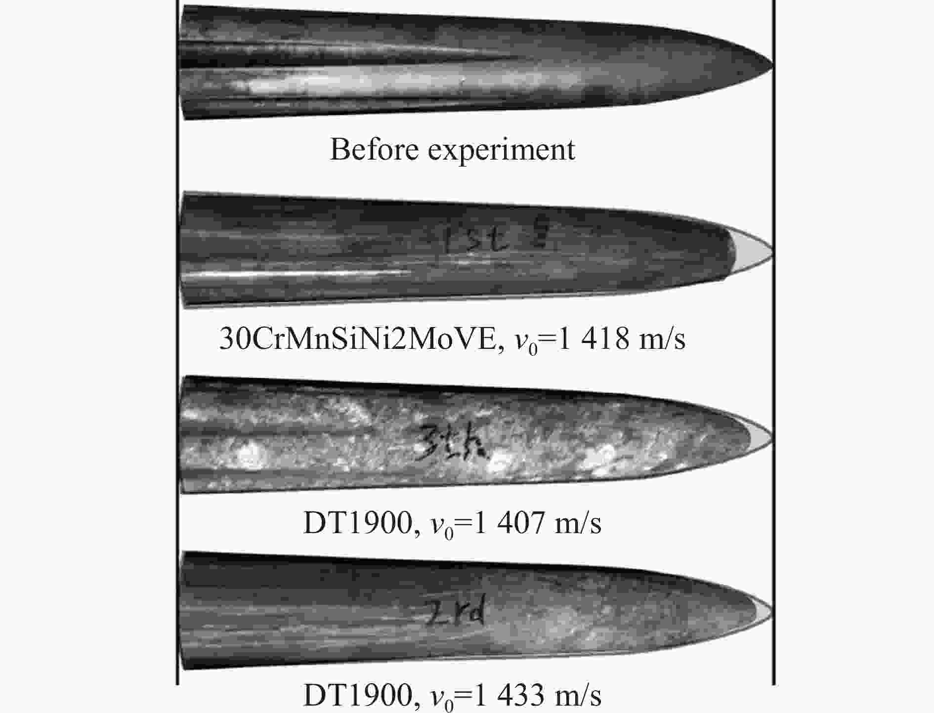 弹体材料 v0/(m·s−1) (ΔL/L)/% (ΔD/D)/% (Δmt/m)/% (Δmb/m)/% (Δm/m)/% 30CrMnSiNi2MoVE 1418 8.2 3.3 2.13 7.56 9.69 DT1900 1407 4.4 4.4 0.31 9.43 9.74 1433 4.6 4.4 0.32 10.20 10.52 表 5 实验弹的无量纲侵彻深度