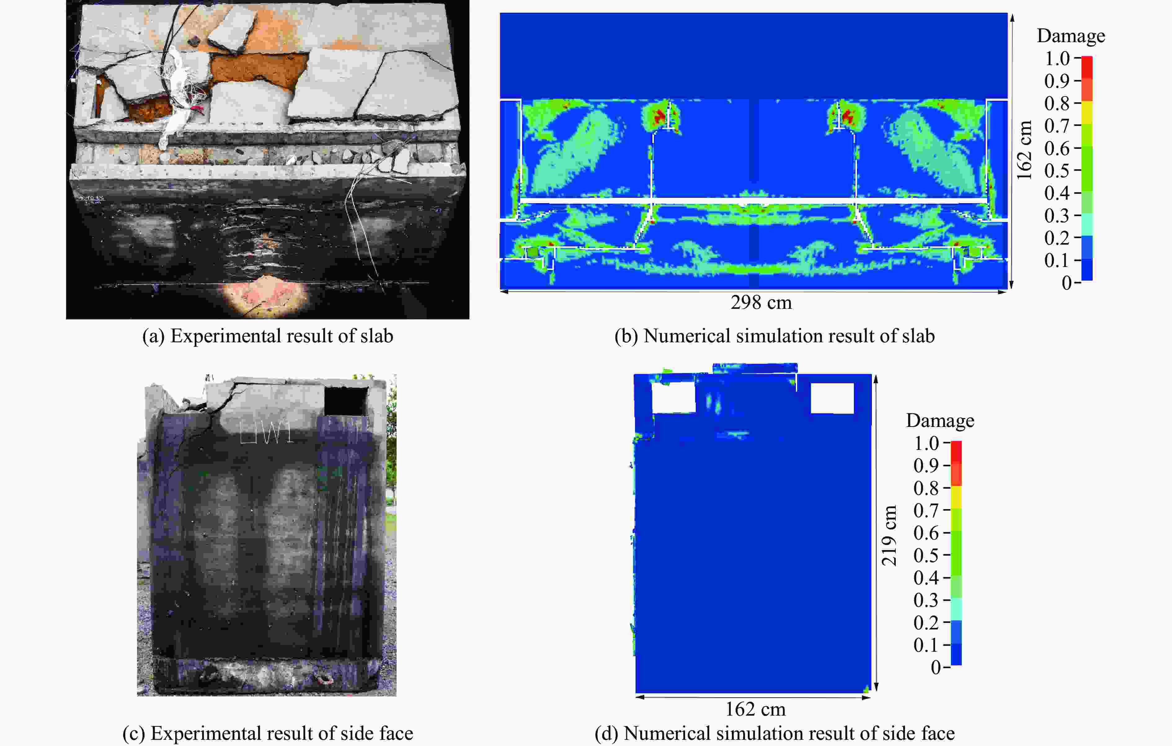 摘要: 为探究水下接触和近场爆炸下沉箱码头的毁伤机理和荷载特性,基于沉箱码头缩尺模型试验,采用有限元数值模拟开展对比研究,分析了沉箱码头内冲击波荷载的传播、衰减规律以及沉箱码头的破坏过程和毁伤机理。研究结果表明:水下接触和近场爆炸下,沉箱码头的毁伤区域和破坏特征基本一致,码头迎爆外墙和面板为主要破坏区域,迎爆外墙呈爆坑、破口的破坏现象,面板呈现管沟连接处横向通长裂缝、纵向裂缝并掀飞的破坏现象,沉箱码头侧墙和仓格内纵横隔墙毁伤相对轻微。水下接触和近场爆炸下,沉箱码头内冲击波在仓格的隔墙和填砂界面发生反射和透射现象,码头迎爆外墙、侧墙、板均受到冲击载荷,冲击波荷载在沉箱内的衰减速度由陡至缓,沉箱码头的毁伤特征在水下爆炸冲击波阶段基本形成,毁伤形成时间略大于2倍的冲击波在沉箱码头内的传播时长。Abstract: To investigate the damage mechanism and load characteristics of caisson wharf under underwater contact and near-field explosion, a high-fidelity numerical model was conducted based on the scaled model tests of caisson wharf and verified by comparing the simulation results with the experimental data. The propagation and attenuation characteristics of shock waves inside the caisson, partition walls, and internal backfill soil were analyzed. The destruction process and typical damage mechanisms of the caisson wharf were analyzed by comparing Holmquist‒Johnson‒Cook constitutive model damage contour maps with experimental results. The results shows that the damage areas and characteristics of the caisson wharf are largely consistent under both underwater contact and near-field explosion. The primary damage areas are blast-facing wall and deck slab. The blast-facing wall exhibits cratering and breaching phenomena, while of the deck slab shows transverse full-length cracks at trench-slab connections, longitudinal cracks, and blow-off. The side walls and internal partitions of the caisson wharf sustain relatively minor damage. Shock wave within the caisson subjected to underwater contact and near-field explosions undergo reflection and transmission at the interfaces between the partitions and fillings within the compartments. The blast-facing wall and side walls of the wharf are subjected to shock loads. The transmitted compressive waves across the transverse bulkheads and blast-resistant back walls exhibited amplification compared to the incident waves, whereas attenuation was observed as the waves traversed the sand-filled compartments. Numerical simulation results revealed that the shock wave load within the caisson undergoes a decay rate that transitions from rapid to gradual. Damage characteristics of caisson wharf is primarily shaped during the underwater explosion shockwave phase. Neglecting large-scale macroscopic movements such as uplift and scattering post panel failure, the damage formation time slightly exceeds twice the shockwave propagation duration through the structure.