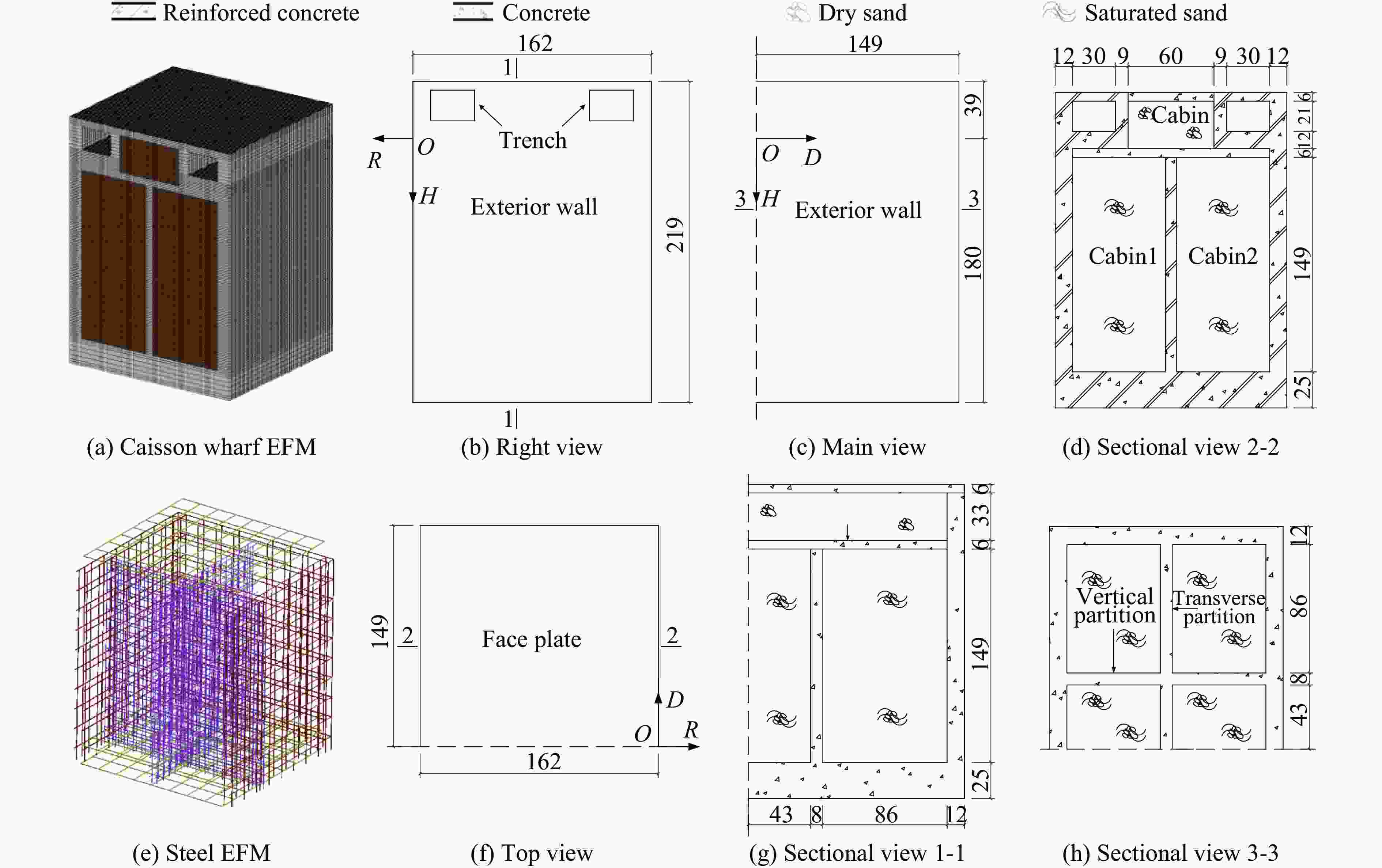 位置 混凝土厚度/cm 配筋情况 保护层厚度/cm 仓格外墙 12 双层双向配筋,钢筋直径1.2 cm,间距18 cm 2.0 仓格内隔墙 8 双层双向配筋,钢筋直径0.8 cm,间距9 cm 1.5 沉箱底板 25 双层双向配筋,钢筋直径2.0 cm,间距18 cm 4.0 管沟底板 13 双层双向配筋,钢筋直径0.6 cm,间距15 cm 2.0 管沟外壁 12, 8 双层双向配筋,钢筋直径0.6 cm,间距15 cm 1.5 面板 6 管沟上部面板单层双向配筋,其他部位不配筋 1.5 封仓板 6 不配筋 表 2 试验工况