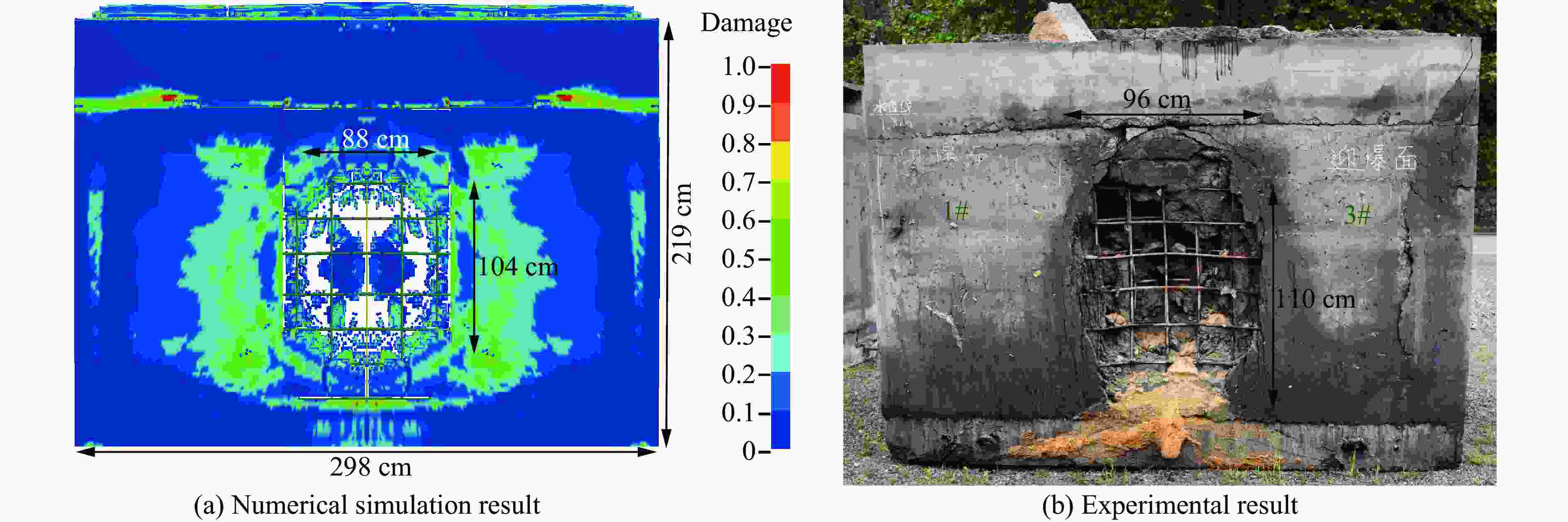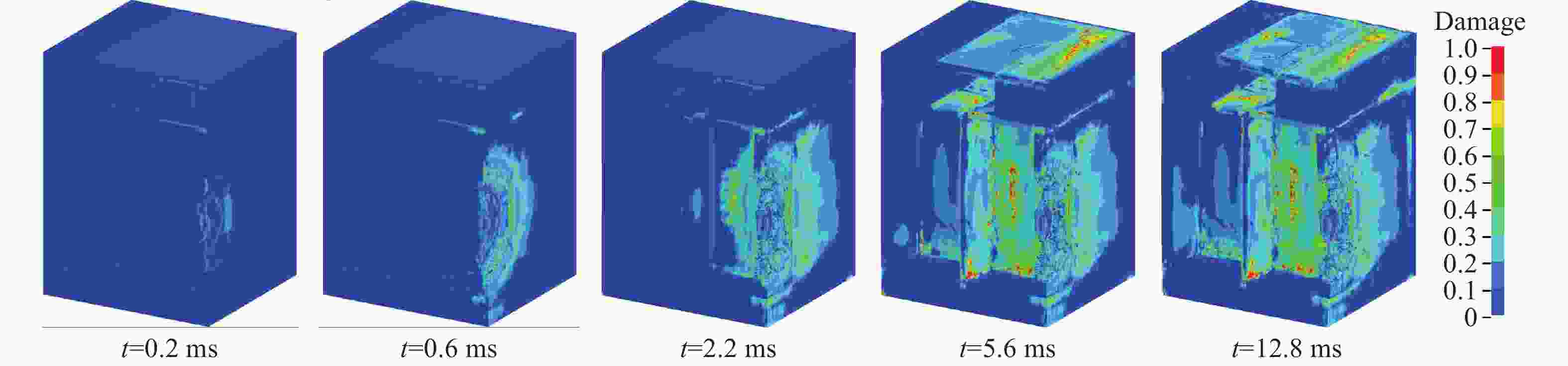 ρ0/(kg·m−3) G/GPa $f'_c$/MPa A B C N 2440 9.24 22.26 0.79 1.6 0.007 0.61 Smax D1 D2 EFMIN T/MPa pcrush/MPa μcrush 7.0 0.034 1.0 0.0068 2.93 7.42 0.0011 Plock/GPa μlock k1/GPa k2/GPa k3/GPa ${\dot \varepsilon _0}$/μs−1 fs 0.80 0.11 85 −171 208 1E-6 0.004 表 4 混凝土HJC模型参数(