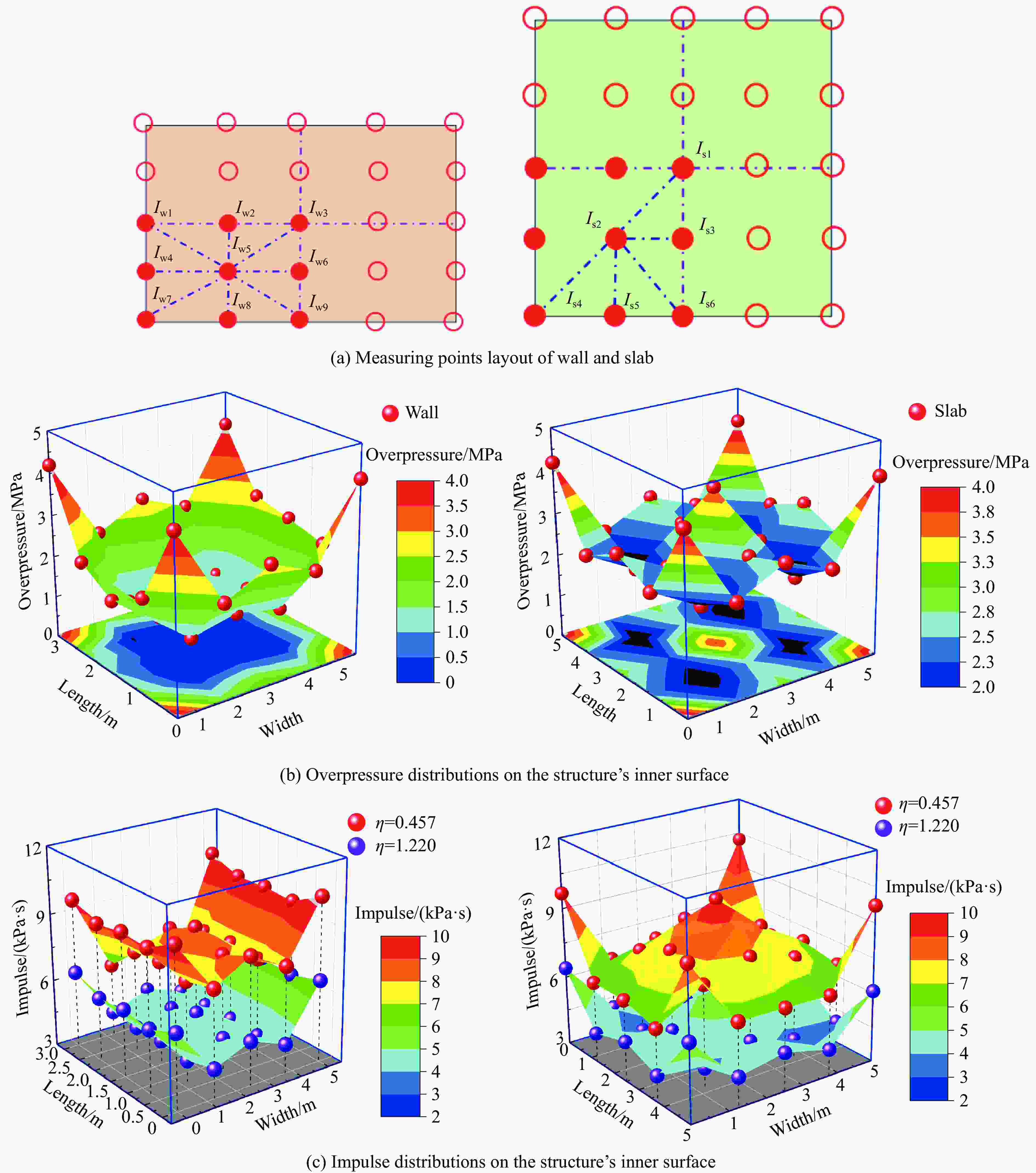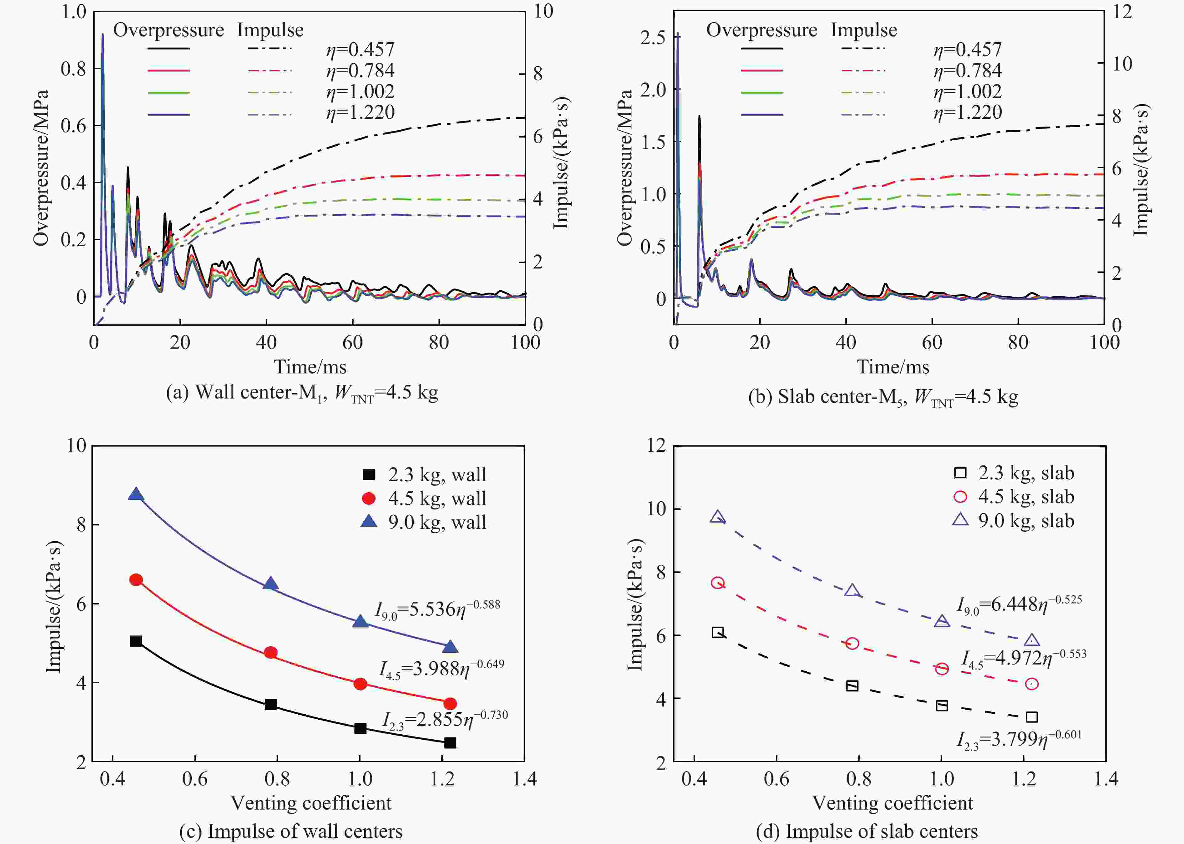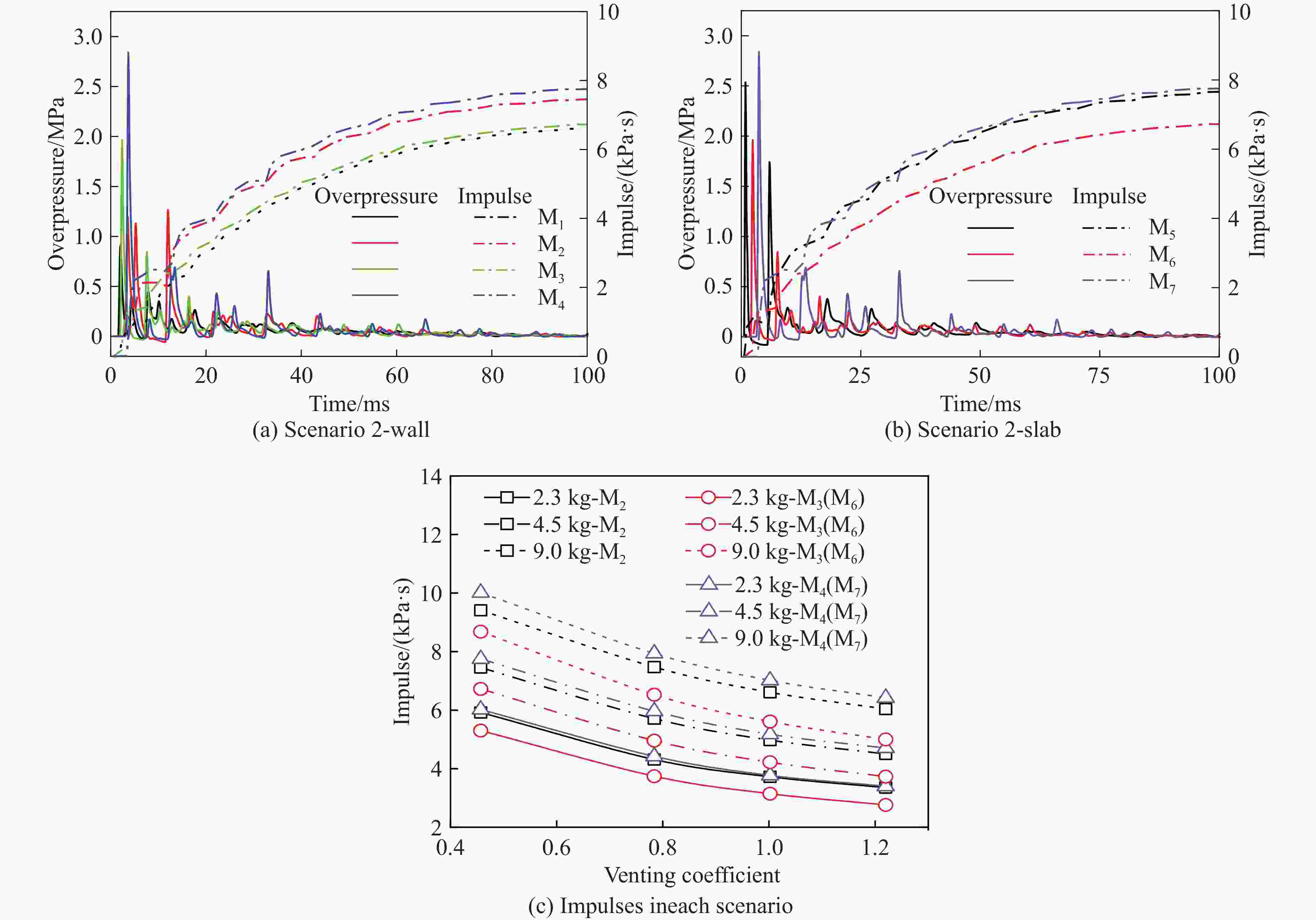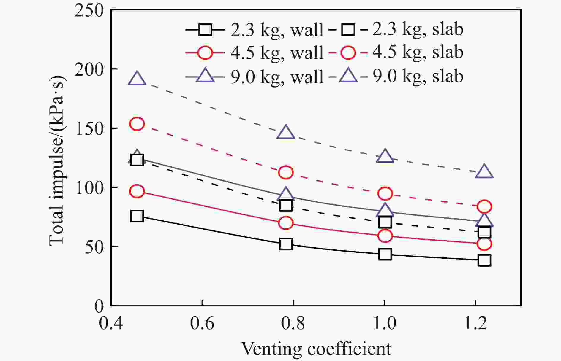 工况 泄爆面积/m2 泄爆系数 TNT当量/kg 工况 泄爆面积/m2 泄爆系数 TNT当量/kg S1 1.89 0.457 2.3 S7 4.14 1.002 2.3 S2 1.89 0.457 4.5 S8 4.14 1.002 4.5 S3 1.89 0.457 9.0 S9 4.14 1.002 9.0 S4 3.24 0.784 2.3 S10 5.04 1.220 2.3 S5 3.24 0.784 4.5 S11 5.04 1.220 4.5 S6 3.24 0.784 9.0 S12 5.04 1.220 9.0 表 4 自由场爆炸作用于墙体和顶板的反射超压冲量