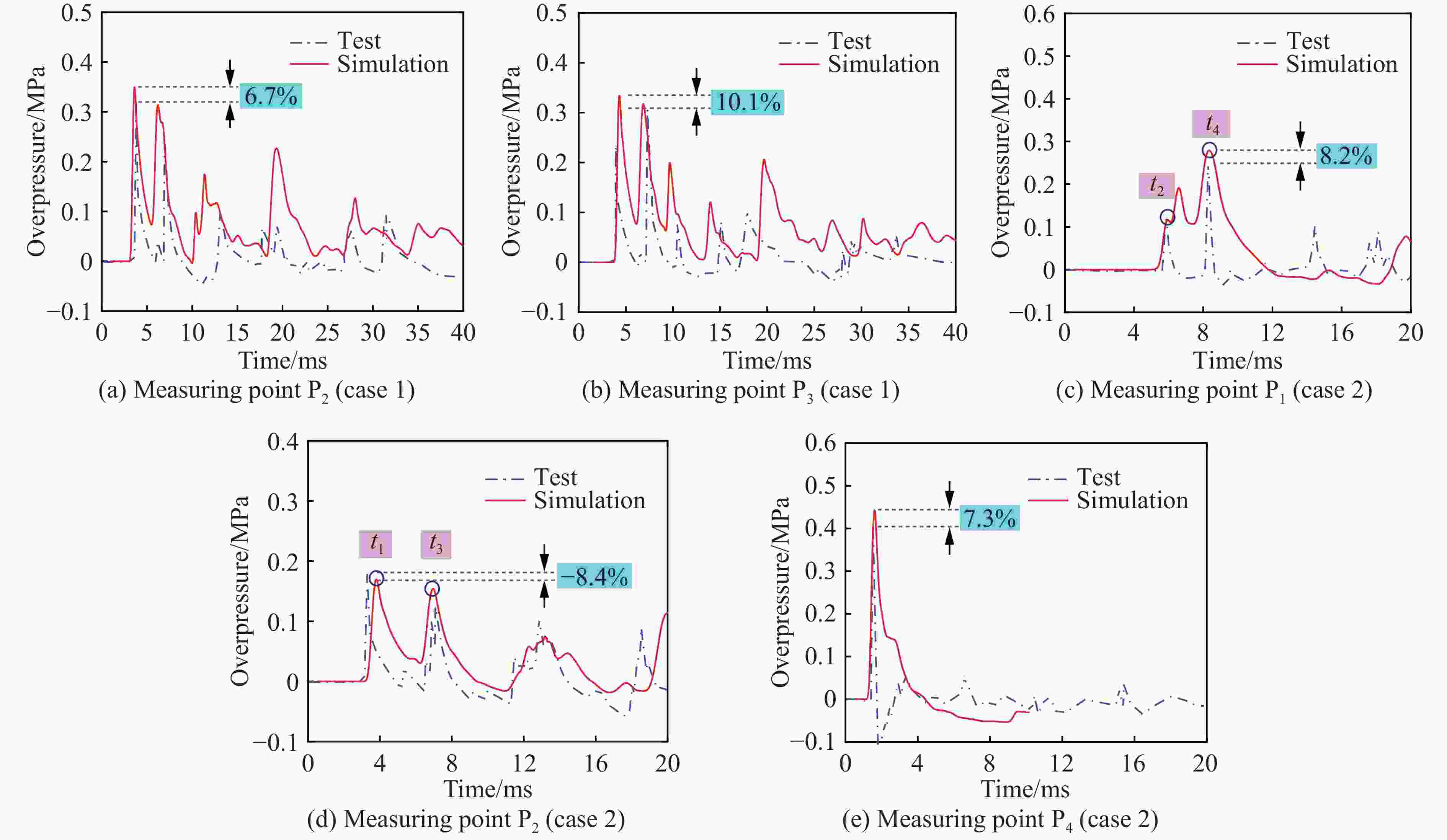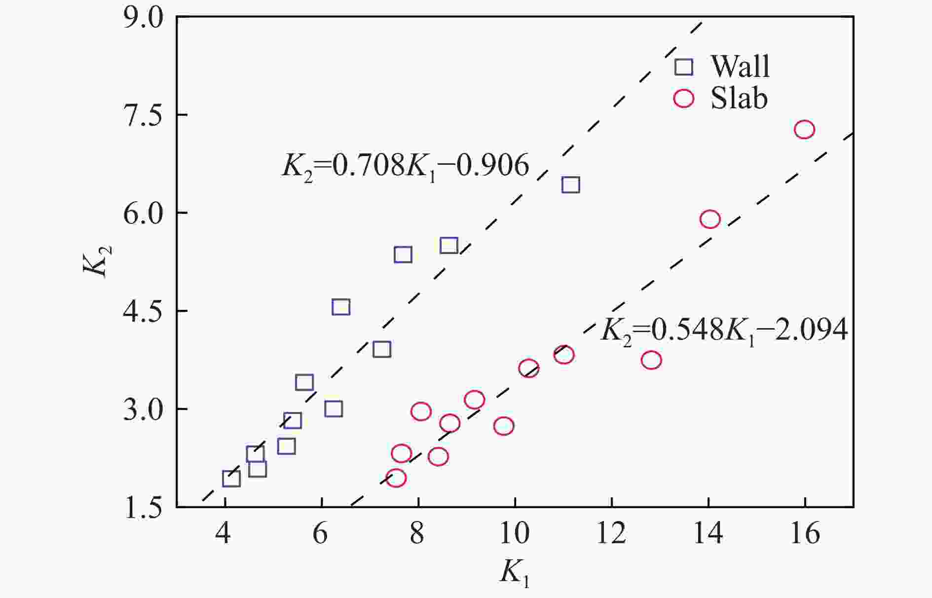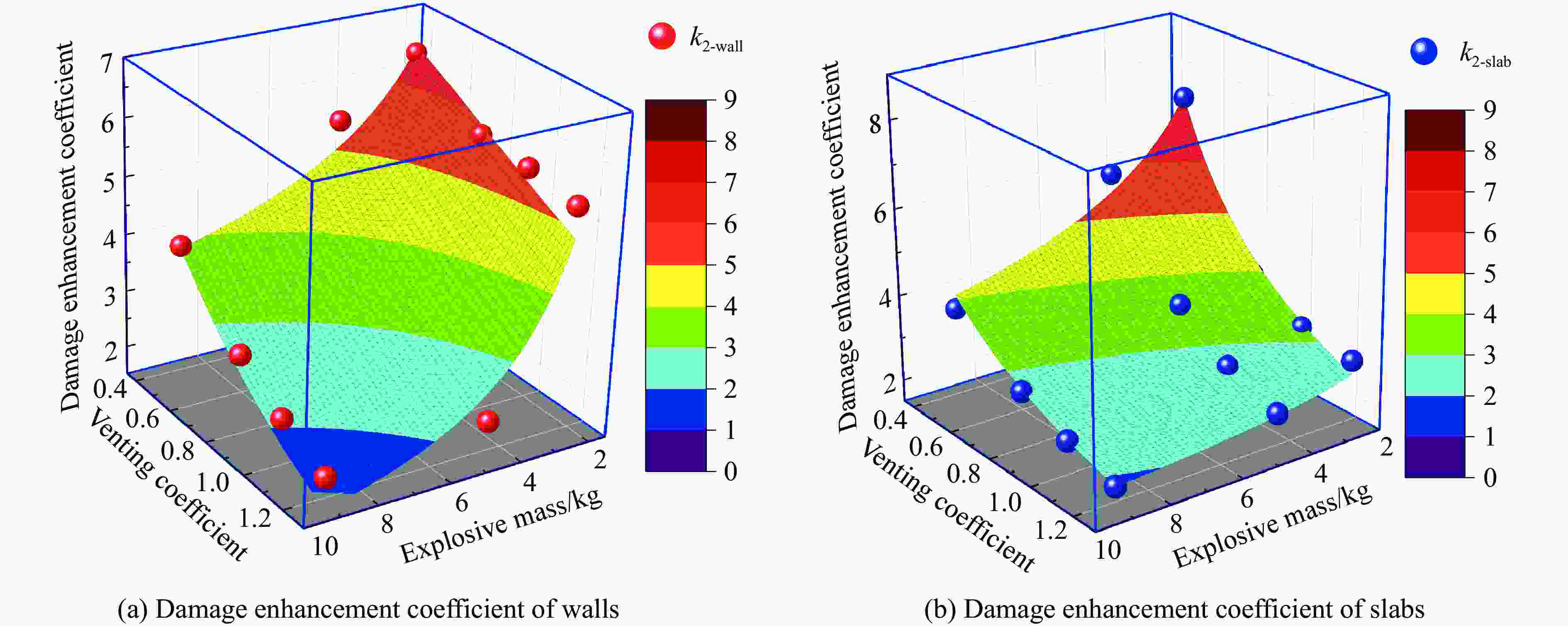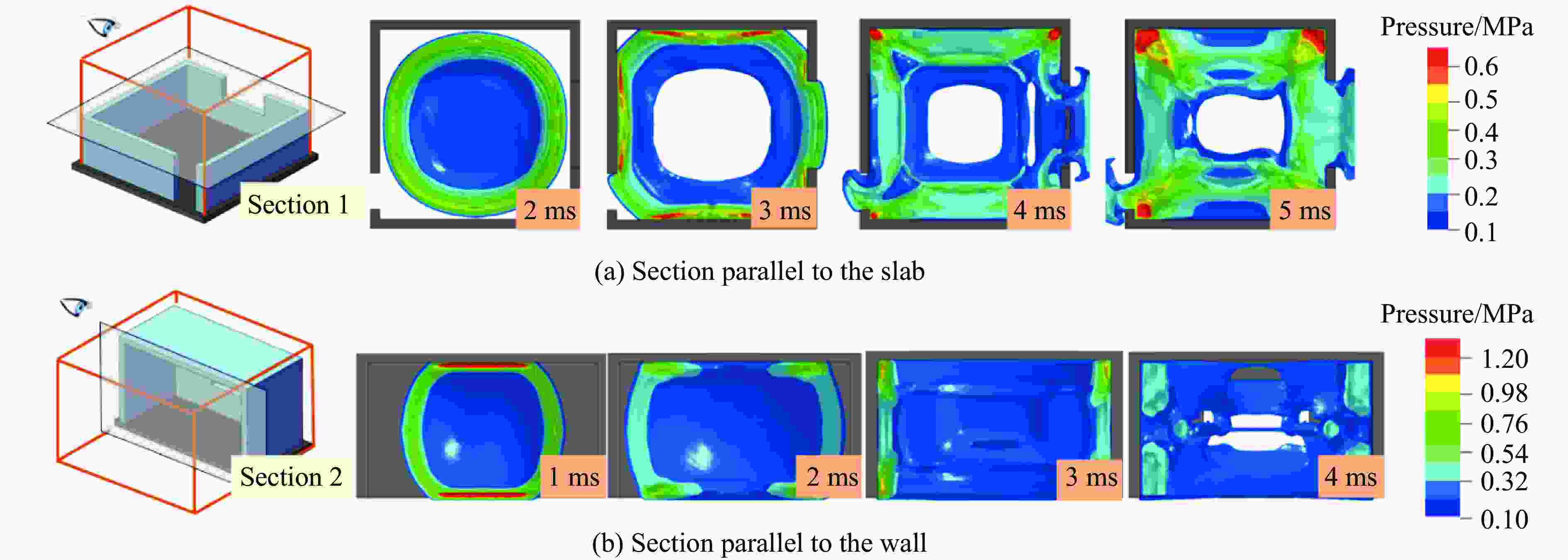 工况 泄爆面积/m2 泄爆系数 TNT当量/kg 工况 泄爆面积/m2 泄爆系数 TNT当量/kg S1 1.89 0.457 2.3 S7 4.14 1.002 2.3 S2 1.89 0.457 4.5 S8 4.14 1.002 4.5 S3 1.89 0.457 9.0 S9 4.14 1.002 9.0 S4 3.24 0.784 2.3 S10 5.04 1.220 2.3 S5 3.24 0.784 4.5 S11 5.04 1.220 4.5 S6 3.24 0.784 9.0 S12 5.04 1.220 9.0 表 4 自由场爆炸作用于墙体和顶板的反射超压冲量