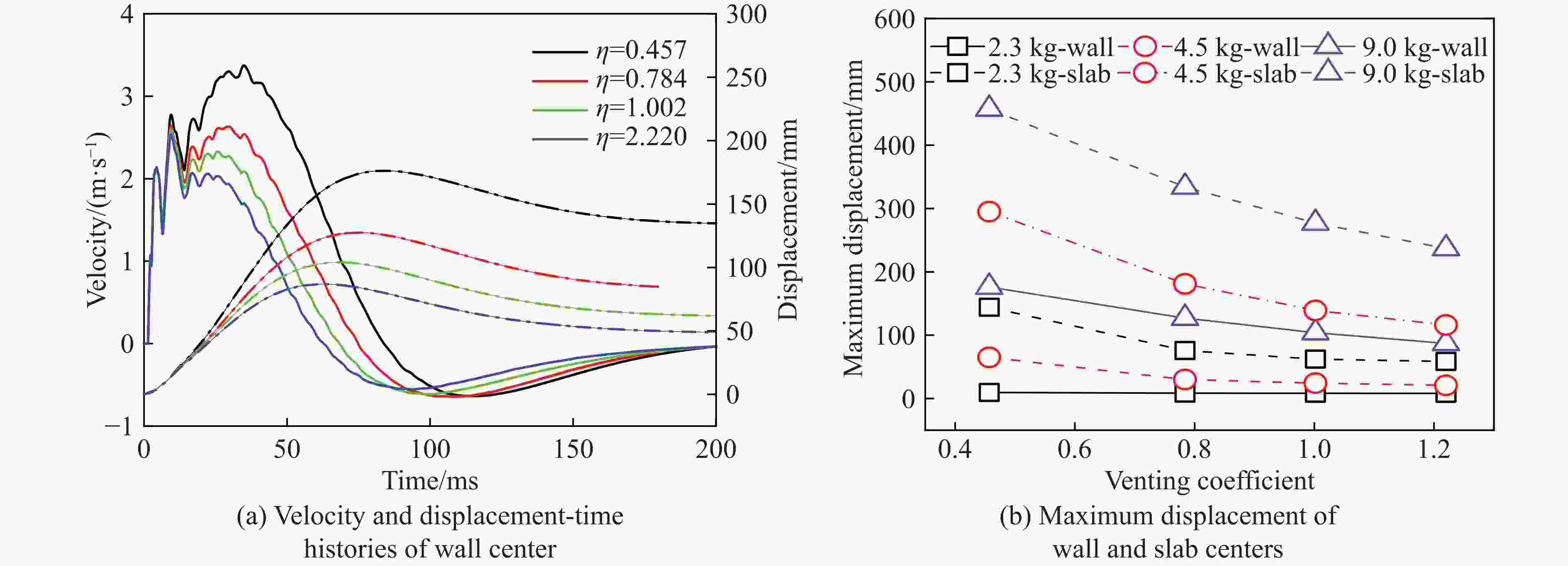 摘要: 爆炸冲击波在钢筋混凝土(reinforced concrete,RC)箱型结构中难以向外自由扩散,经多次反射叠加后可加剧结构的破坏。为全面探究RC箱型结构内爆炸载荷特性及其动力行为特征,通过复现完全密闭和半密闭(带泄爆口)RC箱型结构的内爆炸试验,验证了所采用有限元建模和分析方法的适用性。进一步,针对典型RC箱型结构和美国联邦应急管理署规定的爆炸恐怖袭击类型,开展了3种爆炸威胁和4种泄爆面积下的内爆炸数值模拟分析,考察了结构内壁面中心和内角隅处的载荷及其分布以及结构的动力行为特征。结果表明:泄爆面积对各特征点爆炸波峰值超压的影响较小,而爆炸波冲量随泄爆面积的增大近似呈指数形式降低;结构内壁面的载荷分布受结构尺寸的影响显著,呈内凹或W形;当泄爆系数从0.457增大至1.220时,墙板最大位移可降低50%以上;相较于超压准则,冲量准则可以更准确地评估构件毁伤等级。最后,提出了考虑泄爆面积的冲量增强因子和毁伤增强因子计算方法,能够较好地预测不同泄爆系数下的内爆炸载荷和结构动力行为。Abstract: In a reinforced concrete (RC) box structure, the dissipation of blast waves is restricted, and damage to the structure can be intensified due to multiple reflections. To thoroughly investigate the load characteristics and dynamic behavior of internal explosions in an RC box structure, the applicability of the finite element method was verified by replicating internal explosion tests on fully enclosed and semi-enclosed (with venting openings) RC box structures. Based on this, numerical simulations of internal explosions were conducted for the prototypical RC box structure and the type of terrorist bombing attacks specified by the Federal Emergency Management Agency under three explosion scenarios and four venting areas. The influence of venting area on the load characteristics at the inner surfaces and corners, the load distribution on the inner surfaces, and the time histories of displacement and velocity at the centers of the inner surfaces under internal explosion loads were explored. Additionally, a formula for calculating the total impulse of the structure’s inner surface was proposed, considering both the venting area and the spatial distribution of the impulse. The results show that the venting area has a negligible effect on the overpressure, while the impulse decreases exponentially with increasing venting area. The load distribution characteristics on the structure’s inner surface are significantly influenced by the structural dimensions, exhibiting an indented or W pattern. The maximum displacement at the centers of walls and slabs is reduced by about 50% as the venting coefficient changes from 0.457 to 1.220. Finally, based on the total impulse and maximum displacement response of each component under free-field explosion loads, a calculation method for the impulse and damage enhancement coefficient was proposed based on the venting area, effectively predicting the internal explosion load and the structure’s dynamic behavior at various venting coefficients.