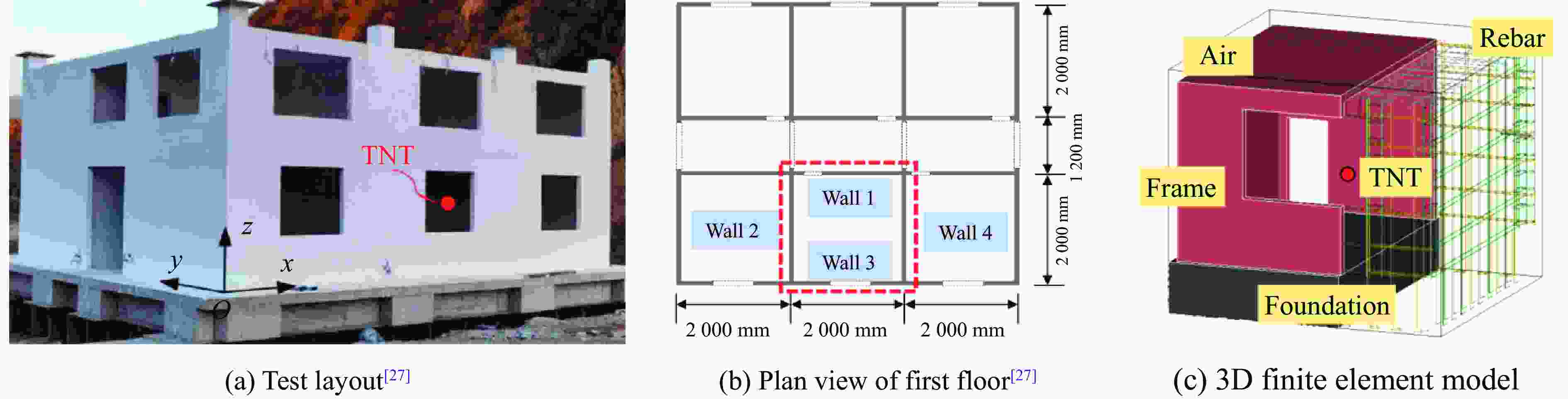 工况 TNT当量/g 2D模型 3D模型 来源 炸药尺寸/mm 空气网格尺寸/mm 等效炸药网格密度 空气网格尺寸/mm 结构网格尺寸/mm 1 720 76.2×76.2 12.0×12.0 255.8 72×72×72 36×36×36 文献[22-23] 2 315 57.8×57.8 9.1×9.1 255.8 72×72×72 36×36×36 3 95.3 38.8×38.8 6.1×6.1 255.8 24×24×24 12×12×12 文献[27] 4 253.0 53.8×53.8 8.5×8.5 255.8 24×24×24 12×12×12 5 400.0 62.9×62.9 10.0×10.0 255.8 24×24×24 12×12×12 混凝土结构(*MAT_CONCRETE_DAMAGE_REL3) ρc/(kg·m−3) 抗压强度/MPa 最大失效主应变 2 400 30.0/40.0 0.3 钢筋(*MAT_PLASTIC_KINMATIC) 类型 直径/mm 弹性模量/GPa 泊松比 屈服强度/MPa 拉伸强度/MPa 最大伸长率/% D4 4 208 0.3 581 640 3.43 D6 6 205 0.3 486 670 8.87 D8 8 204 0.3 451 676 11.56 炸药(*MAT_HIGH_ENERGY_BURN和 EOS_JWL) ρe/(kg·m−3) D/(m·s−1) p/GPa A/GPa B/GPa R1 R2 $ \omega $ E0/(J·m−3) 1 630 6 930 21 370 3.747 4.15 0.9 0.35 7×109 空气(*MAT_NULL和*EOS_LINEAR_POLYNOMIAL) ρa/(kg·m−3) E/(J·m−3) γ0 pc/MPa C0 C1 C2 C3 C4 C5 C6 1.29 2.5×105 0 −0.1 0 0 0 0 0.4 0.4 0 表 3 爆炸工况设计