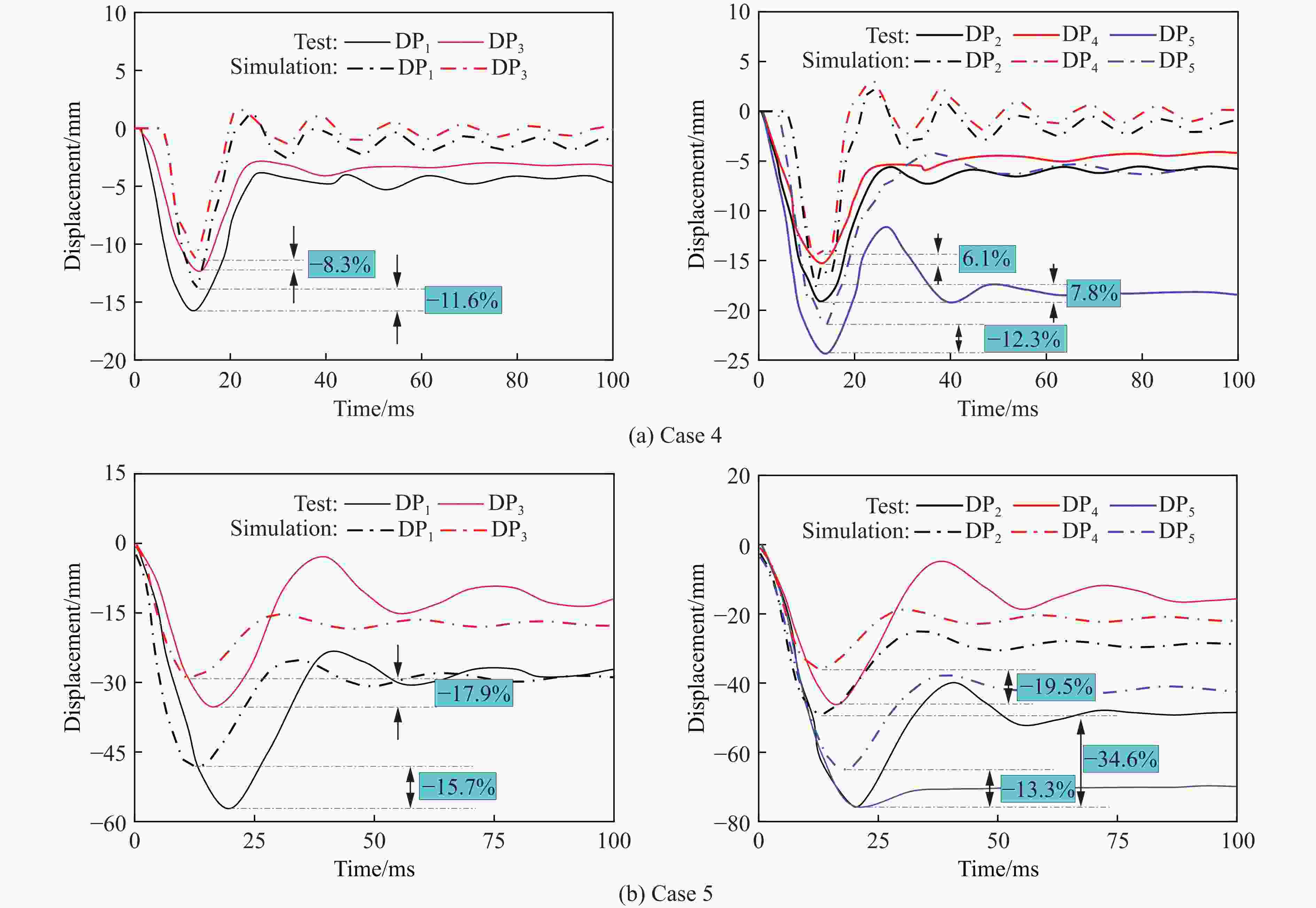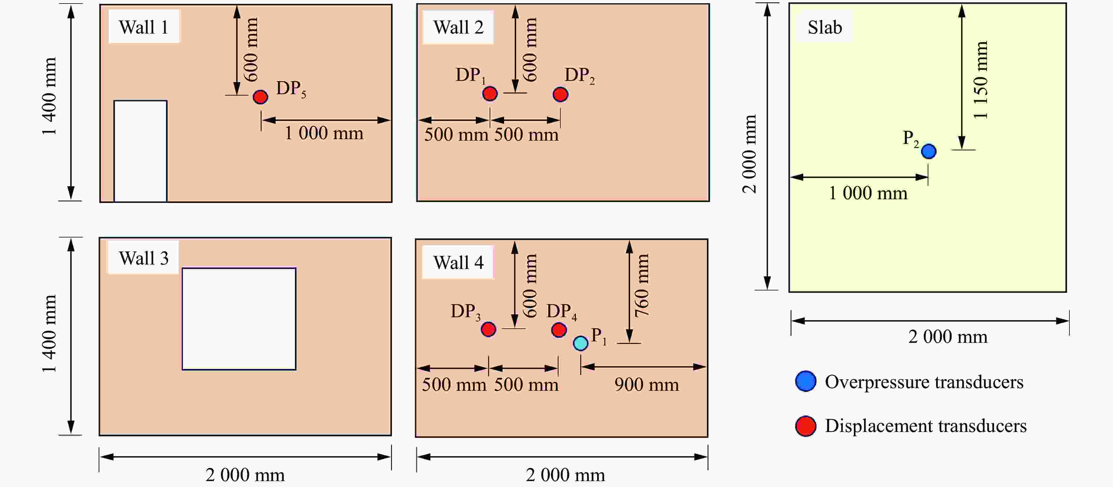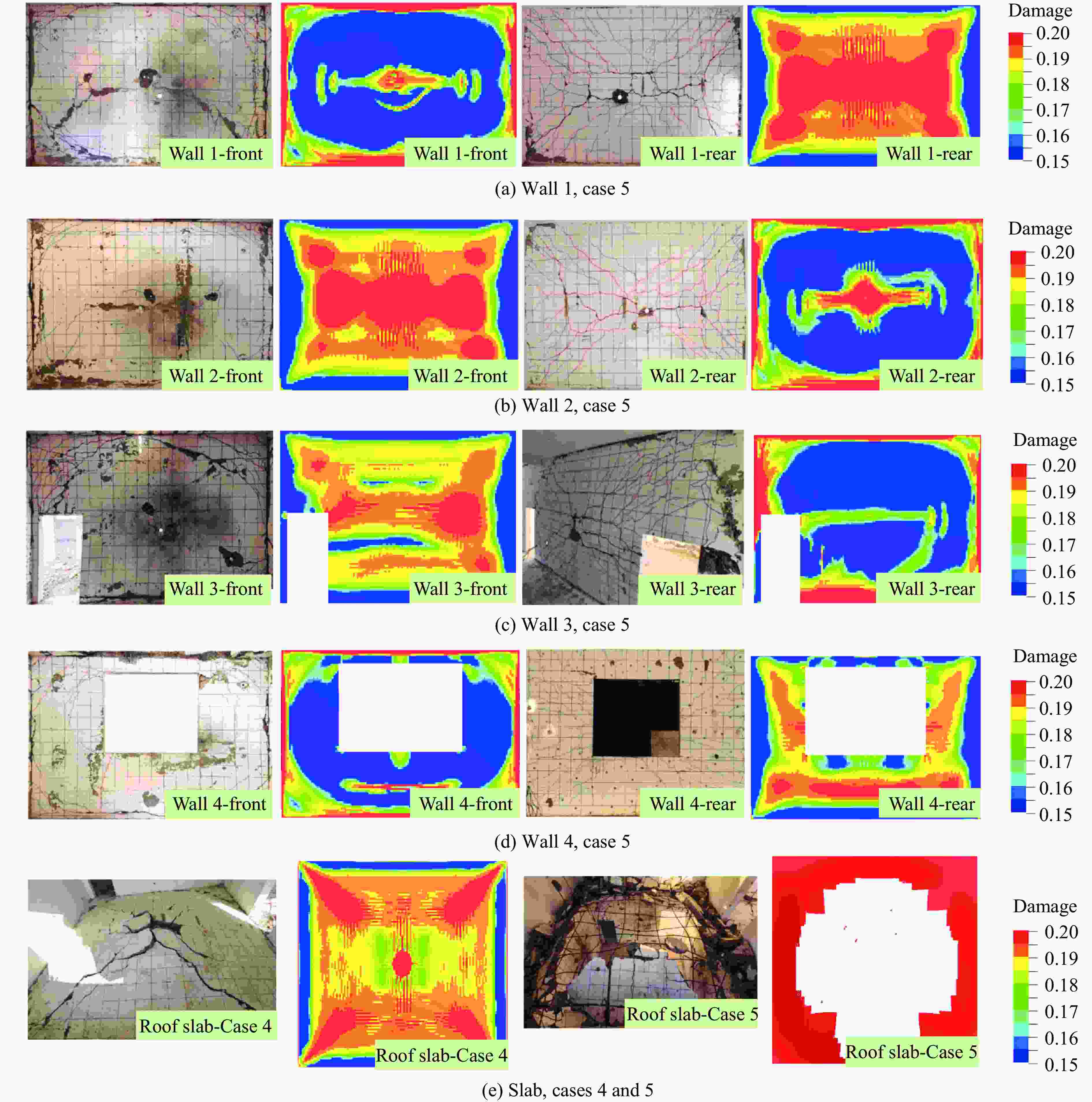 TNT当量/kg 距离/m 构件 尺寸/mm 厚度/mm 位移/mm 2.3 1.41 顶板 5 000×5 000 180 19.8 2.38 墙 3 000×5 000 240 1.5 4.5 1.41 顶板 5 000×5 000 180 50.0 2.38 墙 3 000×5 000 240 9.9 9.0 1.41 顶板 5 000×5 000 180 122.0 2.38 墙 3 000×5 000 240 45.0 -
