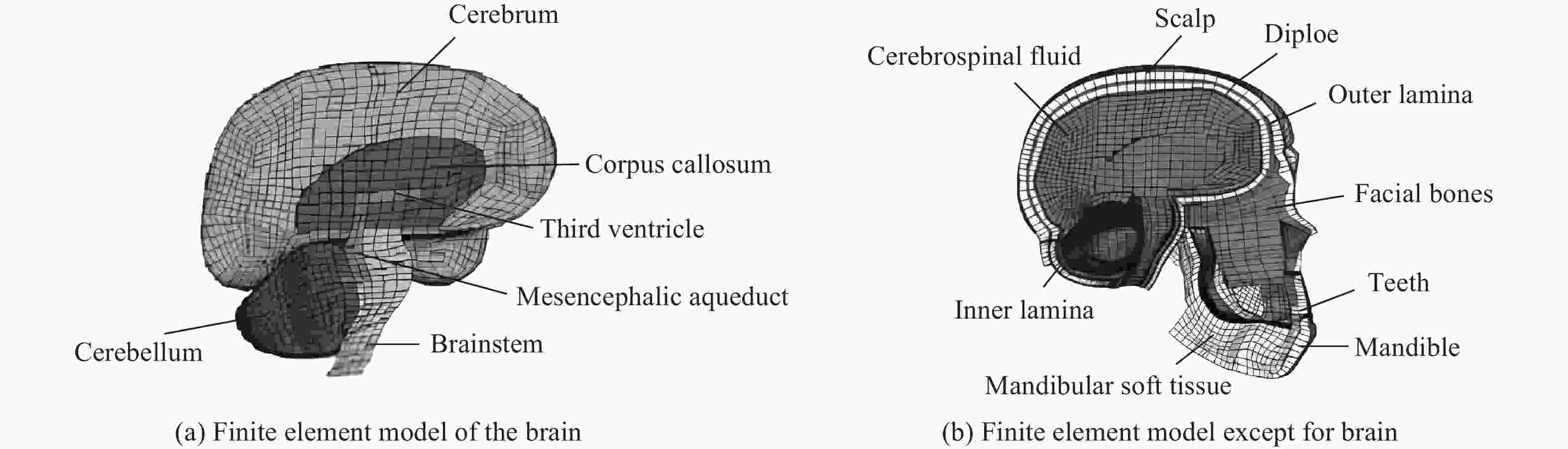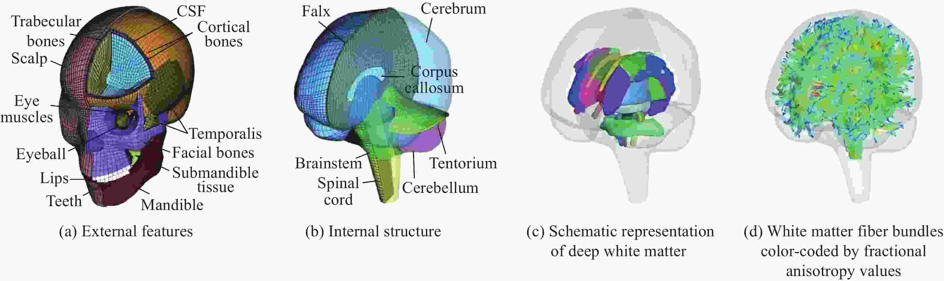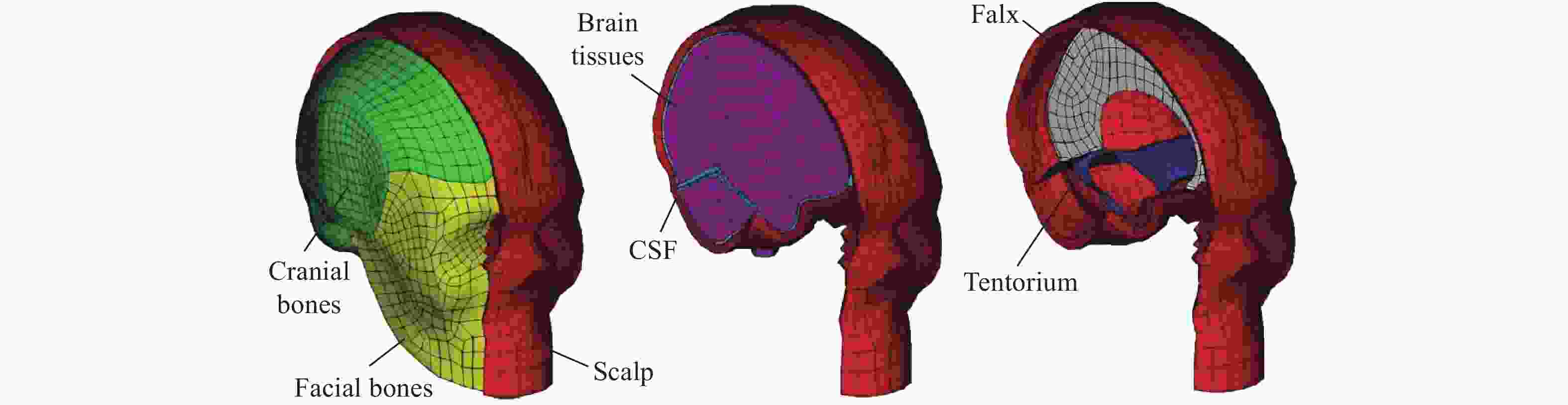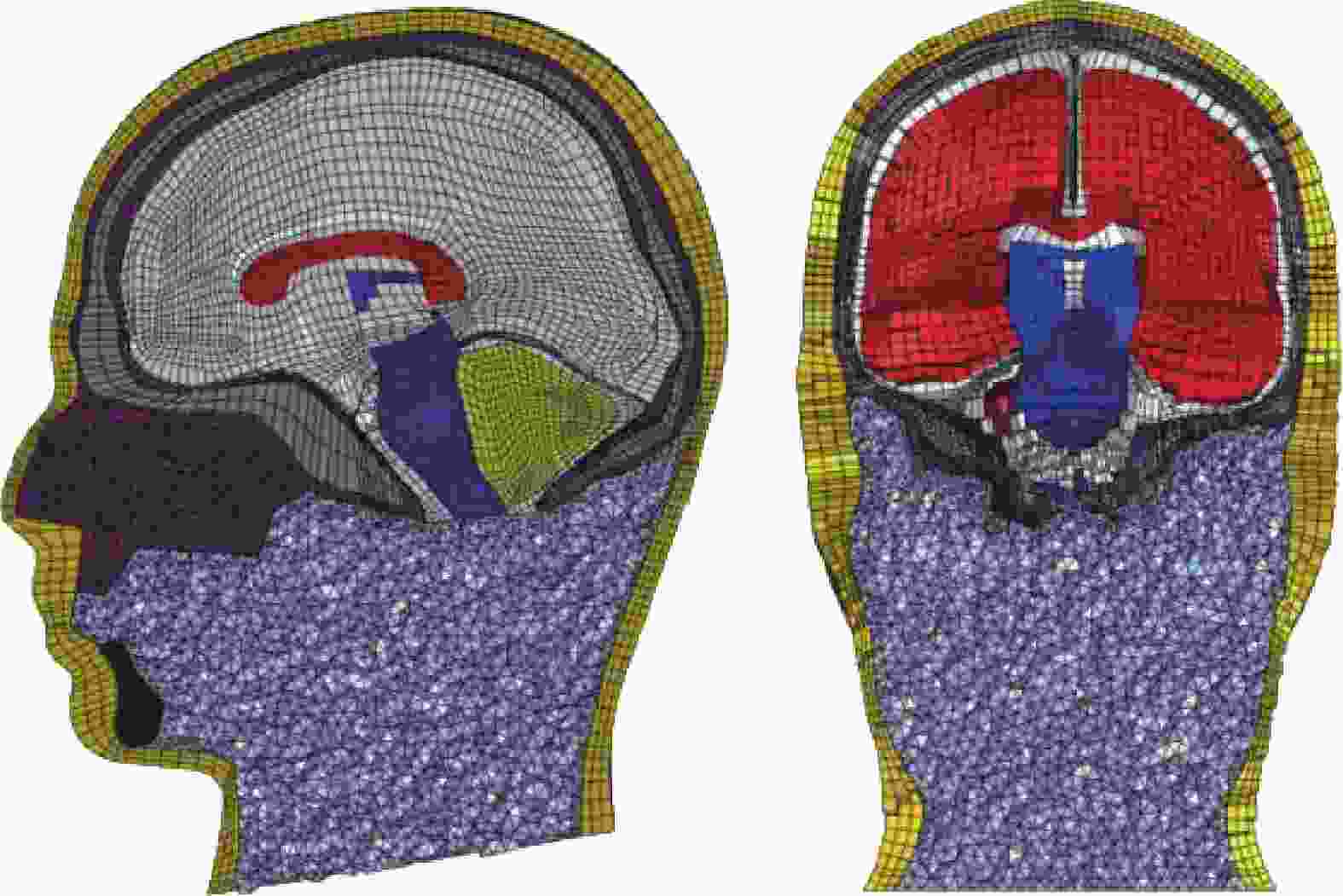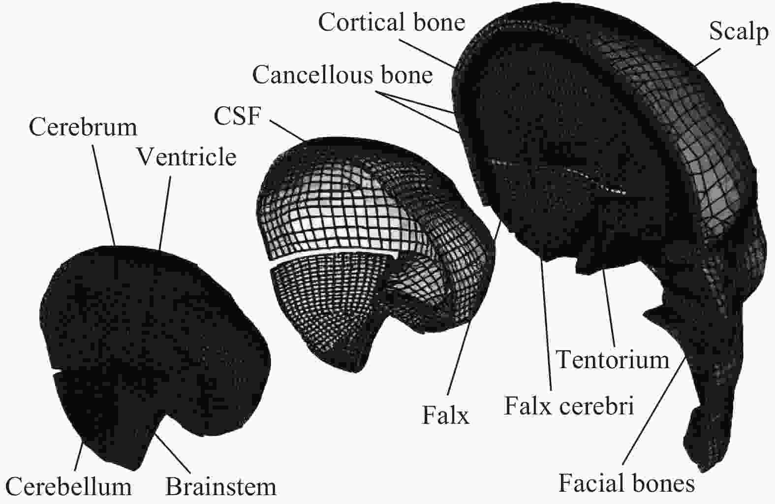 及TBI机制研究Kang等[105] 1997 修改后的模型包括皮肤、颅骨、面部、大脑、小脑、硬脑膜、蛛网膜下腔、大脑镰和小脑幕等结构;除了大脑是黏弹性材料,其余结构均定义为均匀且各向同性 13 208 Deck等[107] 2004 针对颅骨皮质骨和松质骨选用了不同的材料参数,整体模型采用弹塑性材料模型 74 243 UCDBTM模型 Horgan等[115] 2003 模型包括头皮、三层头骨、硬脑膜、