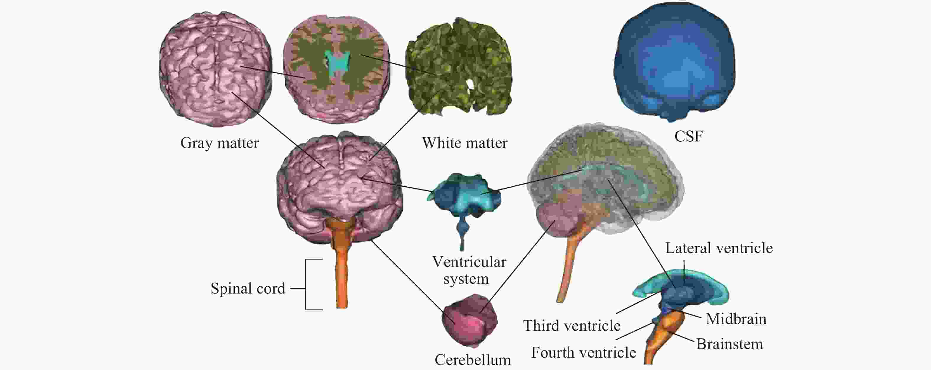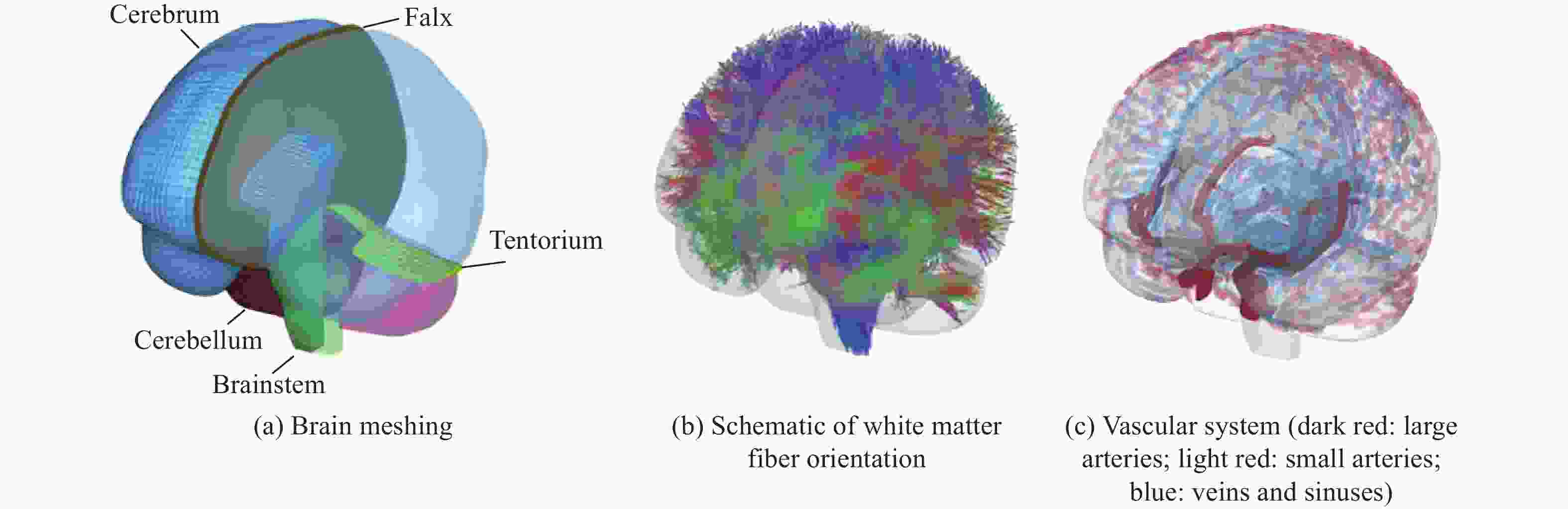 将脉管系统合并到KTH模型中/ Giordano等[35] 2014 使用各向异性的超粘弹性纤维增强各向异性模型来描述脑组织的力学行为 / Zhou等[41] 2019 使用流固耦合方法(FSI)修改了初始KTH模型中的脑-颅骨界面 增加了CSF单元 Li等[48] 2021 增加了大脑皮层表面的沟回结构,
