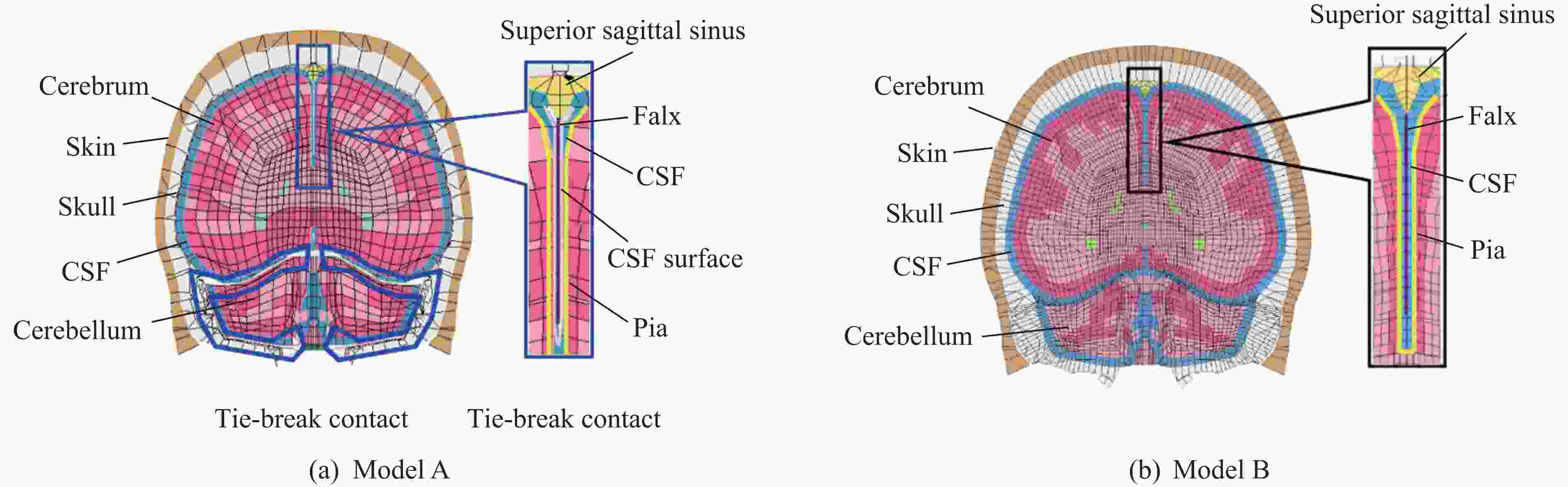 修改固定接触为共节点连接共节点连接 Atsumi等[82] 2018 补充了深部脑区(胼胝体、边缘系统等)的解剖细节,采用具有各向异性、应变率依赖性及卸载特定的本构模型 62 048 Atsumi等[83] 2021 对脑脊液应用不可压缩流体动力学