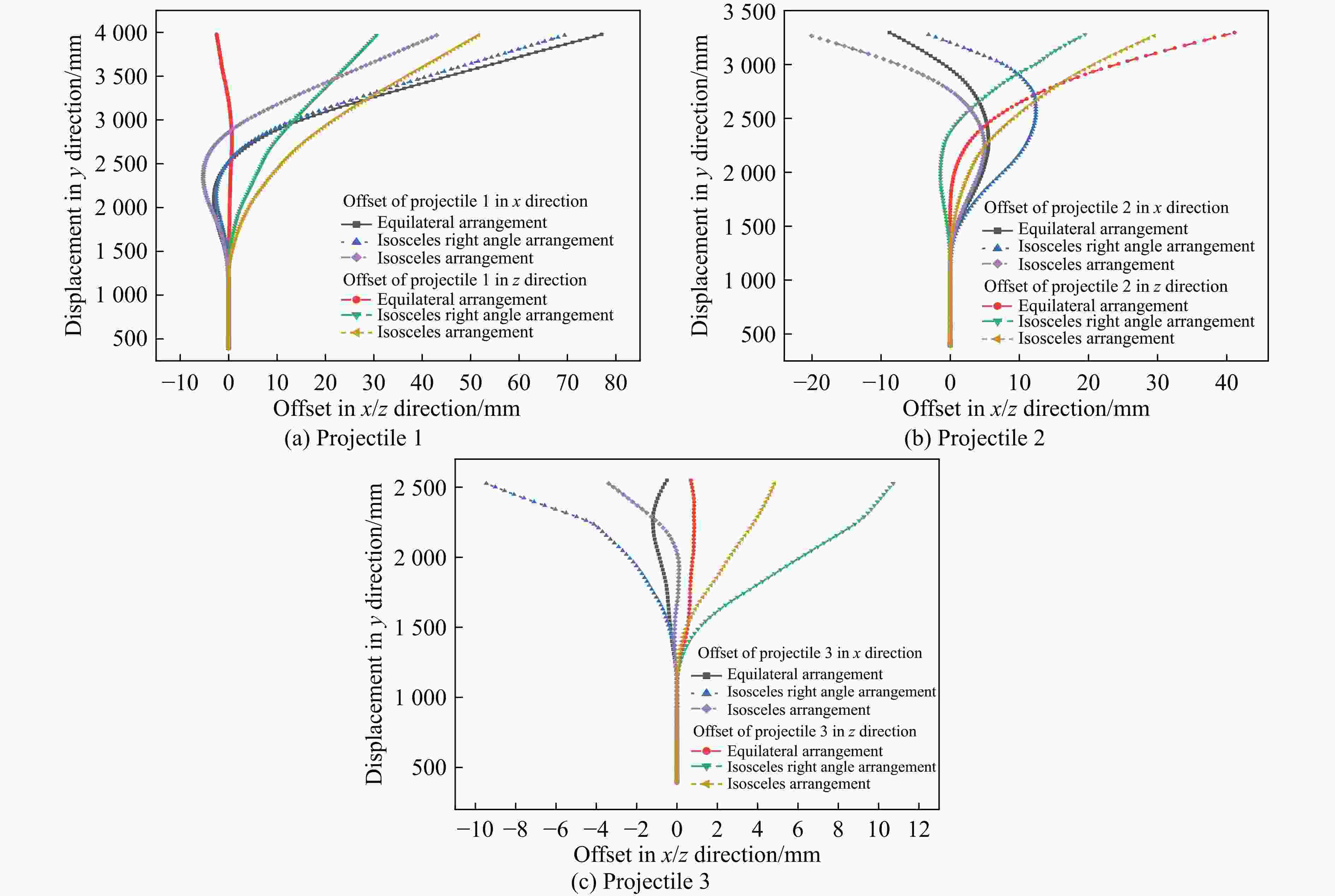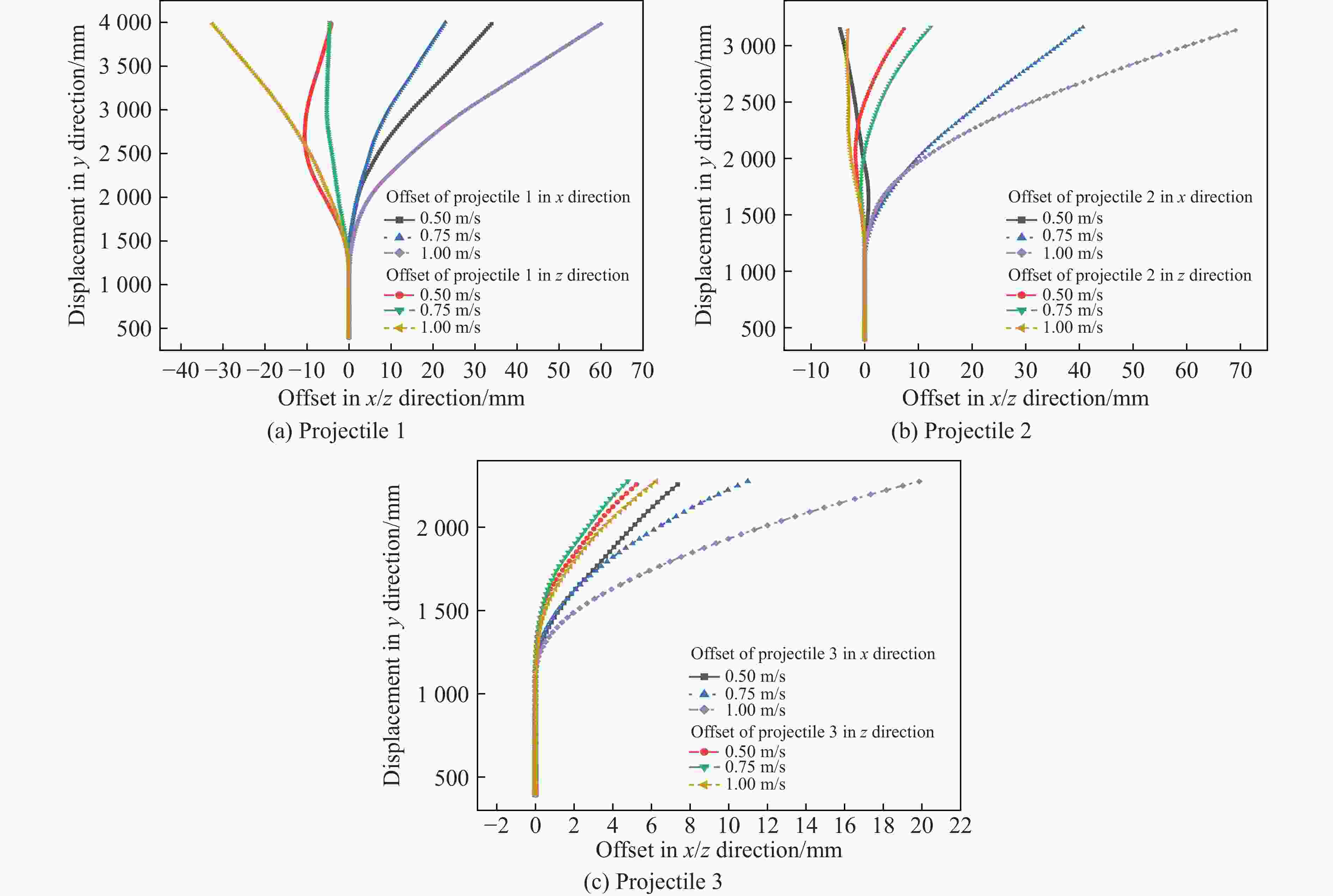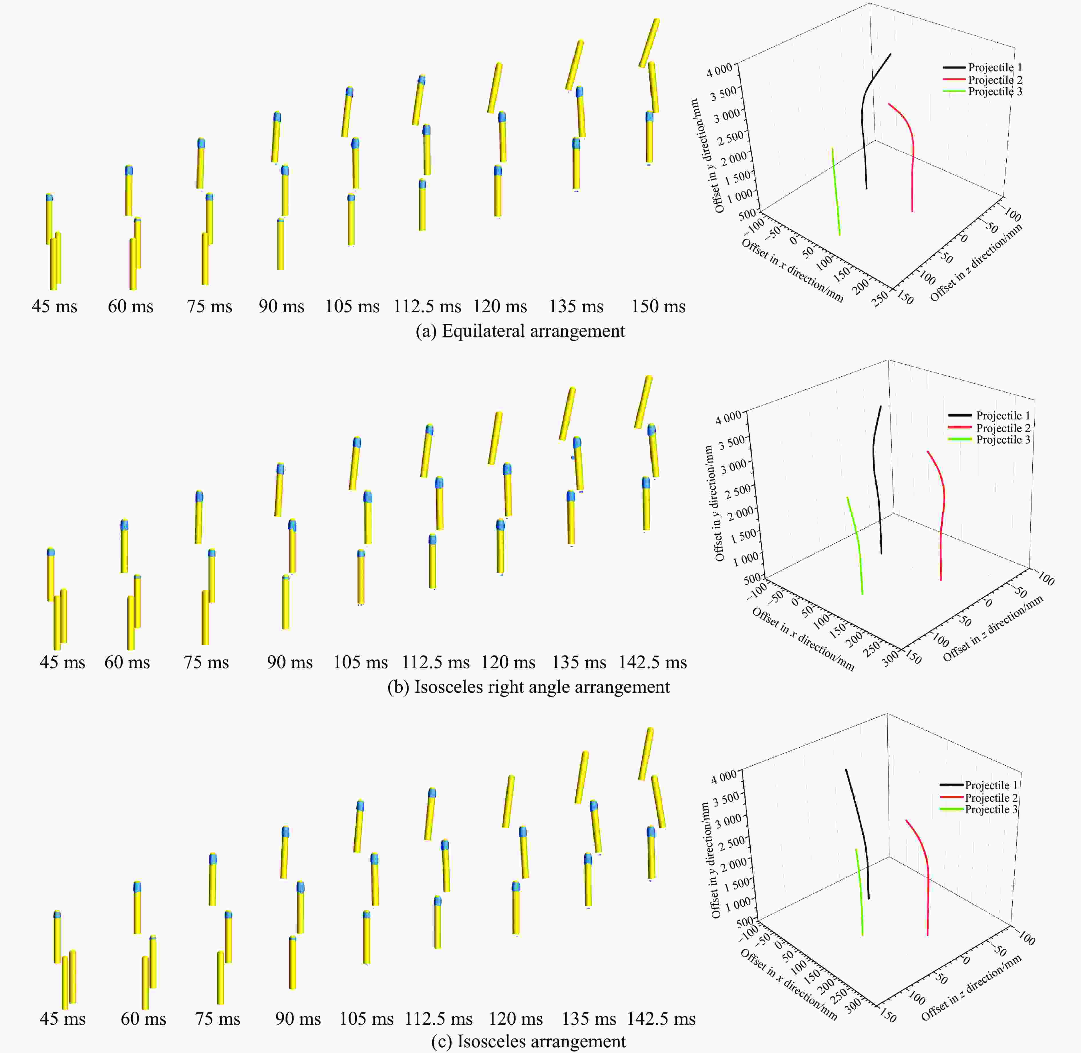 (m·s−1)航行体1弹道偏移/mm 航行体2弹道偏移/mm 航行体3弹道偏移/mm x方向 z方向 总偏移 x方向 z方向 总偏移 x方向 z方向 总偏移 0.50 33.95 −4.11 34.20 −4.60 7.33 8.65 7.36 5.23 9.03 0.75 22.94 −4.59 23.39 40.65 12.25 42.46 10.99 4.78 11.98 1.00 59.98 −32.54 68.24 69.07 −3.13 69.14 19.86 6.23 20.81 最大偏移 68.24 69.14 20.81 -