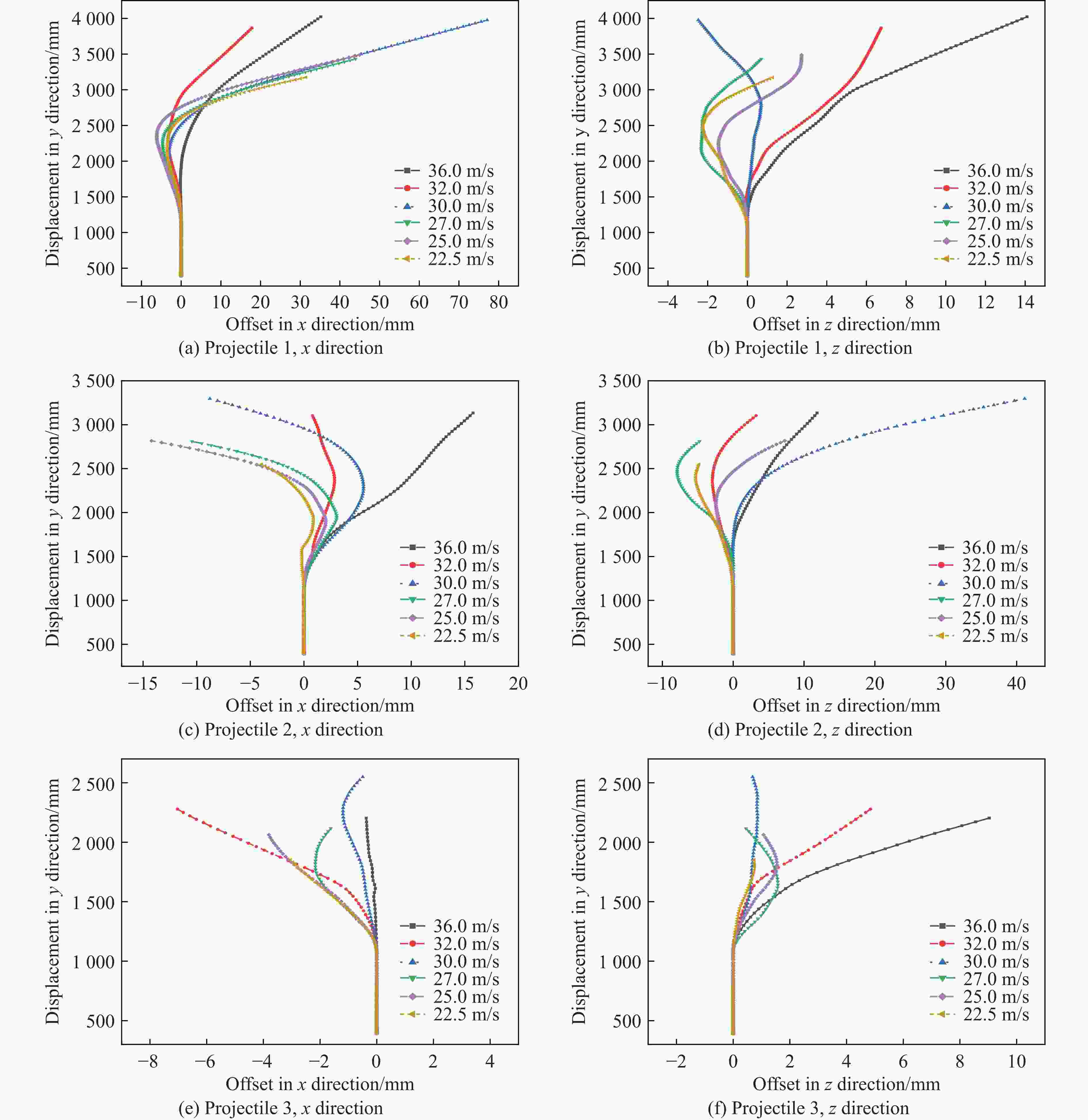 速度/(m·s−1) 航行体1弹道偏移/mm(hy =3 000 mm) 航行体2弹道偏移/mm(hy =2 500 mm) 航行体3弹道偏移/mm(hy =1 850 mm) x方向 z方向 总偏移 x方向 z方向 总偏移 x方向 z方向 总偏移 36.0 9.07 5.33 10.52 10.55 4.92 11.64 −0.22 4.13 4.14 32.0 1.11 4.73 4.86 2.63 −2.72 3.78 −3.21 2.06 3.81 30.0 15.09 0.46 15.10 5.11 6.43 8.21 −0.60 0.68 0.91 27.0 15.24 −1.24 15.29 −1.08 −7.89 7.96 −2.15 1.35 2.54 25.0 11.65 1.58 11.76 −3.38 0.53 3.42 −3.12 1.53 3.47 22.5 18.34 −0.17 18.34 −3.28 −5.05 6.02 −3.04 0.74 3.13 最大偏移 18.34 (22.5 m/s) 11.64 (36 m/s) 4.14 (36 m/s) 表 4 不同横流速度下航行体的弹道偏移