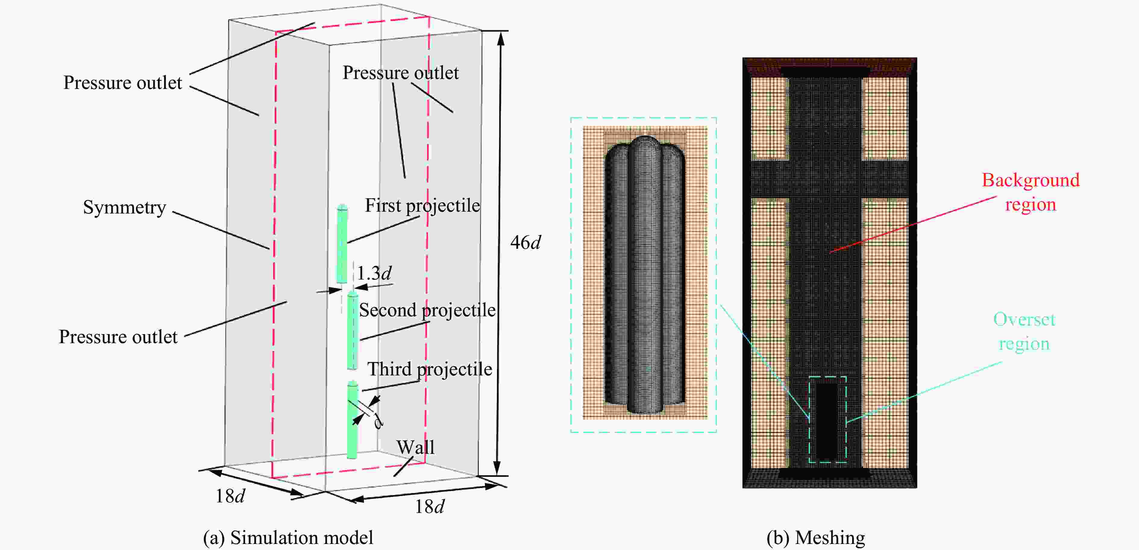 摘要: 多航行体水下发射过程中,航行体处于复杂多变的流场环境,其运动弹道偏转不仅受初始速度、横流等条件的影响,还受多体间相互干扰效应的制约。为研究多体水下发射的空泡演化与弹道干扰特性,基于重叠网格技术与有限体积法,结合六自由度运动模型,建立了多体水下发射数值仿真模型,系统分析了空间排列方式、发射速度及横流对弹道偏转的影响机制。结果表明:空间排列方式对弹道偏移的影响较小,实际应用中可采用等边三角形排列以优化发射空间利用率;发射速度增大时,航行体尾涡干扰加剧,流场扰动显著增强,导致弹道间相互干扰效应更加明显;横流速度的增加会加剧模型肩部空泡发展的不对称性,当横流速度超过0.75 m/s时,横流成为弹道偏转的主导因素。研究结果可为多体水下发射的弹道预测和布局优化提供理论依据。Abstract: During the underwater launch of multiple projectiles, each projectile operates within a highly complex and dynamic flow field, where its trajectory deflection is influenced by a combination of factors. These factors include initial conditions such as the projectile’s velocity and the presence of crossflow, as well as the mutual interference effects among the projectiles. To gain a deeper understanding of the cavitation evolution and trajectory interference characteristics during the underwater launch of multiple projectiles, this study develops a comprehensive numerical simulation model. The model integrates the overlapping grid technique and the finite volume method and is coupled with a six-degree-of-freedom (6-DOF) motion model. Through this model, the influence mechanisms of spatial arrangement, launch velocity, and crossflow on trajectory deflection are systematically analyzed. The results of this study reveal several important findings. First, the spatial arrangement of the projectiles has a relatively minor impact on trajectory deflection. An equilateral triangular configuration is found to be an optimal choice for practical applications, as it maximizes the efficient utilization of the launch space. Second, as the launch velocity increases, the wake interference between projectiles becomes more pronounced. This intensified interference leads to significant disturbances in the flow field and stronger mutual trajectory interference among the projectiles. Third, higher crossflow velocities exacerbate the asymmetric development of cavitation near the projectile shoulders. When the crossflow velocity exceeds 0.75 m/s, it becomes the dominant factor influencing trajectory deflection. These research findings provide a robust theoretical foundation for trajectory prediction and layout optimization in the underwater launch of multiple projectiles.
