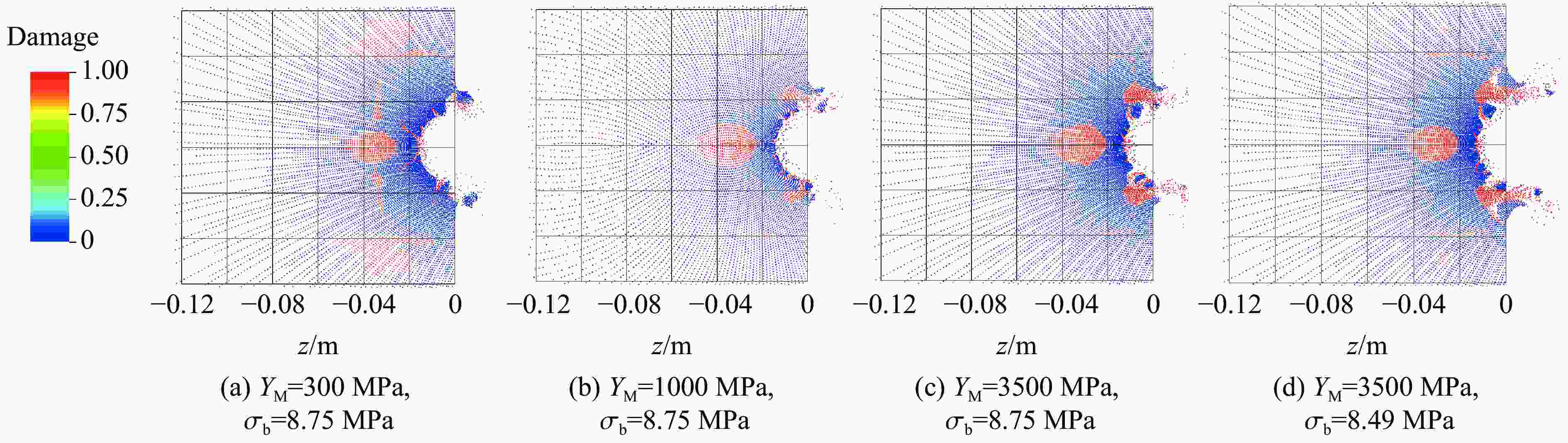 YM/MPa m k/(m−3) σb/MPa 坑直径/mm 坑深度/mm β ɛd/% 300 9.5 9.0×1039 8.75 49 16 2.21 4.35 1 000 9.5 9.0×1039 8.75 49 15 2.15 33.84 3 500 9.5 9.0×1039 8.75 48 13 2.20 48.04 3 500 9.5 1.2×1040 8.49 68 14 2.58 44.69 表 6 不同$ {Y}_{0} $的$ m $、$ k $参数
