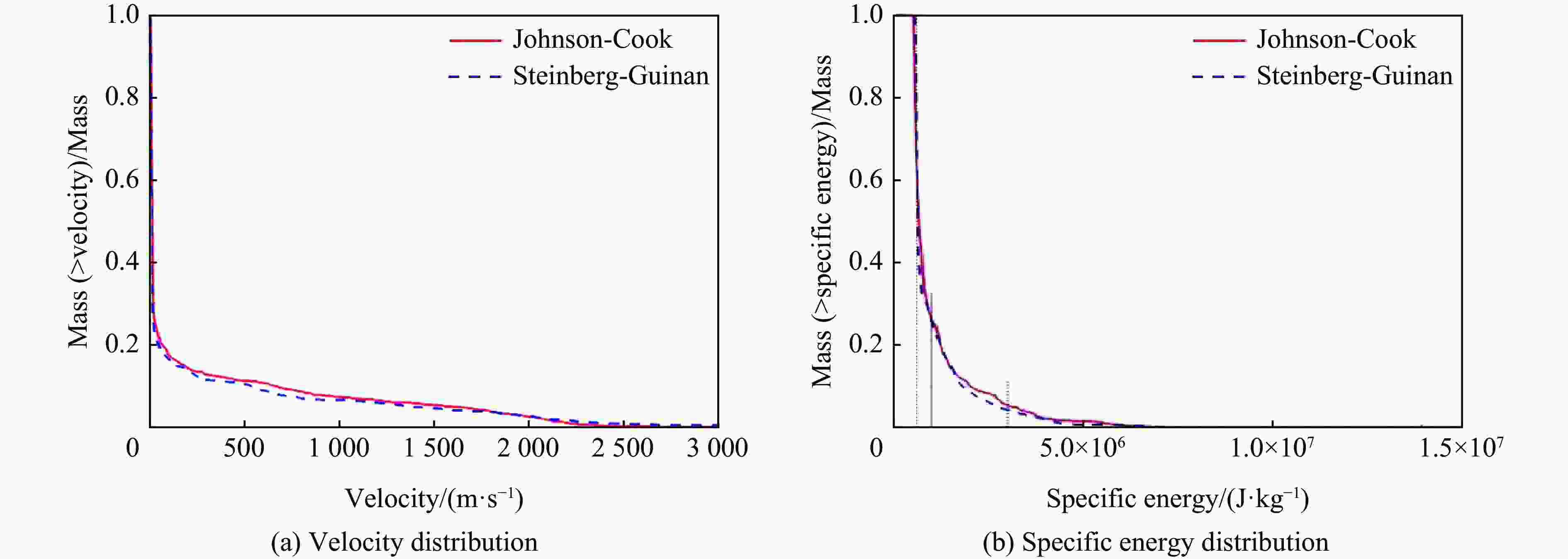 工况 强度模型 Y0/MPa 损伤模型 σb/MPa 坑直径/mm 坑深度/mm β 1 Lundborg 26.5 Benz-Asphaug概率 9.62 48 15 2.19 2 恒定强度 66.0 Benz-Asphaug概率 9.85 38 16 2.20 3 Lundborg 26.5 最大拉应力 33.0 50 15 2.20 4 Drucker-Prager 146.0 最大拉应力 50.0 84 12 2.22 表 5 不同极限强度下的仿真结果
