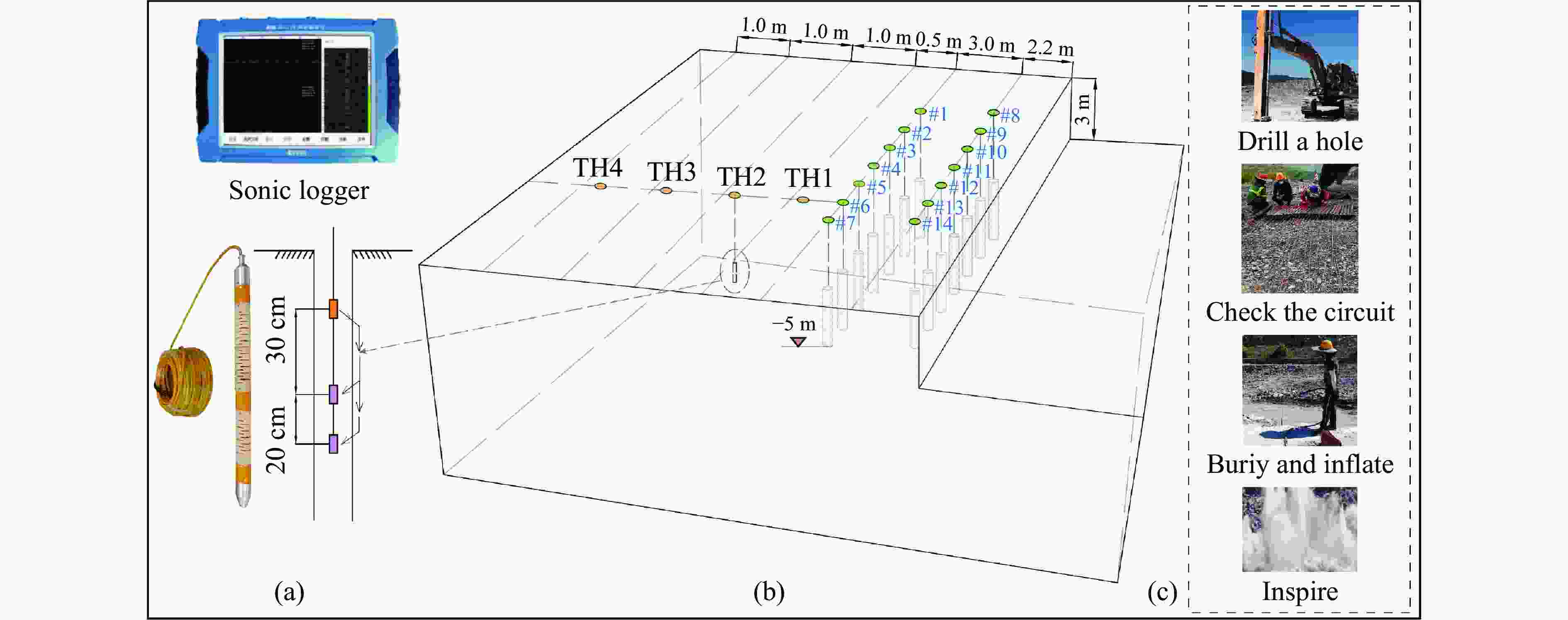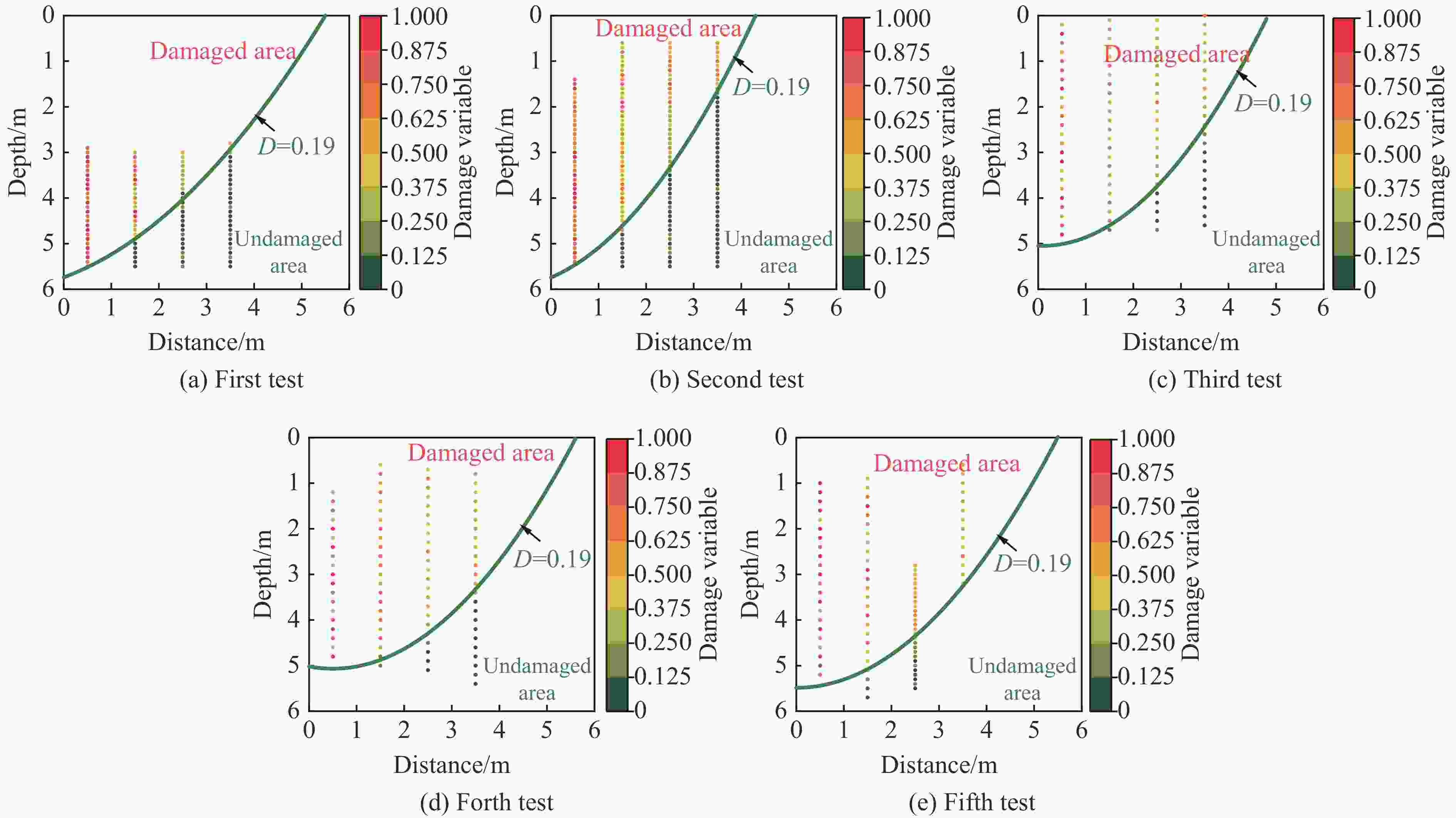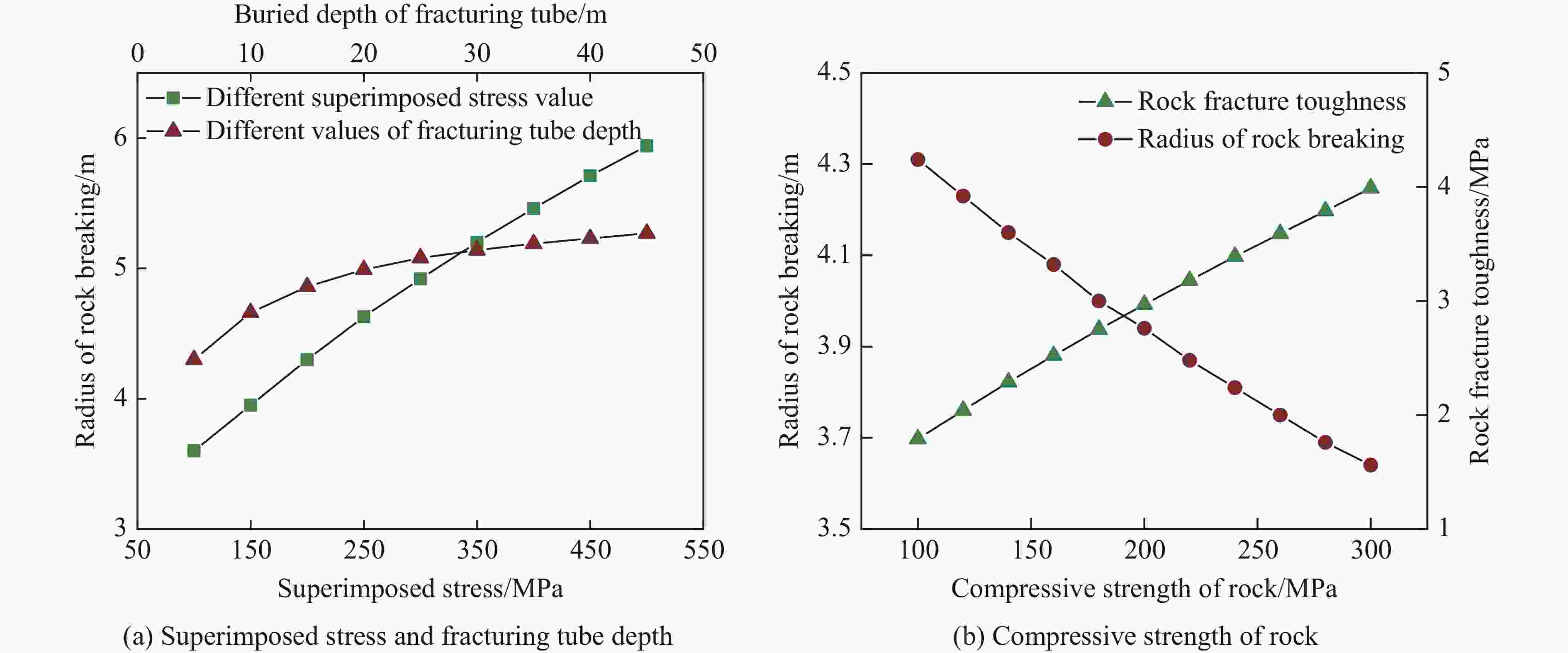 • 摘要: 超临界CO2相变破岩是冲击波与高压气体协同作用下的动态破坏过程。为深入探究多孔同步激发与地应力耦合条件下的超临界CO2相变破岩机制,针对CO2现场破岩实际工况,基于薄壁圆筒理论解析了单孔初始破岩压力,结合一维爆生气体膨胀理论,构建了地应力作用下多孔冲击波与高压气体联合破岩半径预测模型,并通过现场多孔CO2相变破岩试验进行了对比验证。结果表明:当致裂管埋深较浅时,地应力对岩体应力分布的影响较微弱;当单孔压力一致时,致裂孔数量越多,各孔的叠加峰值应力越大,在垂直于测试孔布置方向,各孔的峰值应力均呈U型抛物线分布,两端的致裂孔的叠加应力最大,而在平行于测试孔布置方向,各孔的峰值应力均呈倒U型抛物线分布,中部致裂孔的叠加应力最大。此外,利用声波测试得到的现场多孔冲击下岩体损伤破坏范围呈三维漏斗形状,竖向损伤破坏范围在5.05~5.73 m之间,平面损伤破坏范围在4.3~5.6 m之间,其中平面损伤破坏范围测试值与理论计算值的相对误差在5.0%~18.7%之间,计算误差多来自各致裂孔叠加应力的不均匀性。进一步分析可知:超临界CO2相变破岩半径随致裂孔叠加应力呈半抛物线式增长,随致裂孔深度呈对数式增长;当岩体抗压强度增大时,岩石断裂韧度近线性增长,对应破岩半径近线性下降。研究成果可为多孔超临界CO2相变破岩工程参数优化提供定量化设计依据。