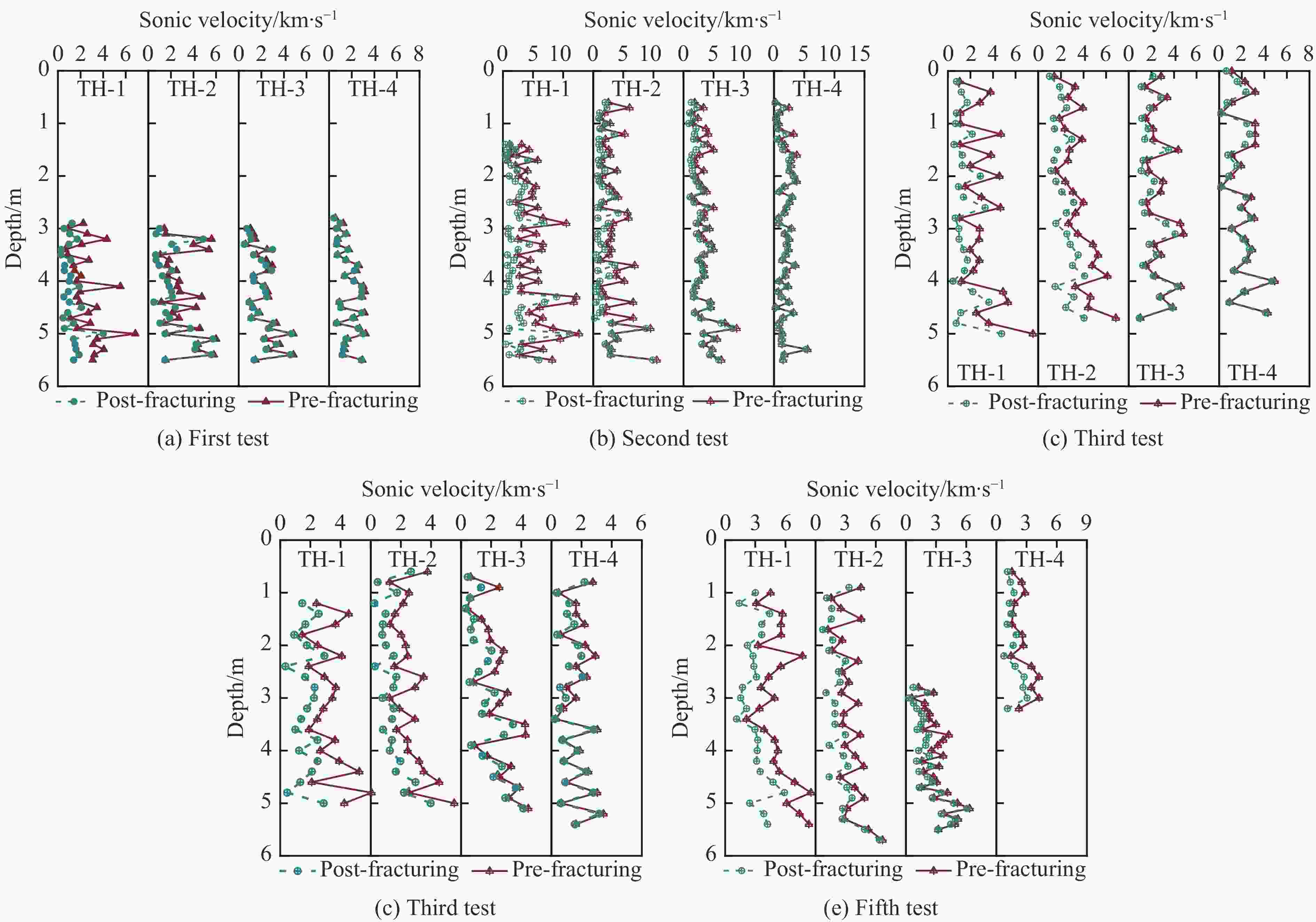 Figure  9.  Five acoustic test results of rocks before and after supercritical CO2 rock breaking