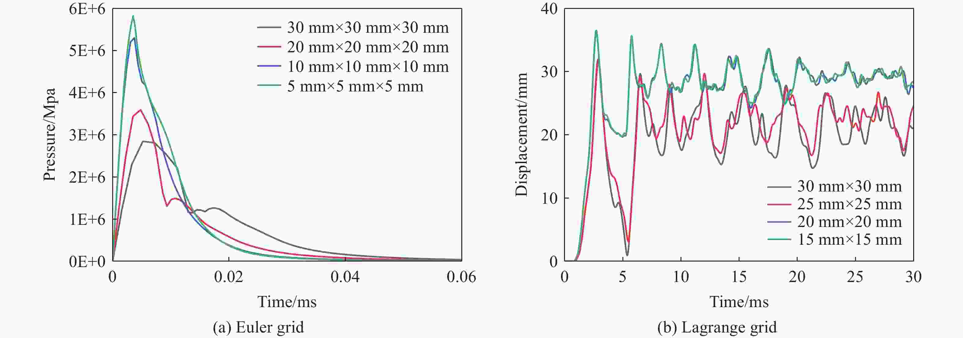 靶板材料 工况 (mTNT·V−1c)/(kg·m−3) δ/mm wexp/mm wsim/mm $ \dfrac{w_{\text{sim}} - w_{\text{exp}}}{w_{{\text{exp}}}} /{\text{%}}$ Q235 1 0.1 2.3 56.8 54.2 −4.58 2 0.1 3.7 33.9 35.8 5.60 3 0.2 4.8 37.8 39.5 4.50 表 5 靶板变形计算结果