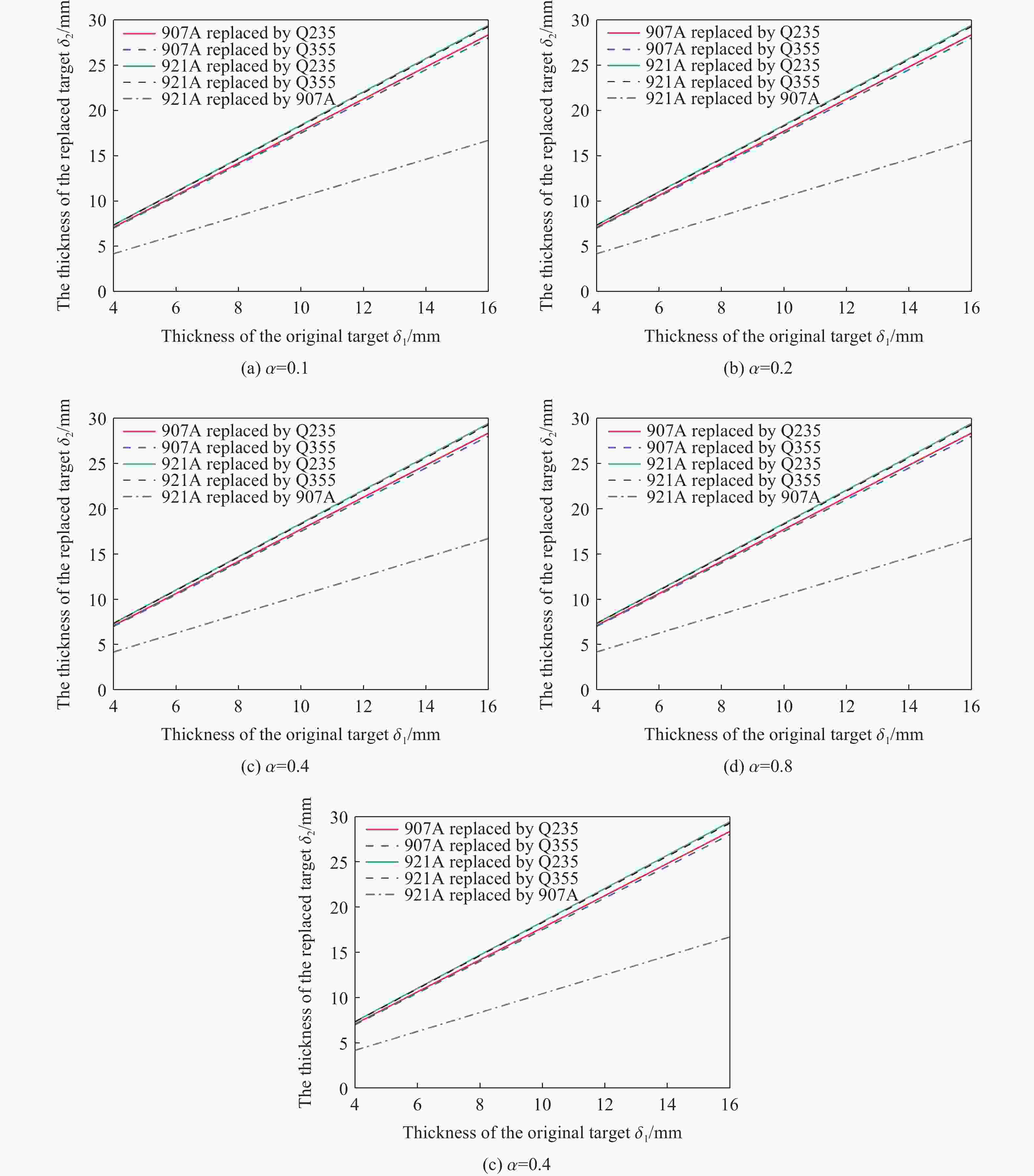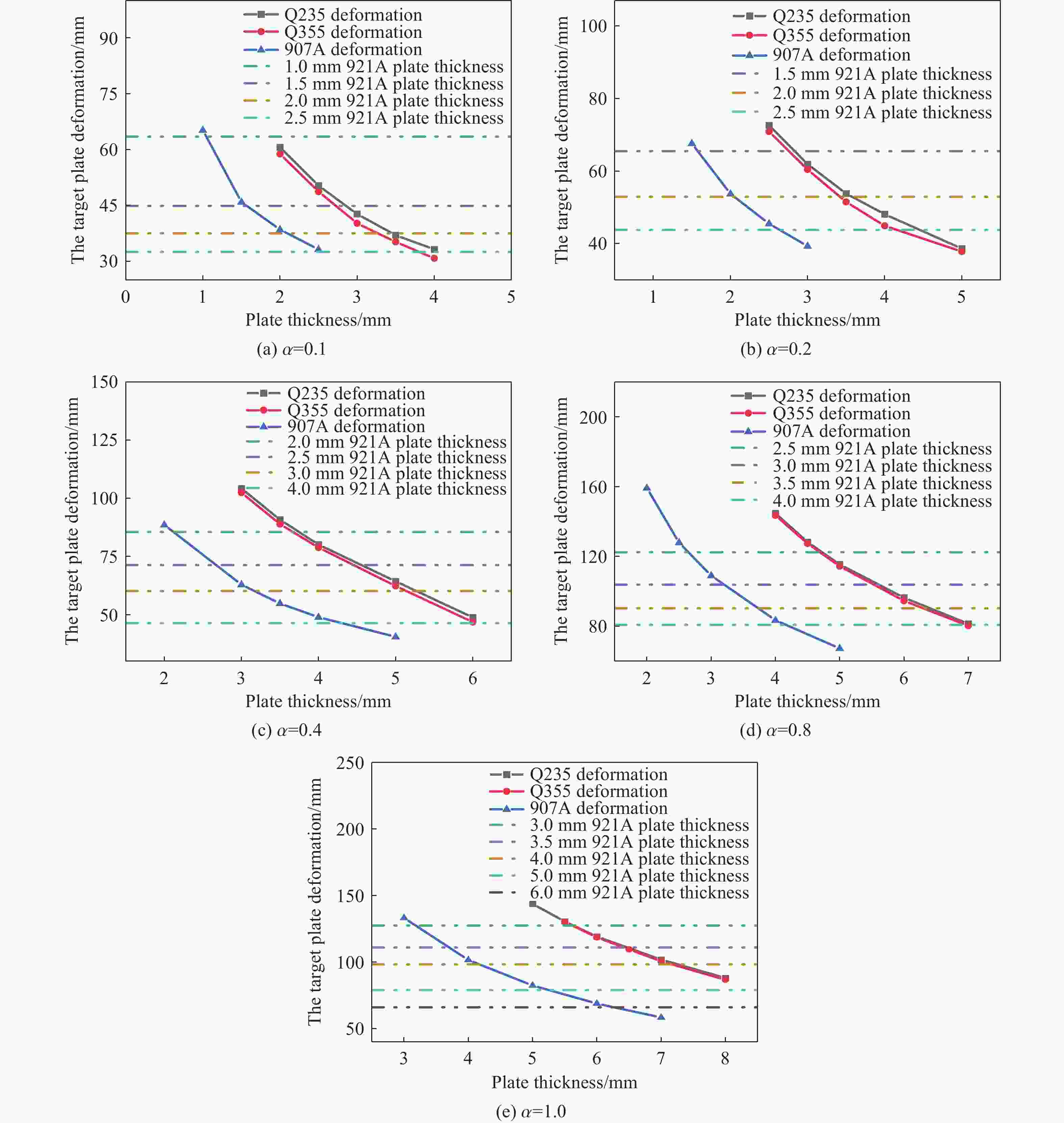 α/(kg·m−3) β 907A换成Q235 907A换成Q355 921A换成Q235 921A换成Q355 921A换成907A 0.1 1.05 5.03 0.61 0.98 0.08 0.2 1.06 5.28 0.64 1.07 0.10 0.4 1.06 5.32 0.64 1.12 0.10 0.8 1.12 5.88 0.65 1.16 0.10 1.0 1.13 5.94 0.66 1.19 0.10 表 8 907A替换成Q235后靶板变形