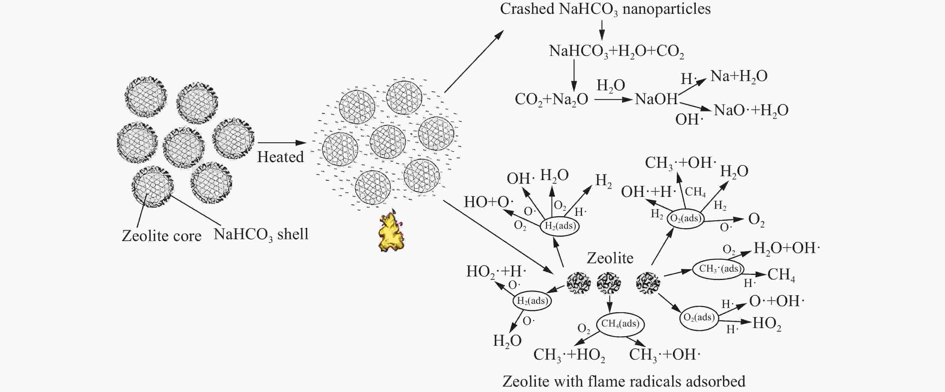 Figure  11.  Suppression mechanism of NaHCO3/zeolite hybrid powder on on gasoline pool flame[107]