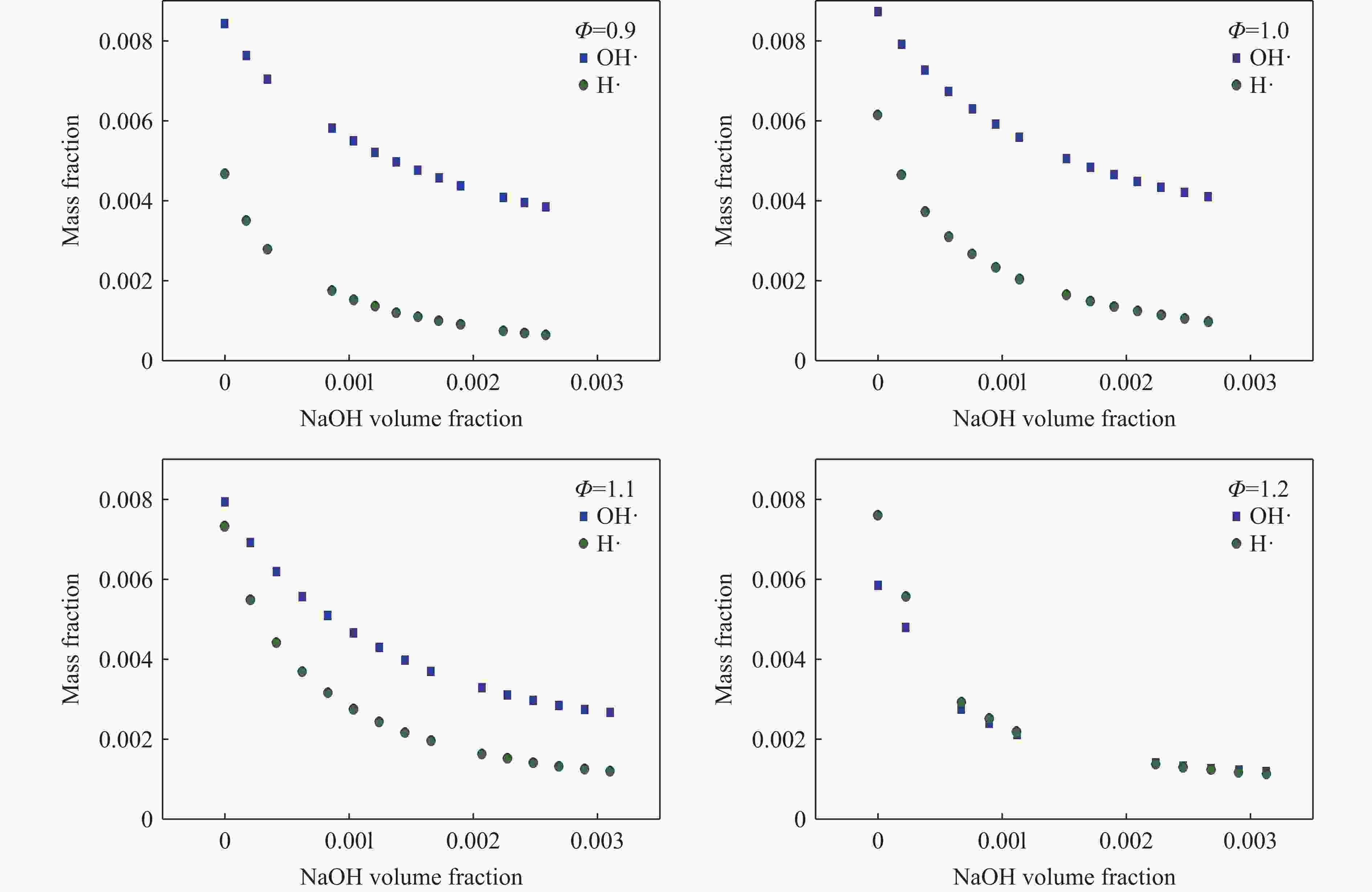 图  2  不同空燃当量比Φ下NaOH体积分数对H·和OH·自由基质量分数的影响[20]