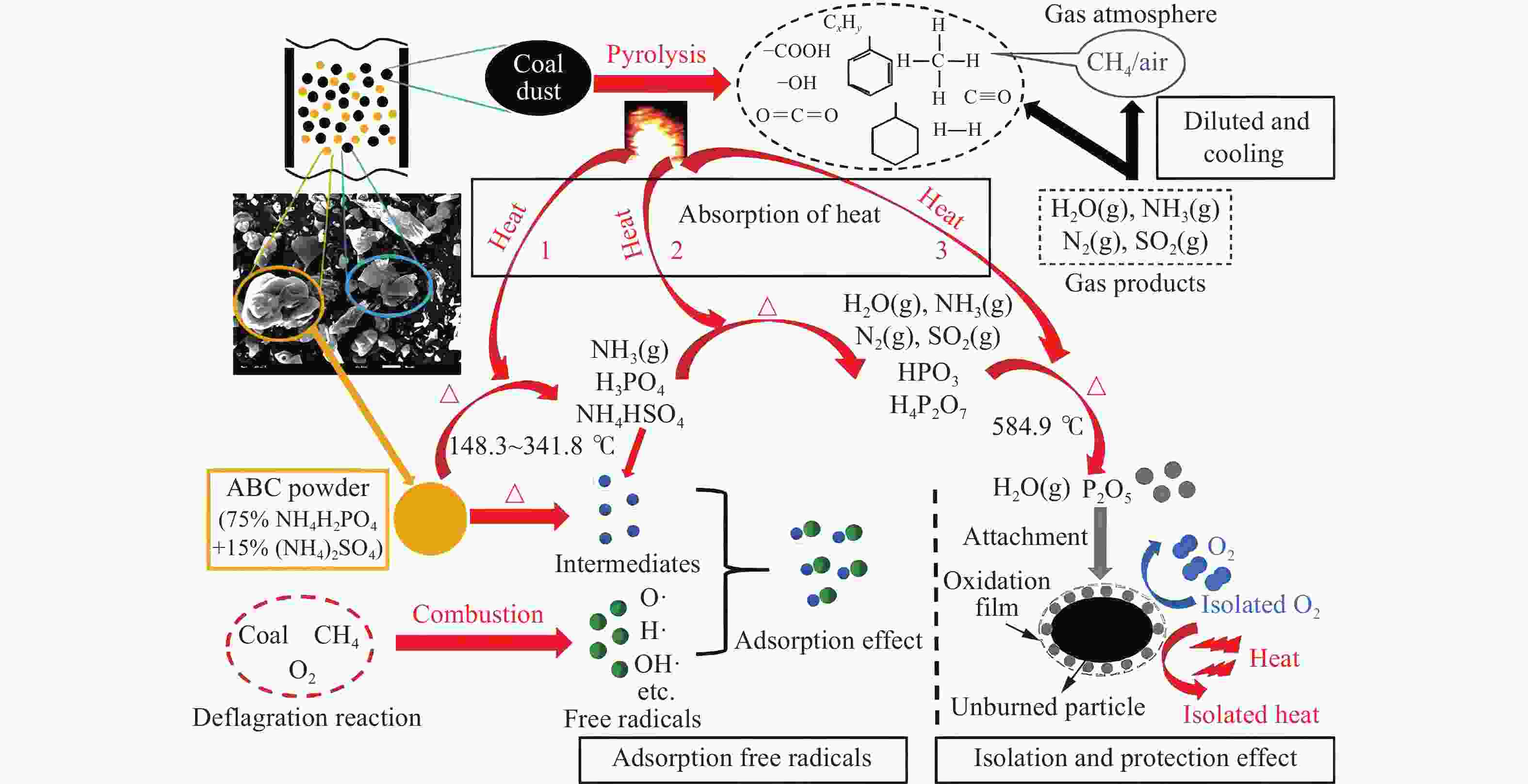 Figure  4.  Suppression mechanism of ABC powder on methane/coal hybrid explosion[33]