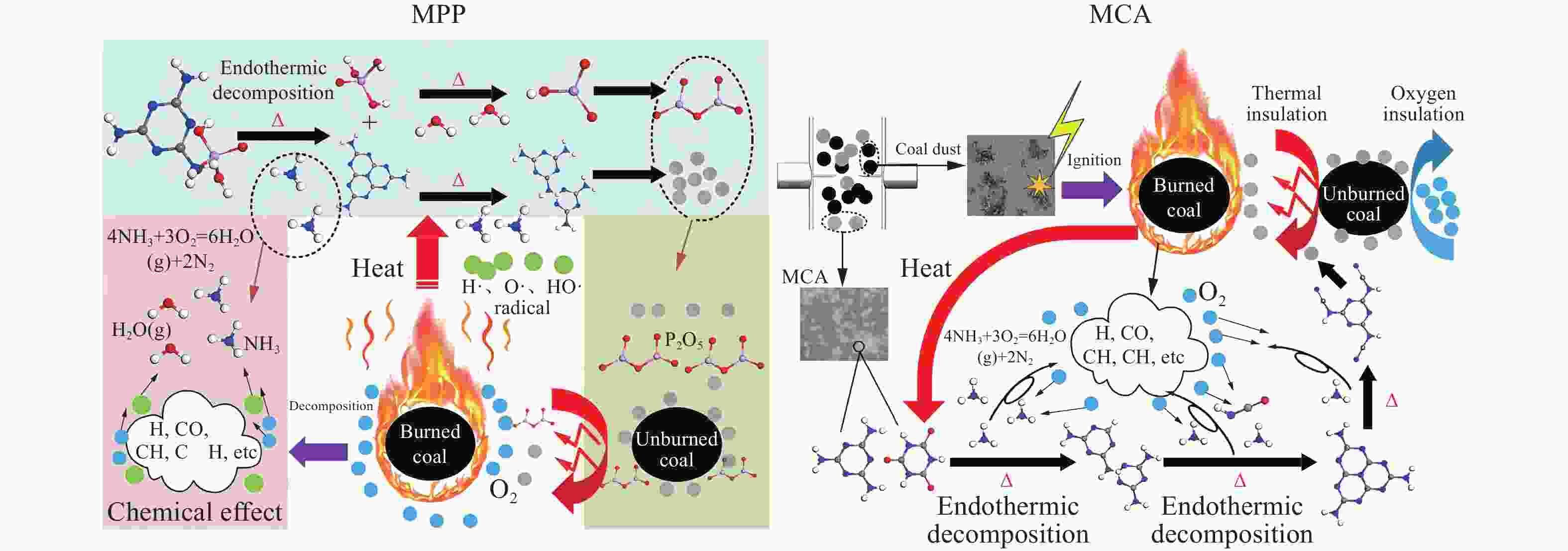 Figure  8.  Mechanisms of MPP and MCA suppressing coal explosion[58]