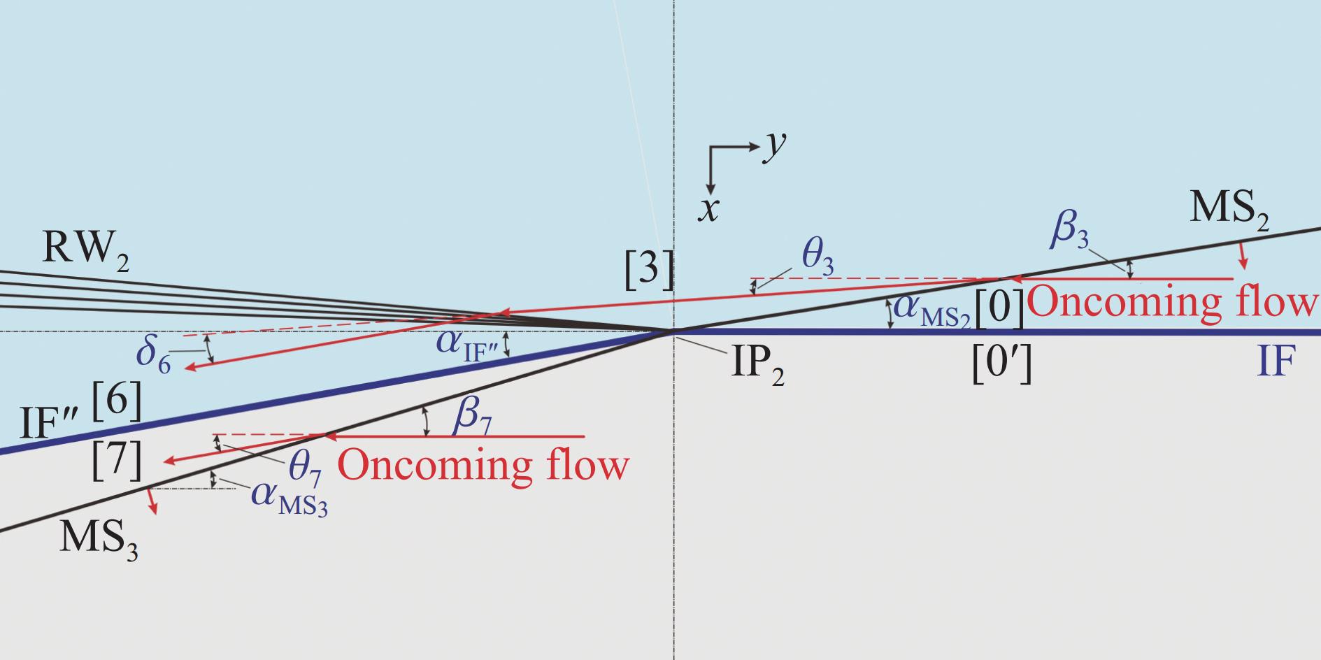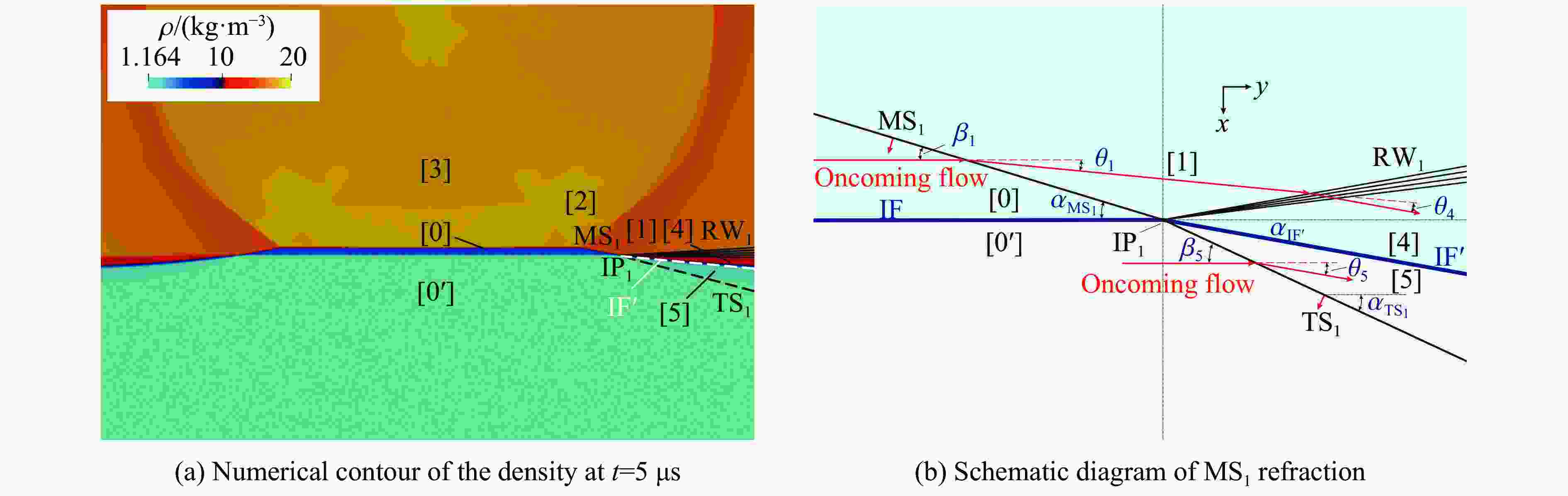 Abstract: The evolution of a planar heavy/light gas interface (SF6/N2) subjected to a perturbed shock wave produced by diffracting a planar incident shock over a rigid cylinder is investigated by numerical and theoretical analysis, particularly focusing on the incident impact stage of Mach reflection wave configuration. While the Mach number of incident planar shock wave is 1.8, numerical schlieren images of the Mach reflection wave over a rigid cylinder are provided, and the wave evolution during the incident impact on the heavy/light interface is quantitatively analyzed. Utilizing the three-shock theory, a theoretical solution describing the refraction process is derived, which accurately predicts the post-refraction shock wave shape, as well as the velocity perturbation and circulation deposition on the interface. Additionally, by drawing shock polar curves and rarefaction wave characteristic lines, the pressure changes and flow deflection across the wave configuration during the incident impact process are straightly described. Both the results of theoretical analysis and numerical simulation indicate that the differences in shock intensity and incident angles within the Mach reflection wave configuration lead to the velocity perturbation on the interface. And the tangential velocity caused by the shock impact results in circulation deposition on the interface. Velocity perturbation and circulation deposition dominate the early evolution of the heavy/light interface. -