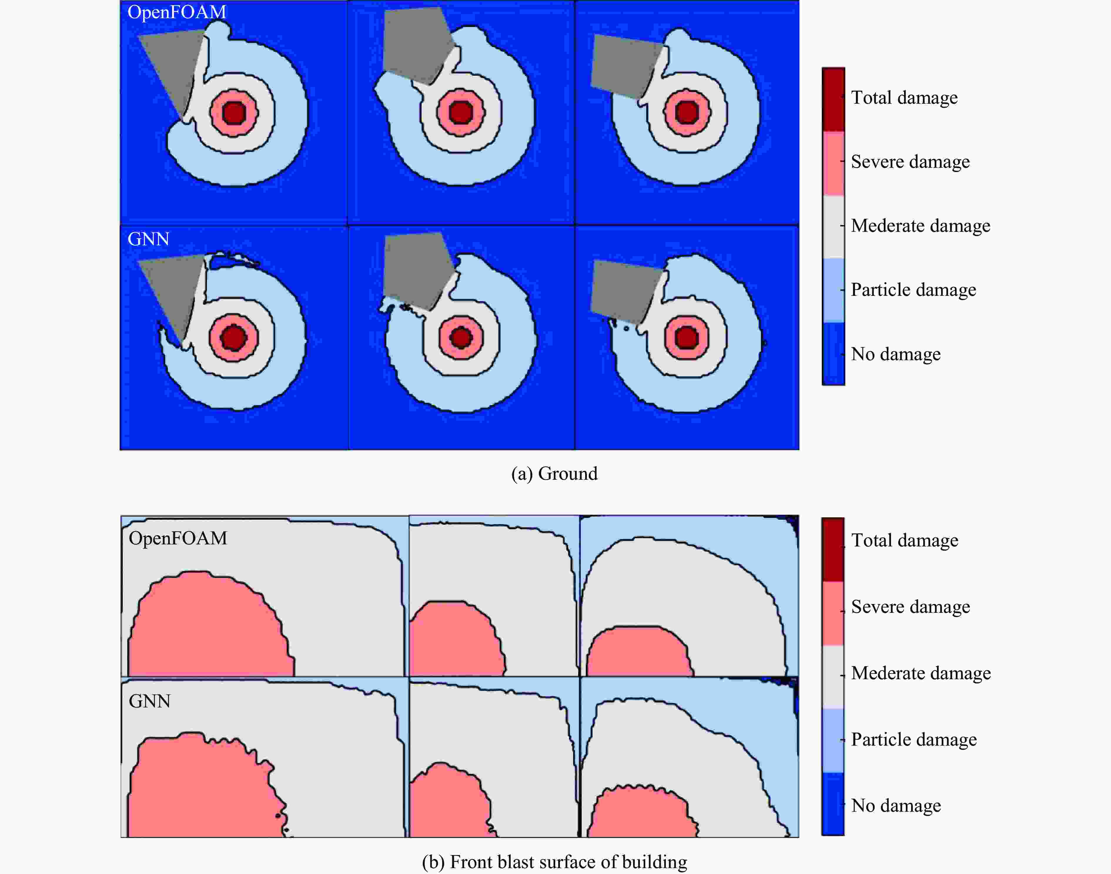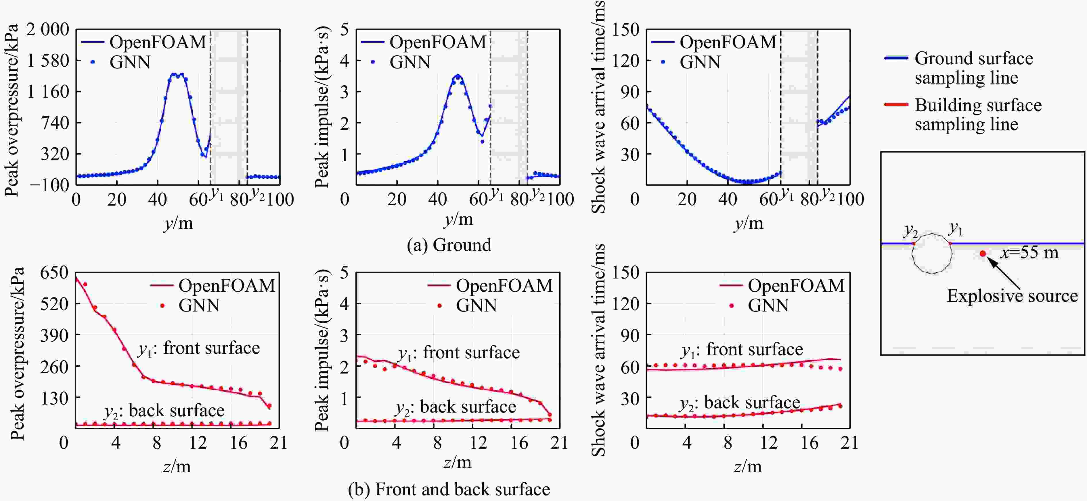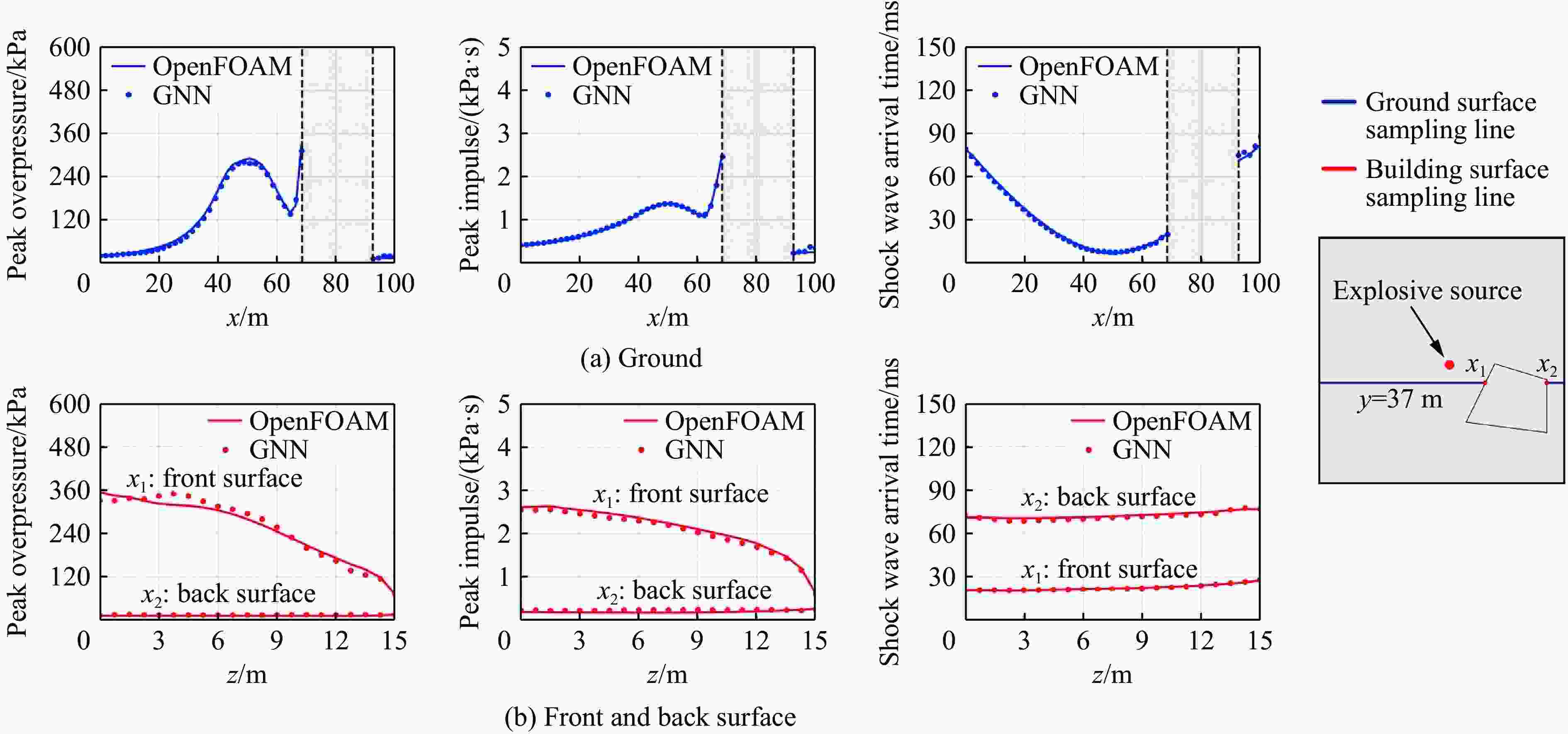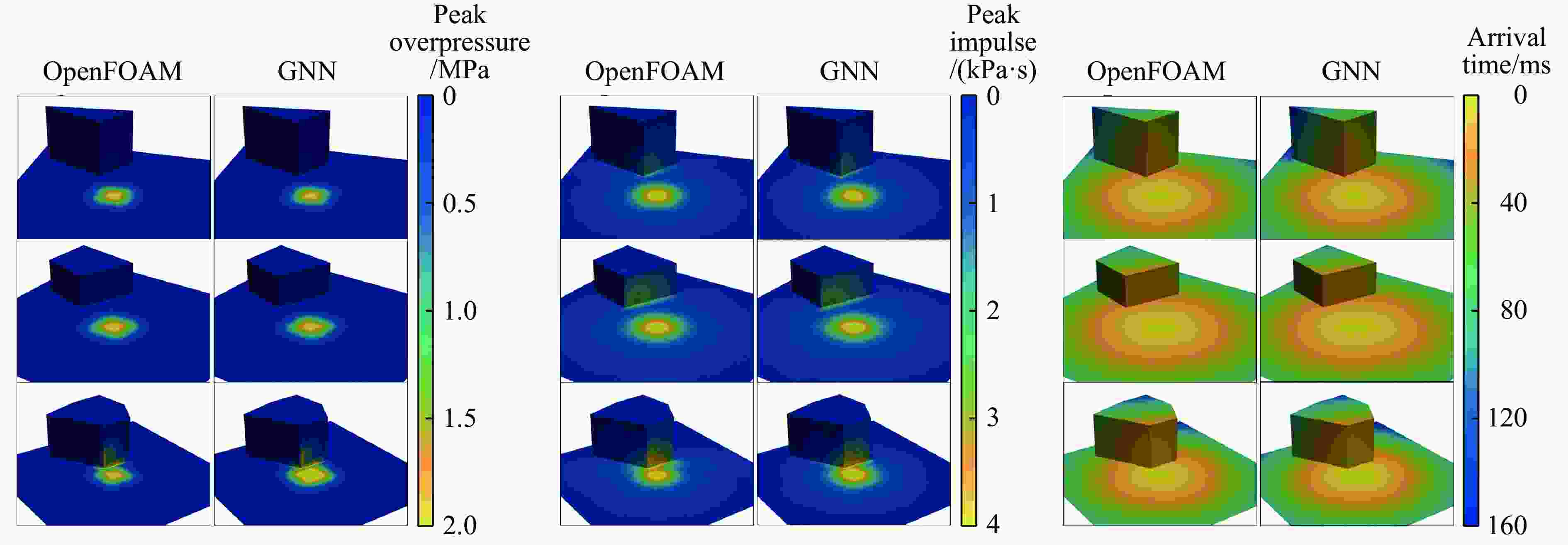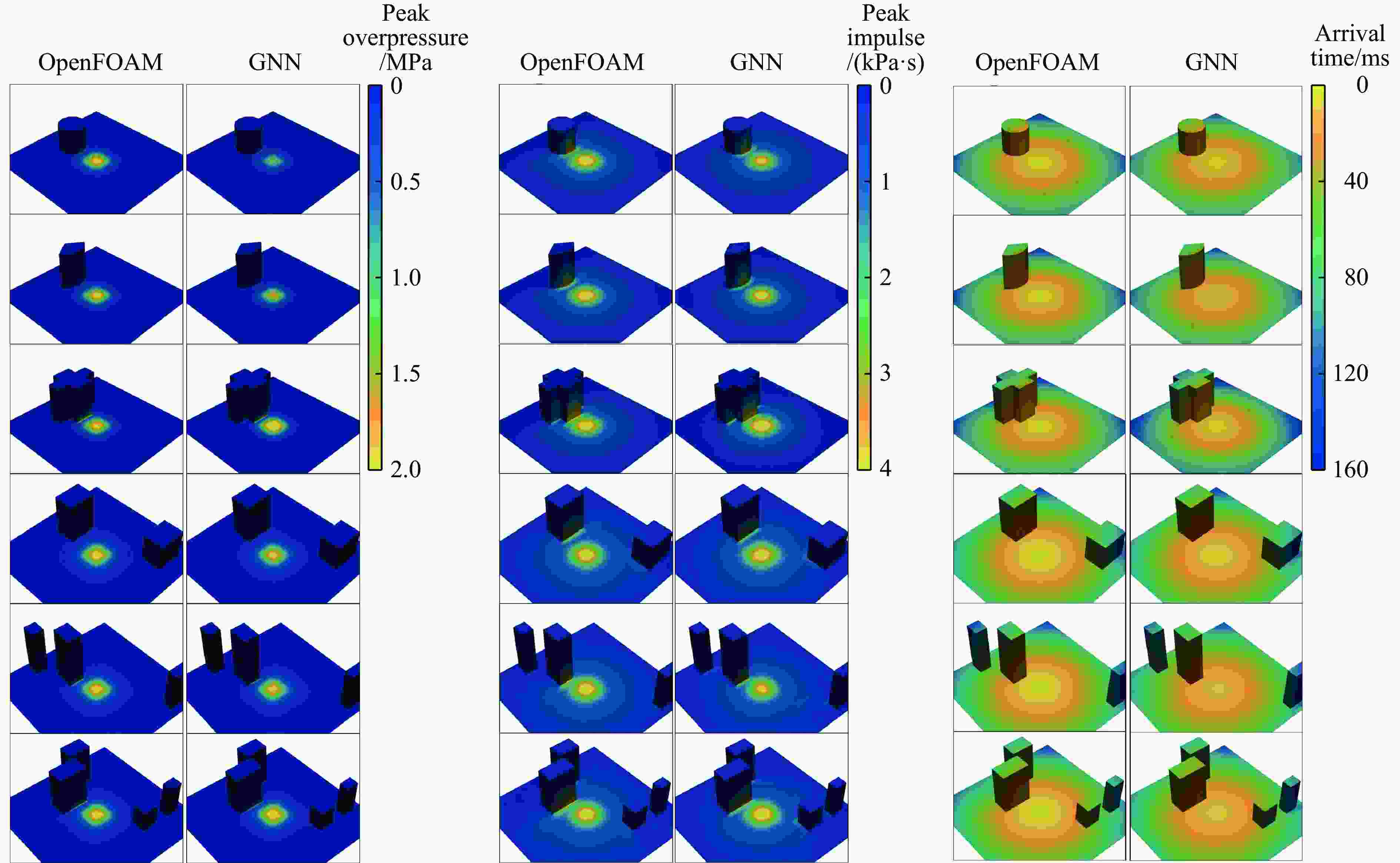 建筑类型 εRSE/% 计算时间/s 峰值超压 峰值冲量 到时 OpenFOM GNN 复杂建筑—十二边形 1.15 2.34 0.85 991 0.15 复杂建筑—扇形 1.51 3.68 1.33 857 0.14 复杂建筑—十字形 1.16 6.69 2.74 984 0.35 建筑群落—2栋 1.95 8.16 2.04 991 0.27 建筑群落—3栋 1.67 7.57 3.07 1450 0.36 建筑群落—4栋 2.61 6.52 1.99 2045 0.51 表 3 城市区域爆炸事件GNN模型预测性能