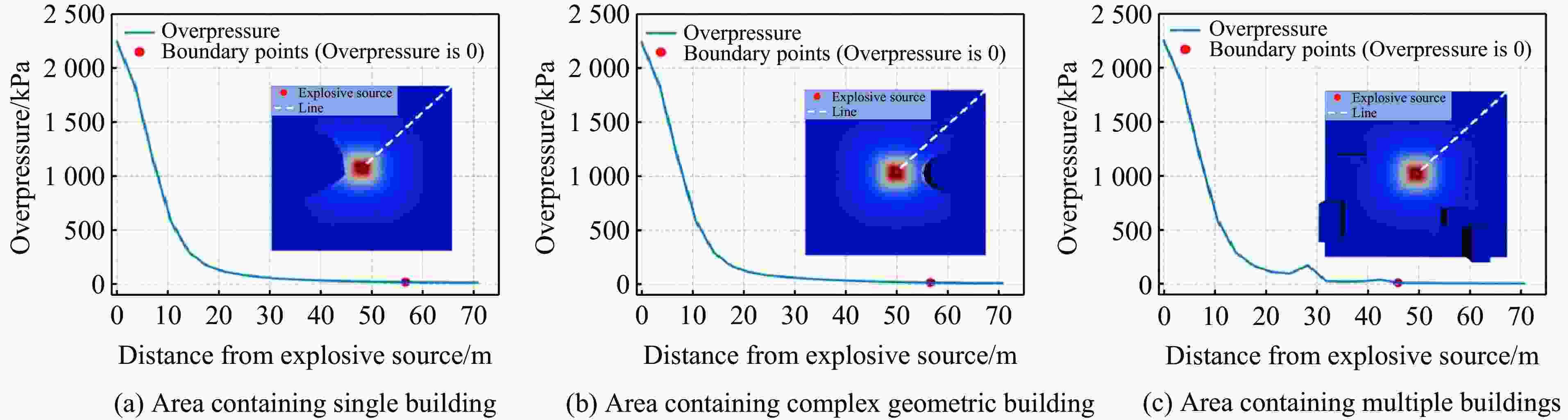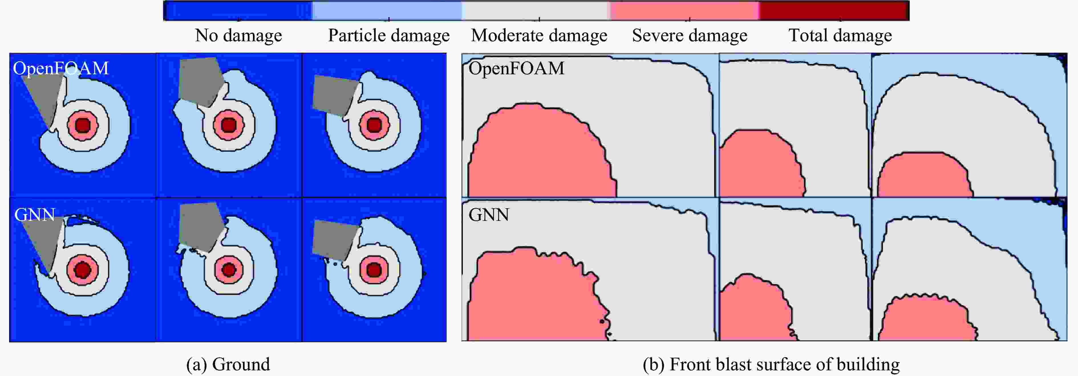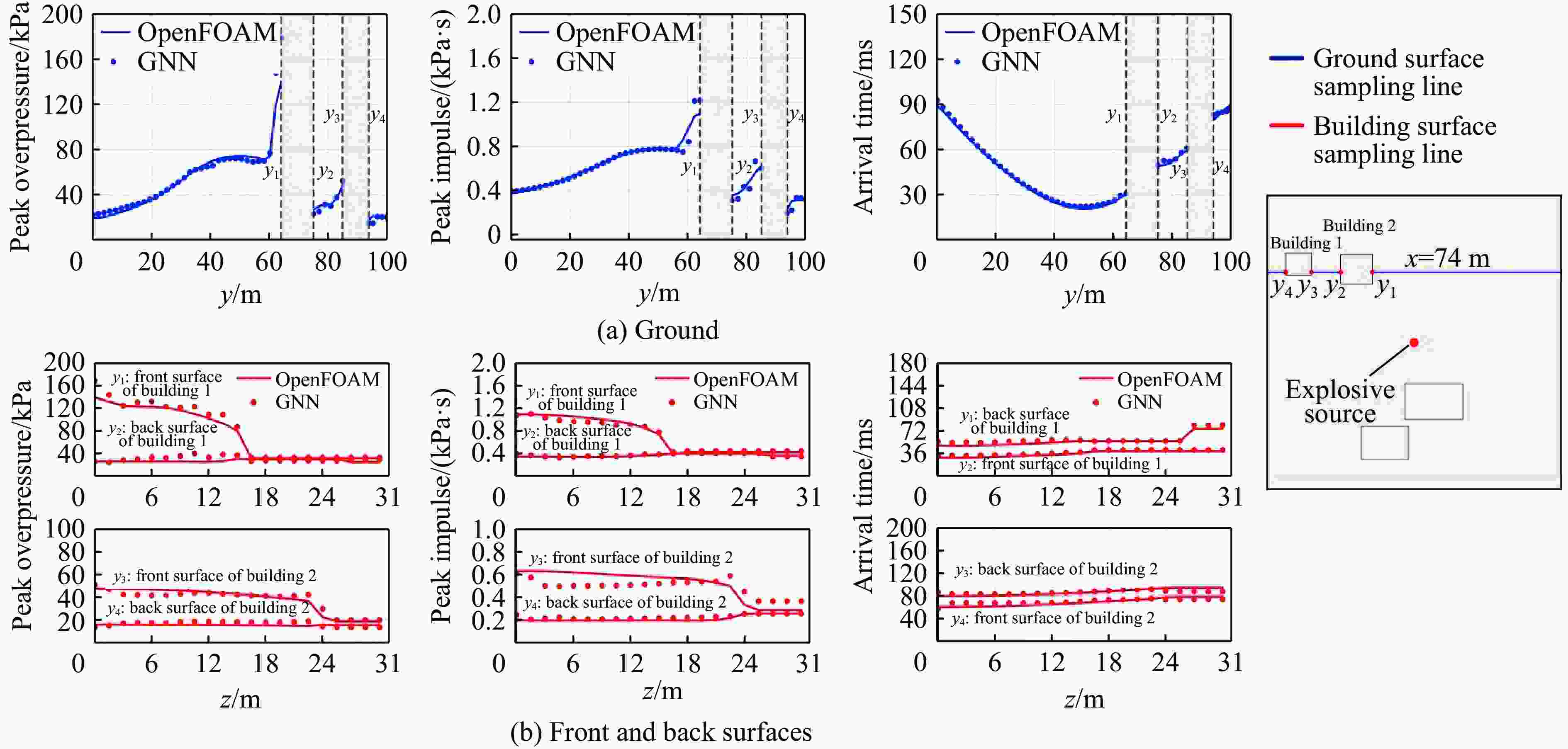 建筑类型 εRSE/% 计算时间/s 峰值超压 峰值冲量 到时 OpenFOAM GNN 复杂建筑—十二边形 1.15 2.34 0.85 991 0.15 复杂建筑—扇形 1.51 3.68 1.33 857 0.14 复杂建筑—十字形 1.16 6.69 2.74 984 0.35 建筑群落—2栋 1.95 8.16 2.04 991 0.27 建筑群落—3栋 1.67 7.57 3.07 1450 0.36 建筑群落—4栋 2.61 6.52 1.99 2045 0.51 表 3 城市区域爆炸事件GNN模型预测性能