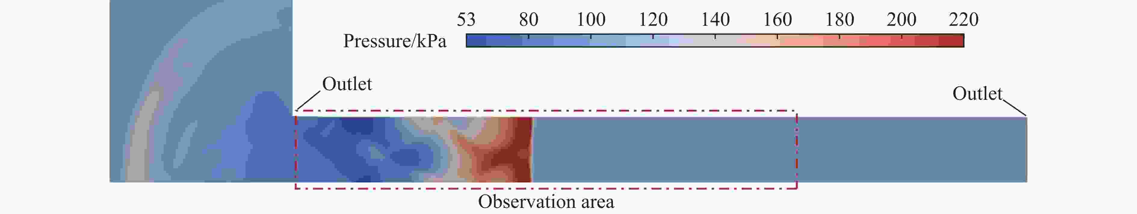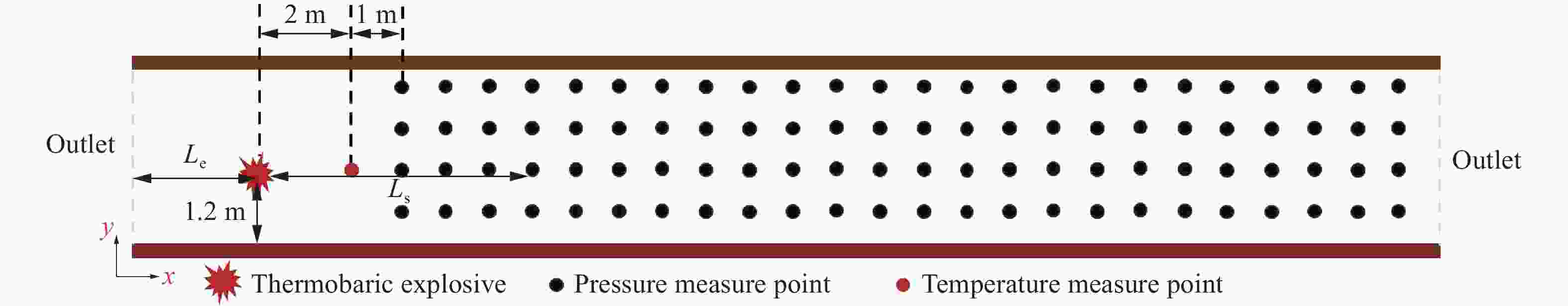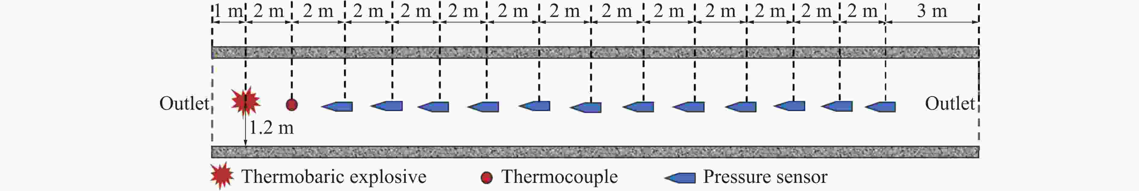摘要: 为研究温压炸药隧道内爆炸冲击波传播规律和火团热效应,基于OpenFOAM开展温压炸药隧道内爆炸数值模拟,与温压炸药隧道内爆炸试验数据对比验证数值模拟精度,研究沿隧道轴线距离、炸药质量对爆炸冲击波传播特性及火团热效应的影响。结果表明:相同装药质量条件下,沿隧道轴线距离大于1/3倍隧道等效圆直径时,爆炸冲击波超压峰值衰减规律和平面波形成距离不随沿隧道轴线距离变化而变化;冲击波平面波形成后,冲量随沿隧道轴线距离的增大先增大后不变。沿隧道轴线相同距离处爆炸,冲击波形成平面波距离随炸药质量的增加而增大;平面波形成后,冲击波超压峰值衰减规律不受装药质量影响,但冲击波冲量随装药质量的增加而增长。受隧道口泄能效应的影响,隧道内爆炸火团总是向近隧道口方向移动,隧道壁面约束使得火团沿隧道轴线垂直方向发展受限;火团轴线方向上出现高温尖端,隧道内轴线方向温度分布具有对称性。进一步建立爆炸火团不同温度轴线方向上传播最大距离与炸药质量的拟合公式,可预测典型温压炸药隧道内爆炸火球不同温度轴线方向上传播最大距离。Abstract: To investigate the propagation characteristics of blast shock waves and the thermal effects of fireballs in tunnel explosions involving thermobaric explosives, numerical simulations were conducted using OpenFOAM. The simulation accuracy was validated through comparative analysis with experimental data from tunnel explosion tests. The effects of axial distance along the tunnel and explosive mass on shock wave propagation characteristics and fireball thermal effects were systematically studied. The results demonstrated that under identical charge mass conditions when the axial distance exceeds 1/3 times the equivalent tunnel diameter, the attenuation law of shock wave overpressure peak and planar wave formation distance remain independent of axial position. After planar wave formation, the impulse increases with axial distance before stabilizing. At the same axial explosion distances, the planar wave formation distance increases with explosive mass. Post planar wave formation, the attenuation pattern of the shock wave overpressure peak remains unaffected by charge mass. In contrast, the impulse exhibits a growth trend proportional to the increase in charge mass. Under the influence of the tunnel portal energy dissipation effect (tunnel effect), explosion-induced fireballs exhibit a consistent propagation tendency toward the proximal tunnel portal. The confinement imposed by tunnel walls restricts the lateral expansion of the fireball perpendicular to the tunnel axis while facilitating the formation of a high-temperature tip along the longitudinal axis. Especially, the temperature distribution along the tunnel axis maintains axial symmetry despite directional propagation biases. A fitting formula was established to characterize the relationship between the maximum axial propagation distance of explosion fireballs at different temperatures and the explosive mass, enabling the prediction of axial spread limits for fireballs at specific temperatures in typical thermobaric explosive detonations within tunnel-confined environments.