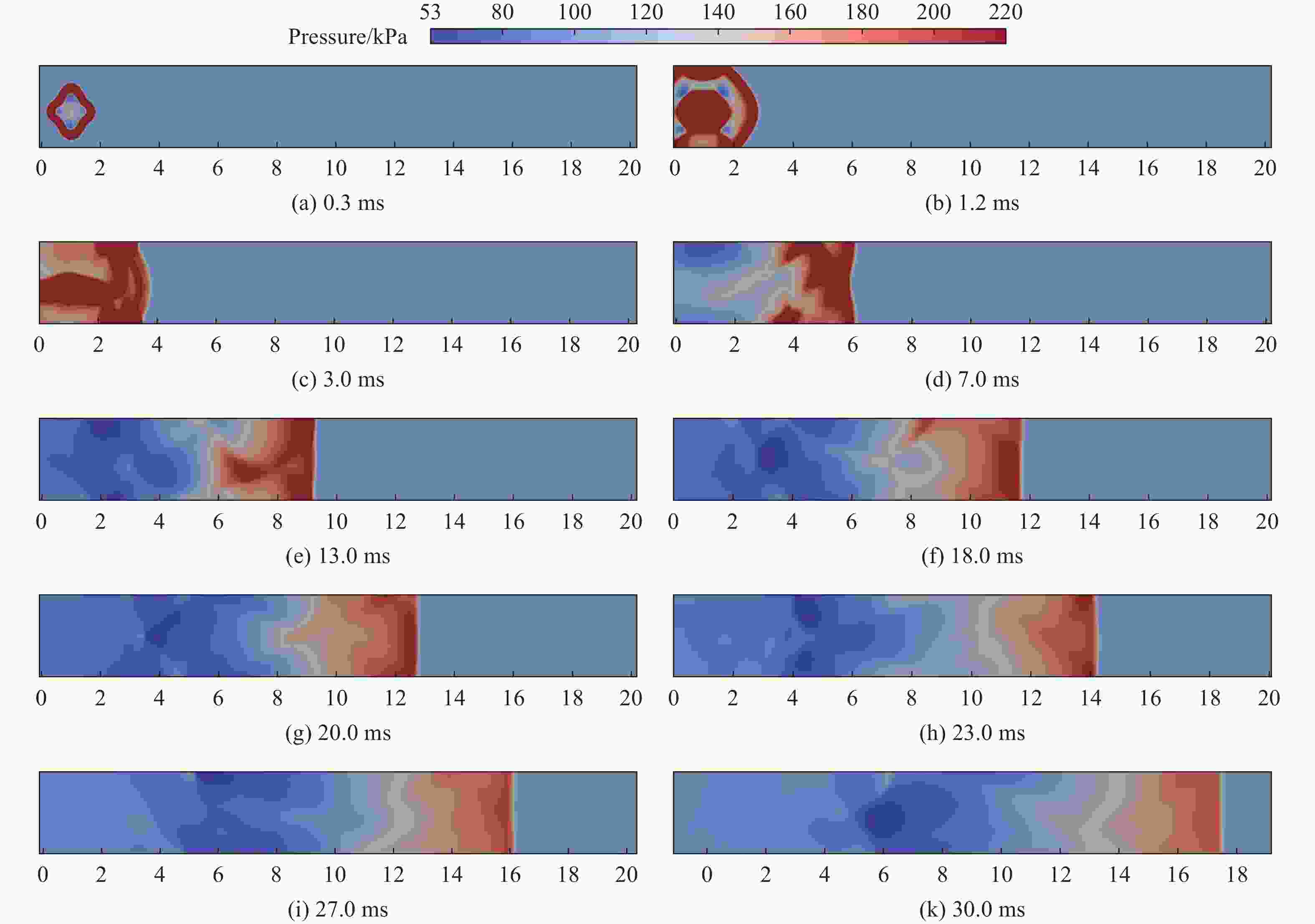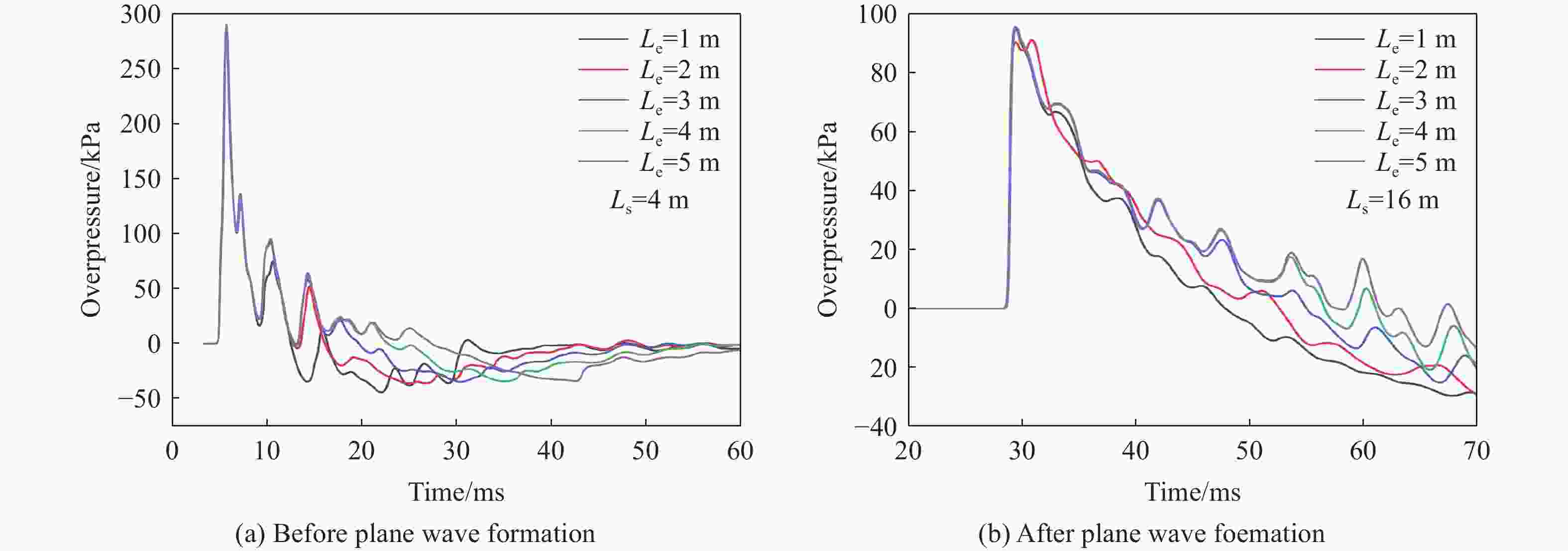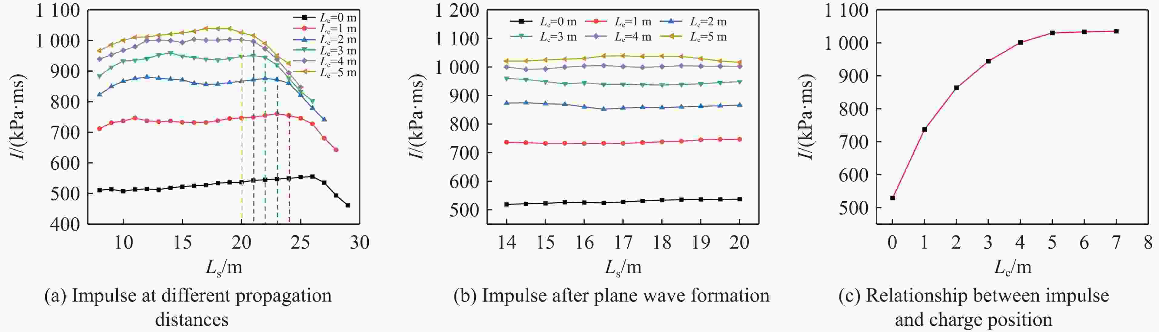 摘要: 为研究温压炸药隧道内爆炸冲击波传播规律和火团热效应,基于OpenFOAM开展温压炸药隧道内爆炸数值模拟,与温压炸药隧道内爆炸试验数据对比验证数值模拟精度,研究沿隧道轴线距离、炸药质量对爆炸冲击波传播特性及火团热效应的影响。结果表明:相同装药质量条件下,沿隧道轴线距离大于1/3倍隧道等效圆直径时,爆炸冲击波超压峰值衰减规律和平面波形成距离不随沿隧道轴线距离变化而变化;冲击波平面波形成后,冲量随沿隧道轴线距离的增大先增大后不变。沿隧道轴线相同距离处爆炸,冲击波形成平面波距离随炸药质量的增加而增大;平面波形成后,冲击波超压峰值衰减规律不受装药质量影响,但冲击波冲量随装药质量的增加而增长。受隧道口泄能效应的影响,隧道内爆炸火团总是向近隧道口方向移动,隧道壁面约束使得火团沿隧道轴线垂直方向发展受限;火团轴线方向上出现高温尖端,隧道内轴线方向温度分布具有对称性。进一步建立爆炸火团不同温度轴线方向上传播最大距离与炸药质量的拟合公式,可预测典型温压炸药隧道内爆炸火球不同温度轴线方向上传播最大距离。Abstract: To investigate the propagation characteristics of blast shock waves and the thermal effects of fireballs in tunnel explosions involving thermobaric explosives, numerical simulations were conducted using OpenFOAM. The simulation accuracy was validated through comparative analysis with experimental data from tunnel explosion tests. The effects of axial distance along the tunnel and explosive mass on shock wave propagation characteristics and fireball thermal effects were systematically studied. The results demonstrated that under identical charge mass conditions when the axial distance exceeds 1/3 times the equivalent tunnel diameter, the attenuation law of shock wave overpressure peak and planar wave formation distance remain independent of axial position. After planar wave formation, the impulse increases with axial distance before stabilizing. At the same axial explosion distances, the planar wave formation distance increases with explosive mass. Post planar wave formation, the attenuation pattern of the shock wave overpressure peak remains unaffected by charge mass. In contrast, the impulse exhibits a growth trend proportional to the increase in charge mass. Under the influence of the tunnel portal energy dissipation effect (tunnel effect), explosion-induced fireballs exhibit a consistent propagation tendency toward the proximal tunnel portal. The confinement imposed by tunnel walls restricts the lateral expansion of the fireball perpendicular to the tunnel axis while facilitating the formation of a high-temperature tip along the longitudinal axis. Especially, the temperature distribution along the tunnel axis maintains axial symmetry despite directional propagation biases. A fitting formula was established to characterize the relationship between the maximum axial propagation distance of explosion fireballs at different temperatures and the explosive mass, enabling the prediction of axial spread limits for fireballs at specific temperatures in typical thermobaric explosive detonations within tunnel-confined environments.