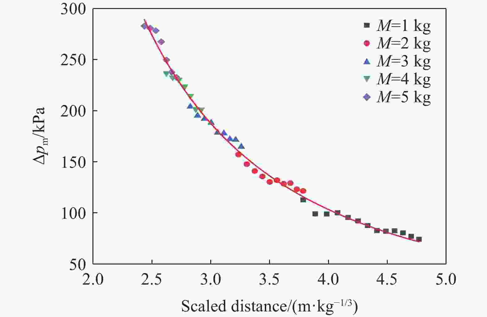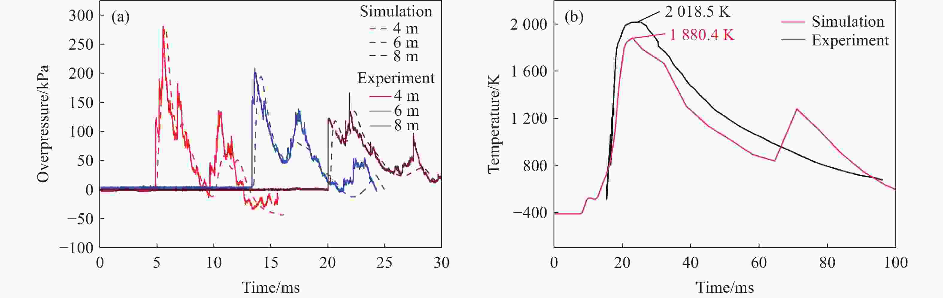 A/GPa B/GPa ω R1 R2 E/GPa EAl/(kJ∙g−1) rAl/(kJ∙g−1∙s−1) 639 4.95 0.33 4.2 1.1 13.3 3.3e6 930 表 2 冲击波最大超压峰值和冲量的数值模拟结果与试验实测结果的对比
