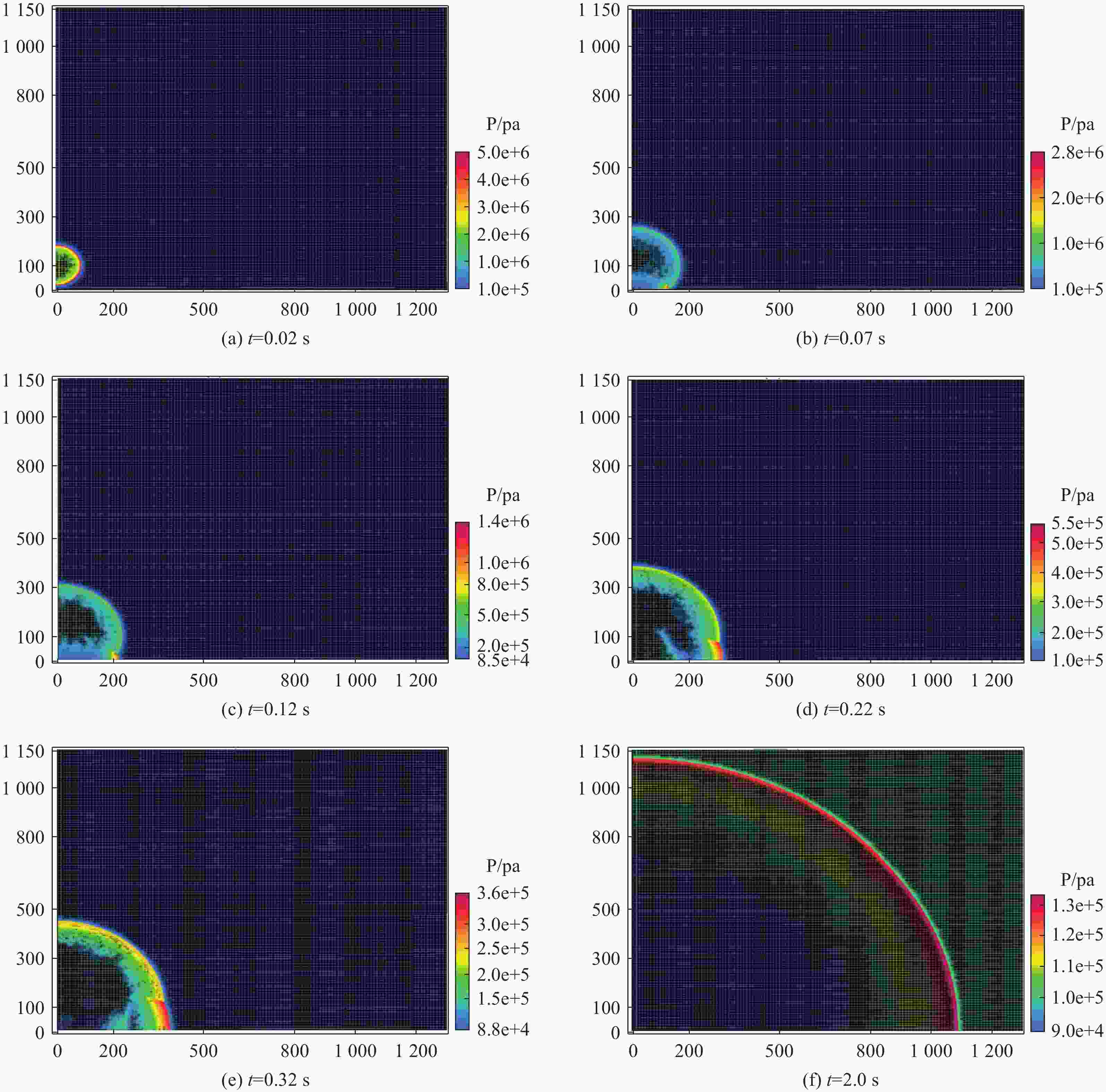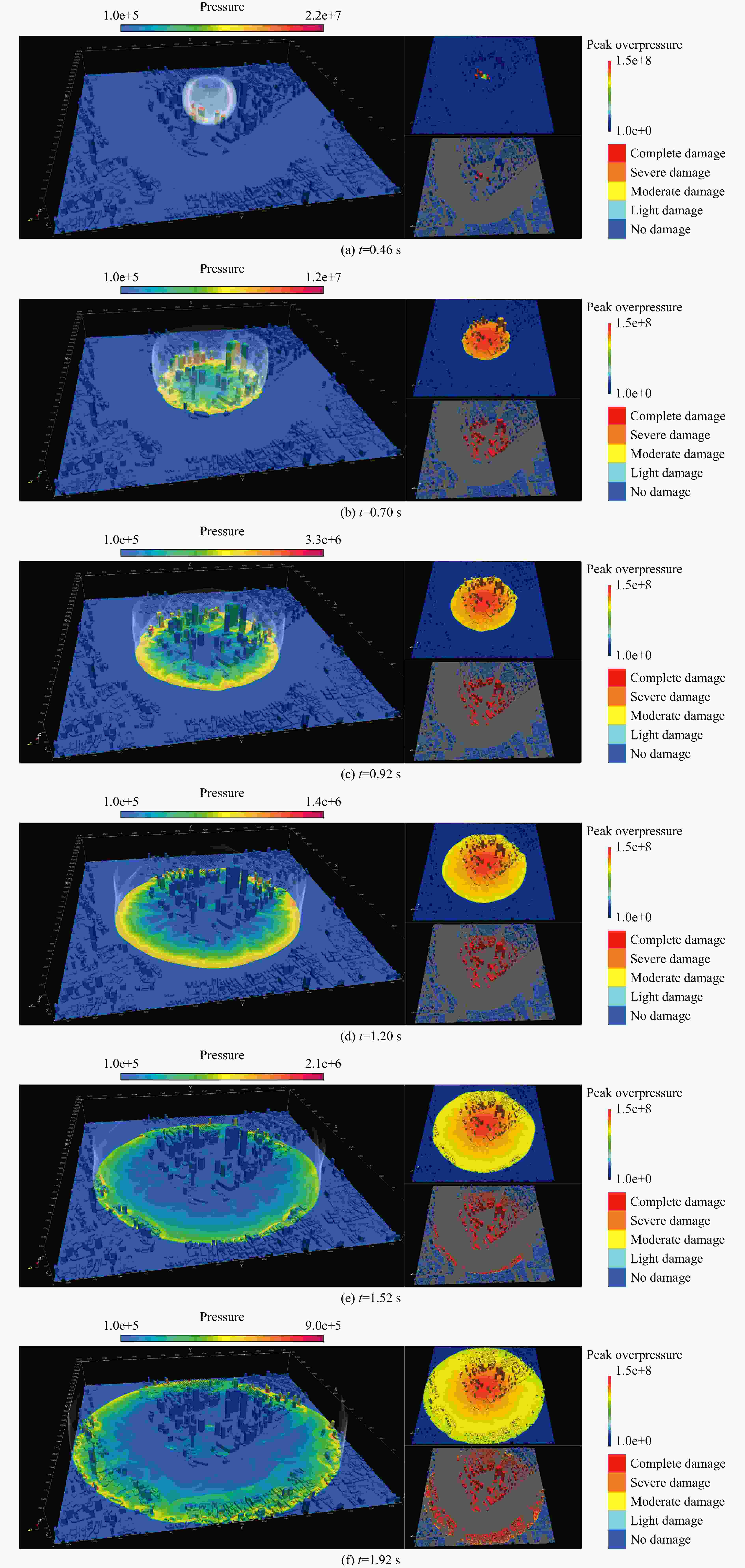 摘要: 为实现大尺度复杂空间范围内强爆炸冲击波的高效数值模拟。基于扩散界面多组分模型,建立适用于极端条件、任意多介质相互作用的可压缩多相流数值方法,并结合人工智能技术,提出一种具有MUSCL-THINC-BVD特征的且兼具鲁棒性、低耗散、高效率重构方法。该方法能够在激波、接触间断和物质界面等关键区域自适应选择最优重构方式,实现全局数值耗散最小化,同时较传统BVD(boundary variation diminishing)框架下的格式具有更高的计算效率。进一步结合全球地理信息系统,发展了自动化几何建模与网格剖分技术、网格自适应及大规模并行计算方法,从而能够高效处理网格规模达数十亿、压力范围覆盖103~1015 Pa、模拟区域不小于10 km的大尺度复杂城市环境中的强爆炸冲击波问题。通过对复杂地形及真实城市建筑条件下冲击波传播过程的完整数值模拟,验证了数值方法可靠性。Abstract: A compressible multiphase flow numerical scheme, induced from the multi- component diffuse interface model with arbitrary number of materials, is established to simulate the interaction between distinct materials under extreme conditions. A robust, low dissipation and high efficiency reconstruction method, the MTBVD (muscl thinc boundary variation diminishing), is proposed with the aid of artificial intelligence technology, which can adaptively select the most suitable reconstruction method in the essential regions such as shock wave, contact discontinuity and material interface, and can achieve the minimum global numerical dissipation. Furthermore, it has a higher computational efficiency than the traditional BVD (boundary variation diminishing) scheme. The automatic geometric modeling and grid meshing based on global geographic information system, adaptive mesh refinement and large-scale parallel computing method are established to realize the whole numerical simulation of shock wave propagation in complex terrain and real urban environments. Our schemes allows for the effective simulation of intense blast wave scenarios on a large scale within intricate urban settings, employing billions of meshes, a pressure spectrum ranging from 103 Pa to 1015 Pa, and a minimum spacing size of 10 km. We have conducted multiple numerical simulations that demonstrate the propagation of blast waves through complex landscapes and urban areas, which corroborate our methodologies.