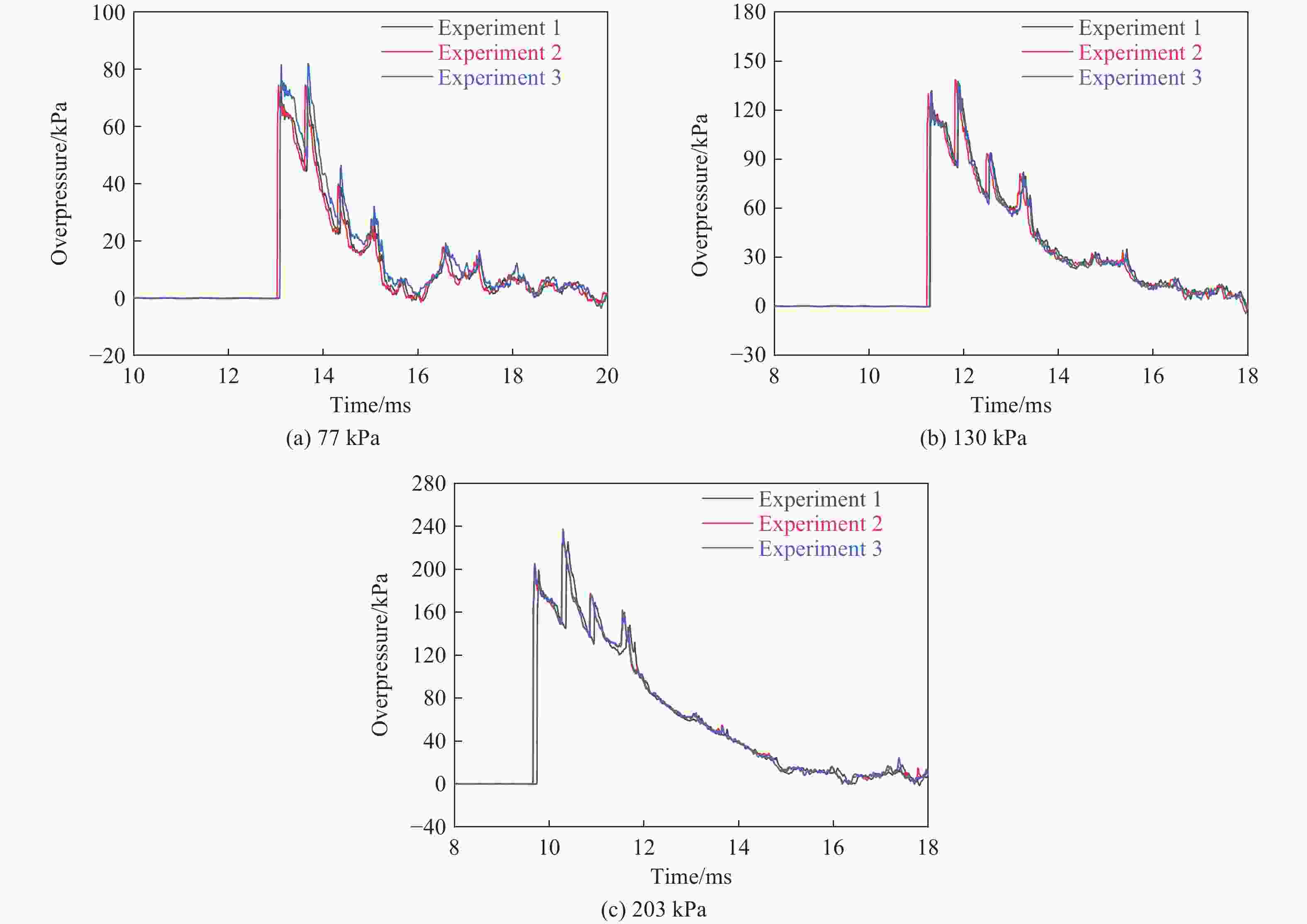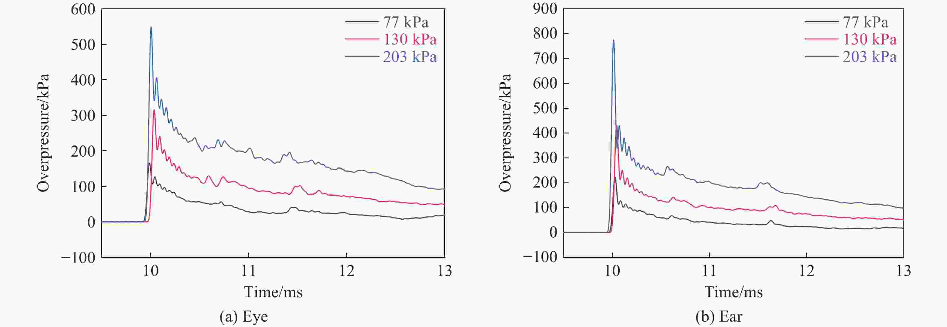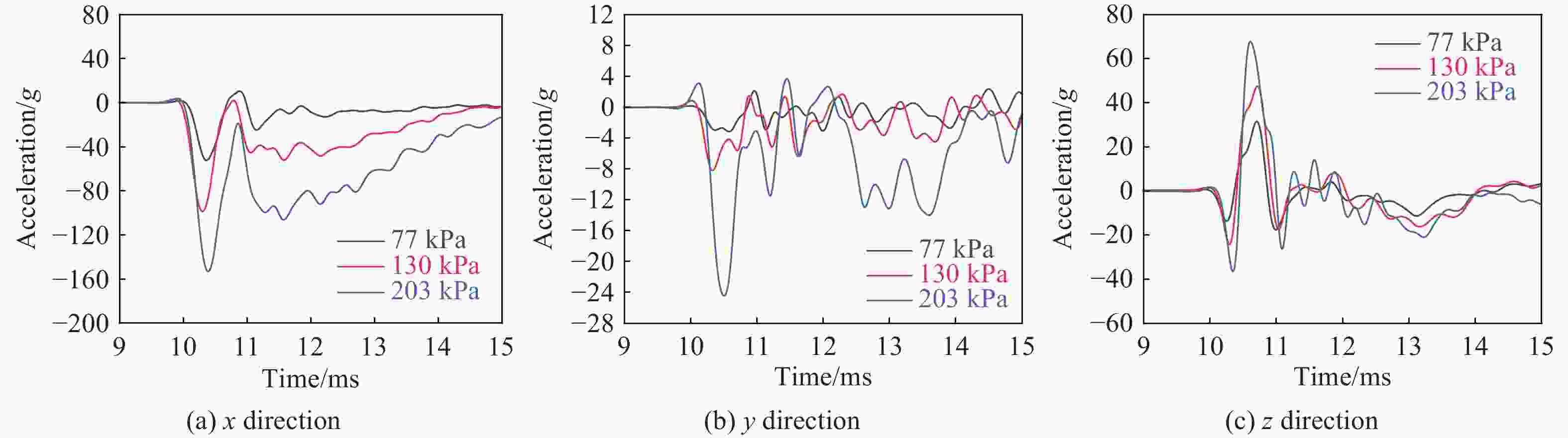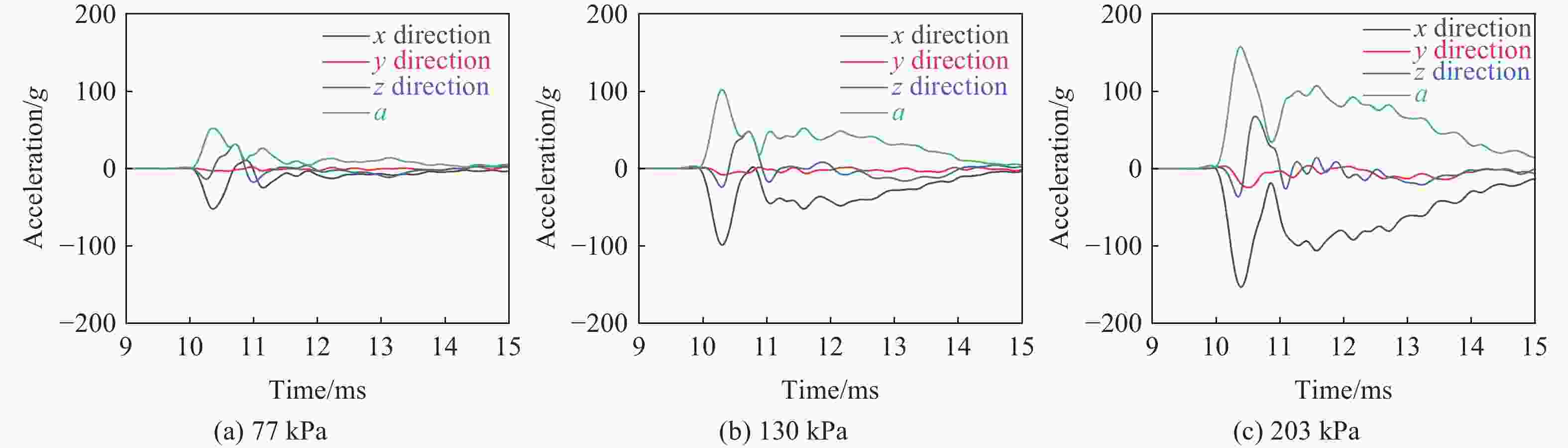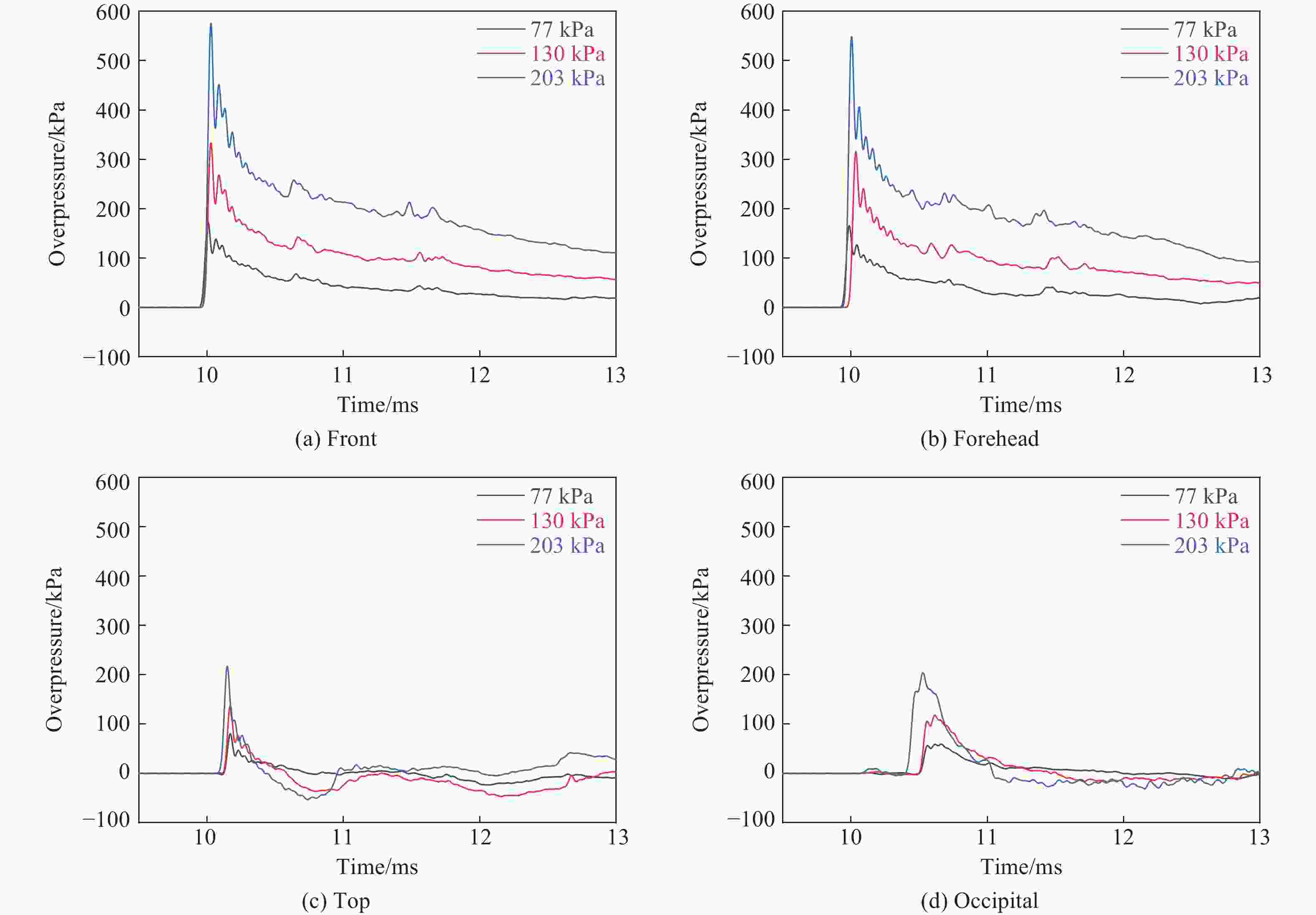冲击压力/kPa 反射系数 前部 前额 头顶 枕部 眼部 耳朵 77 2.30±0.06 2.20±0.05 1.10±0.01 0.80±0.02 3.00±0.08 2.60±0.08 130 2.60±0.04 2.40±0.03 1.00±0.01 0.90±0.02 3.30±0.04 2.80±0.08 203 2.80±0.01 2.70±0.02 1.00±0.05 1.00±0.01 3.80±0.04 3.00±0.04 表 3 不同强冲击环境下模型头部的质心加速度最大值
