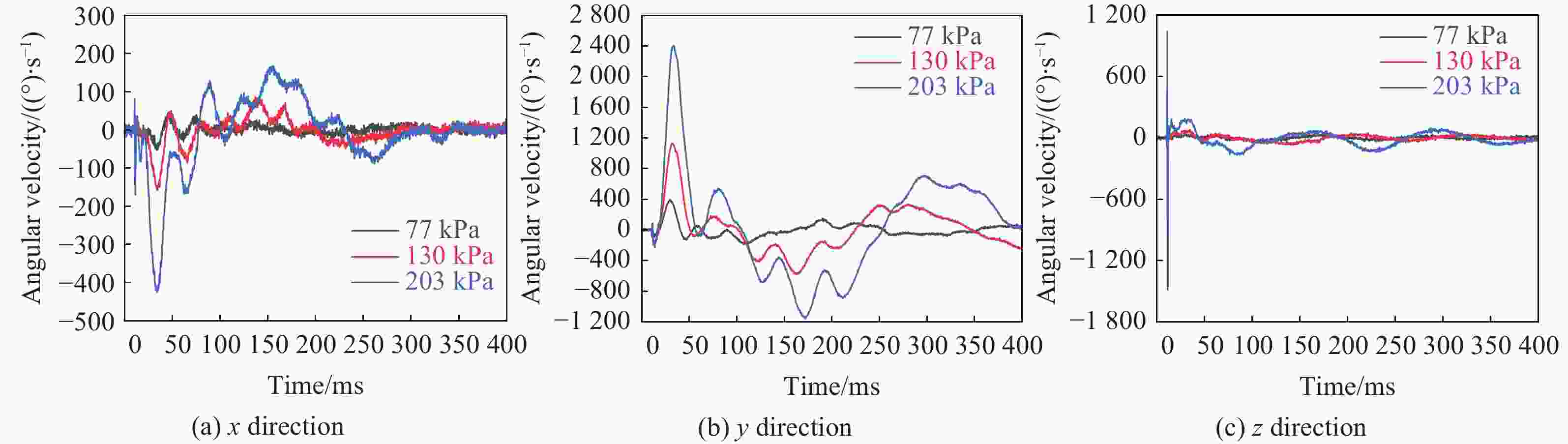 冲击压力/kPa 头部质心加速度最大值/g x方向 y方向 z方向 合成加速度 77 −54.40±3.77 −3.30±0.25 32.60±1.32 54.60±3.69 130 −99.30±1.03 −8.40±0.18 47.50±0.37 102.00±1.72 203 −153.50±0.42 −230±1.31 69.30±2.68 161.50±6.36 表 4 不同强冲击环境下模型头部的质心角速度和旋转角度最大值