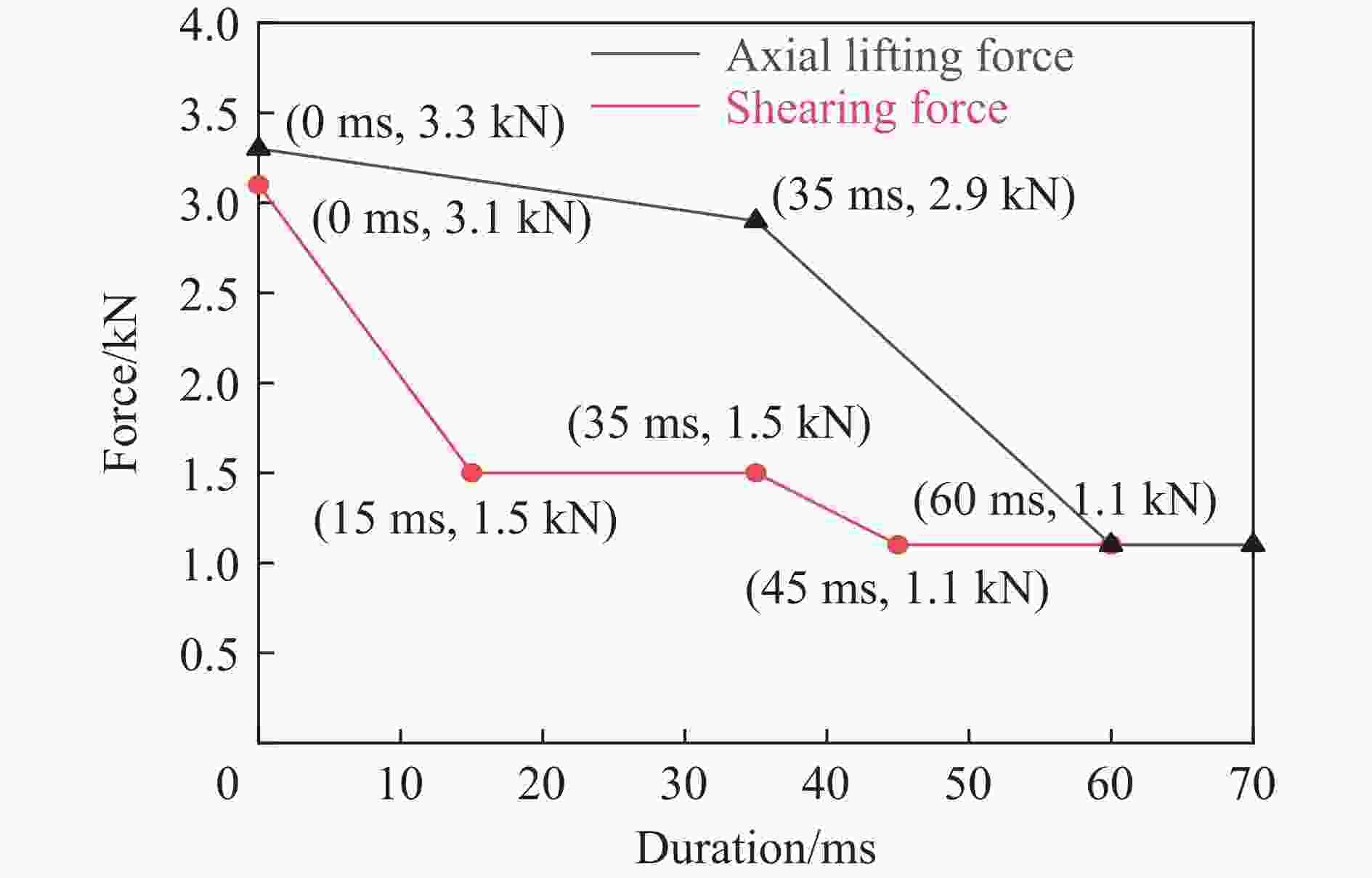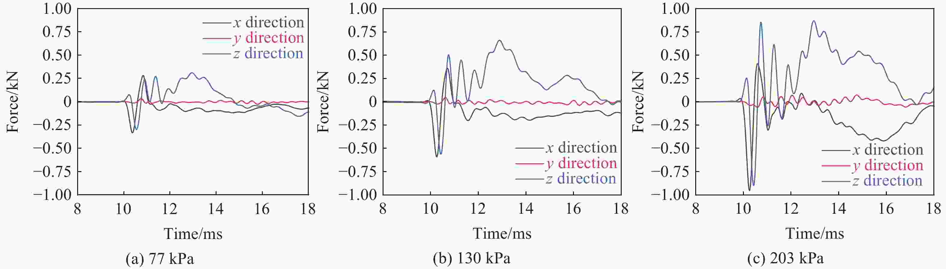 冲击压力/kPa a/g h15 b Fx/N Fz/N My/(N·m) 77 54.60±3.69 6.00±1.06 0.130±0.014 340±22 340±37 15.250±2.076 130 102.00±1.72 44.50±0.98 0.360±0.006 600±5 660±14 32.140±0.703 203 161.50±6.36 221.70±20.87 0.720±0.037 950±2 970±78 60.240±2.465 -